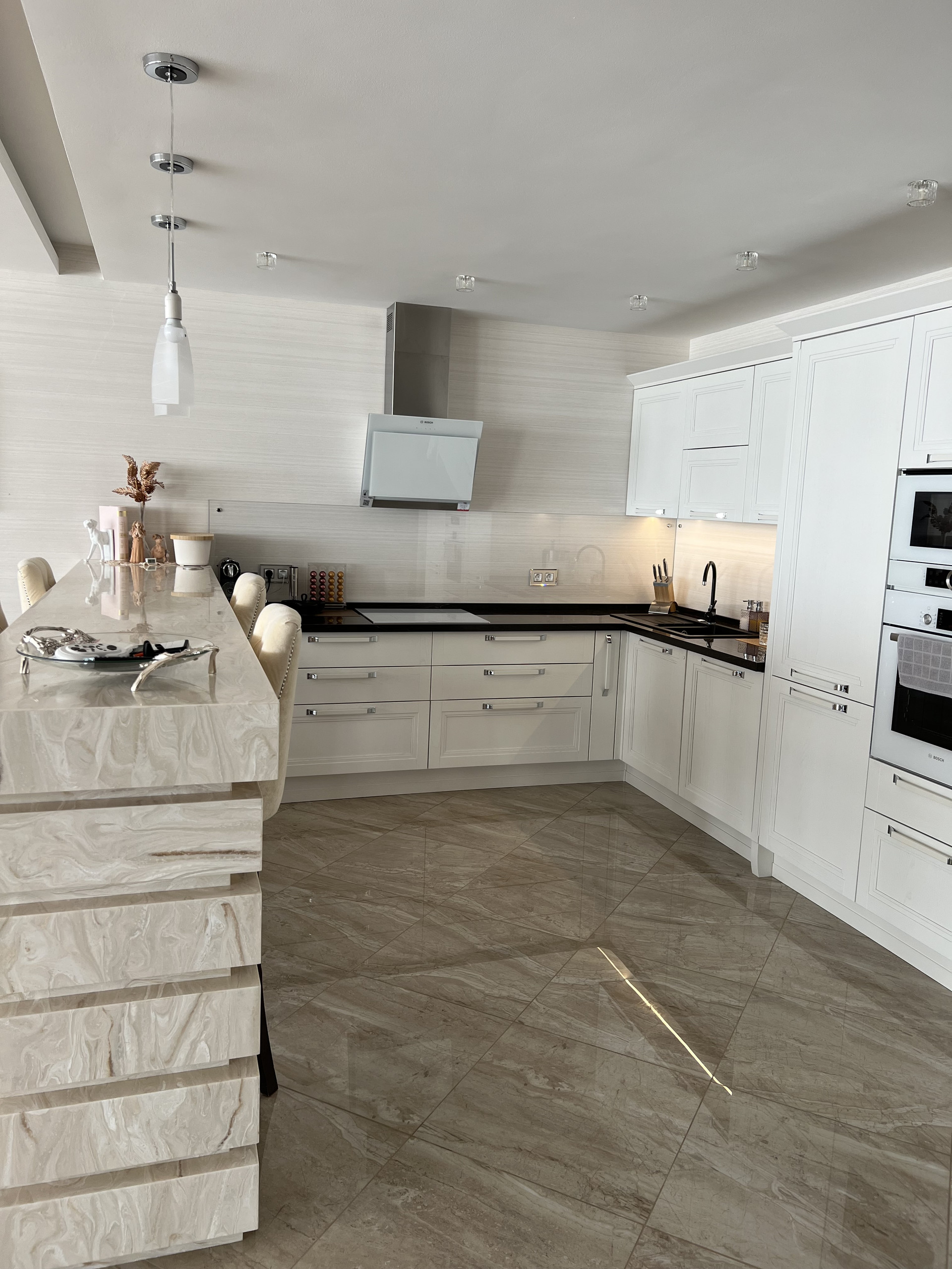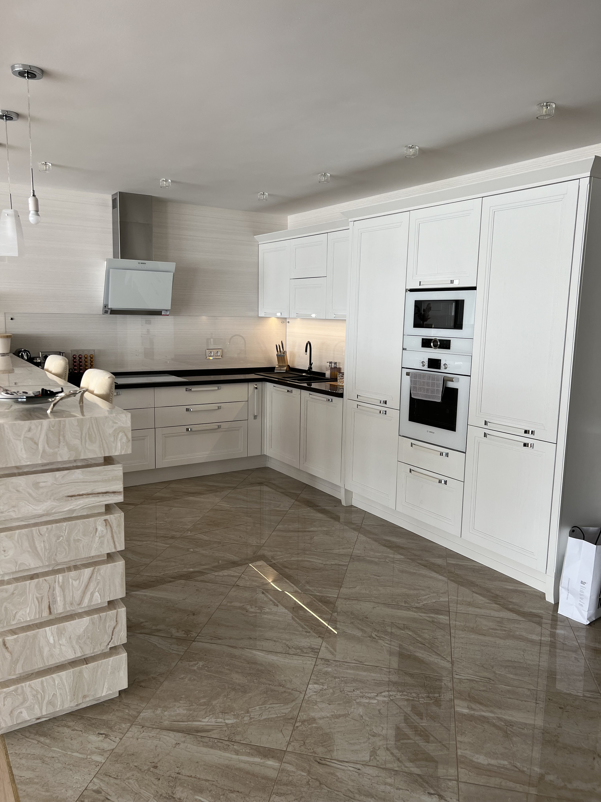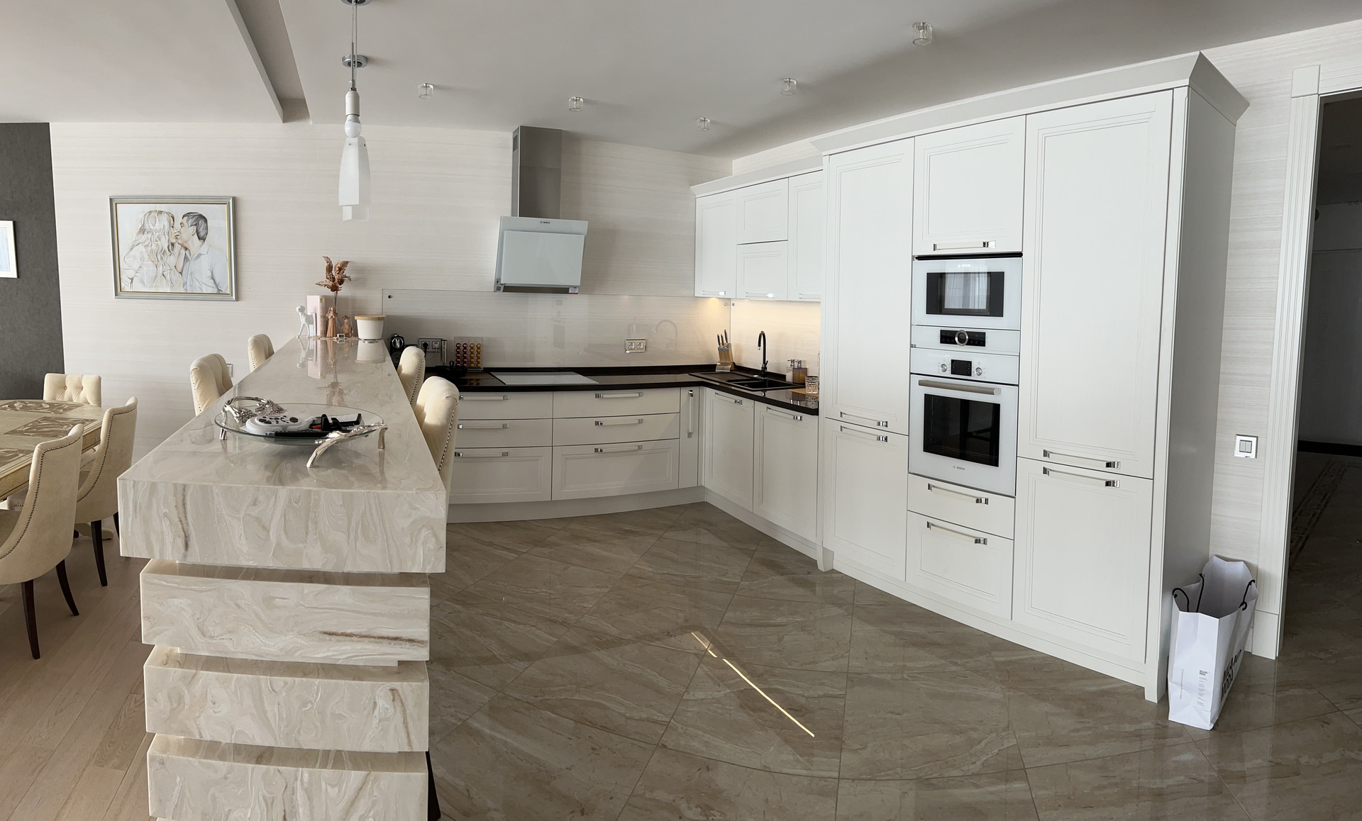 Далее просторная гостиная с кухней и обеденной зоной. На кухне заказаны итальянские фасады из натурального дерева в английском стиле, все доводчики blum, техника фирмы Bosh( варочная плита, духовой шкаф, микроволновая печь, посудомойка, вытяжка и два холодильника)