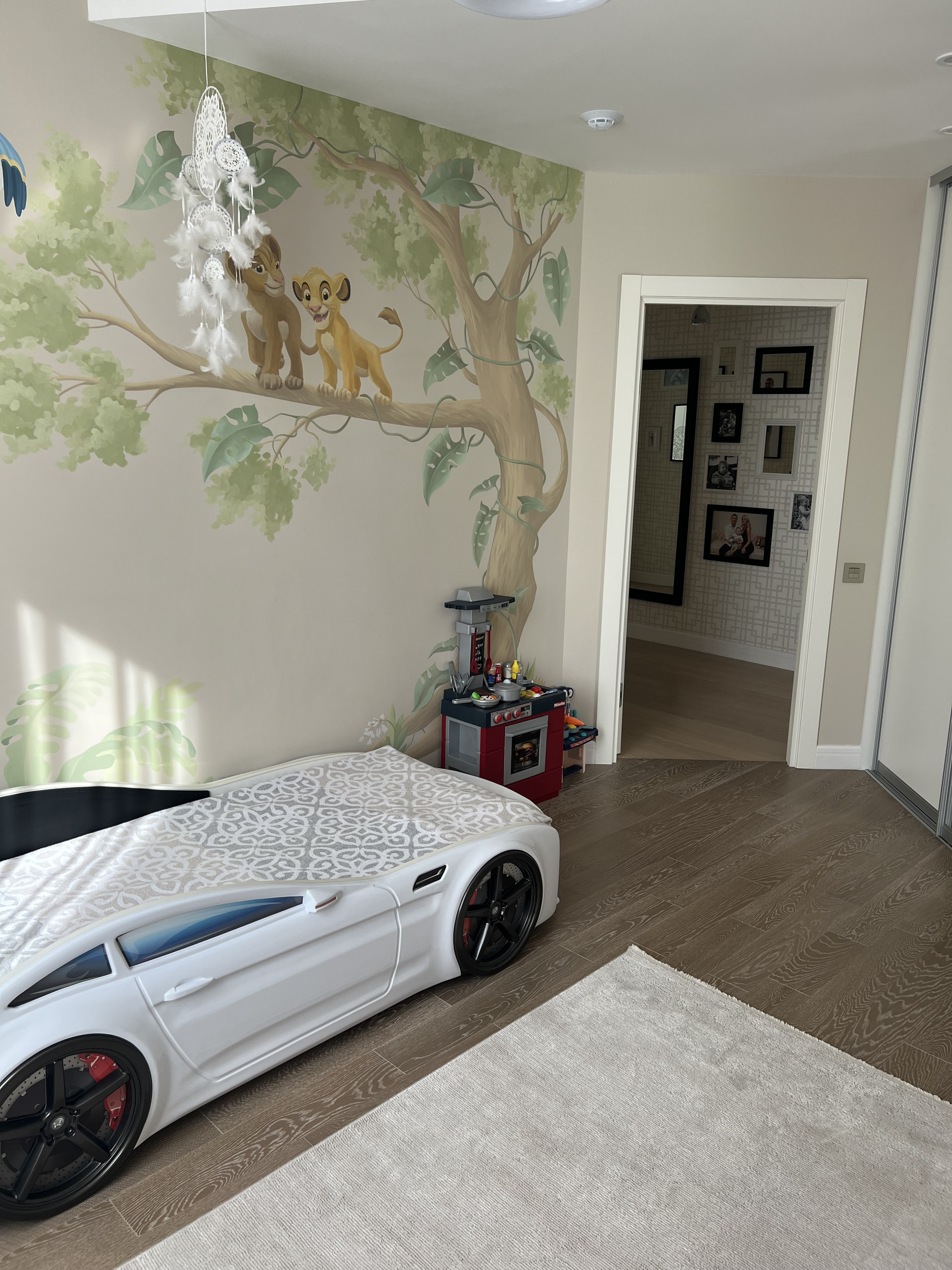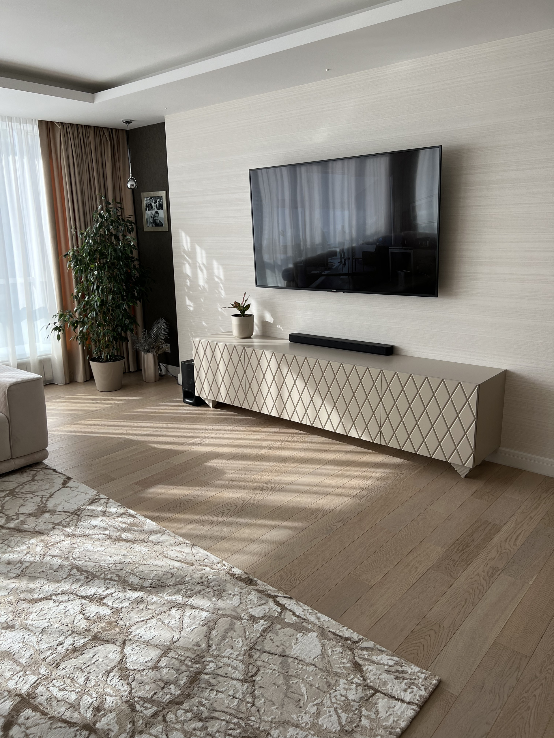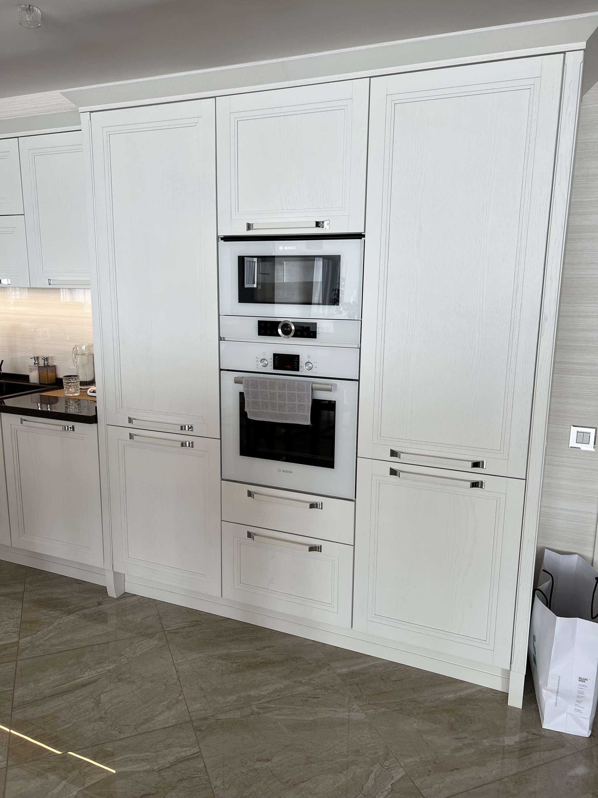 Далее просторная гостиная с кухней и обеденной зоной. На кухне заказаны итальянские фасады из натурального дерева в английском стиле, все доводчики blum, техника фирмы Bosh( варочная плита, духовой шкаф, микроволновая печь, посудомойка, вытяжка и два холодильника)