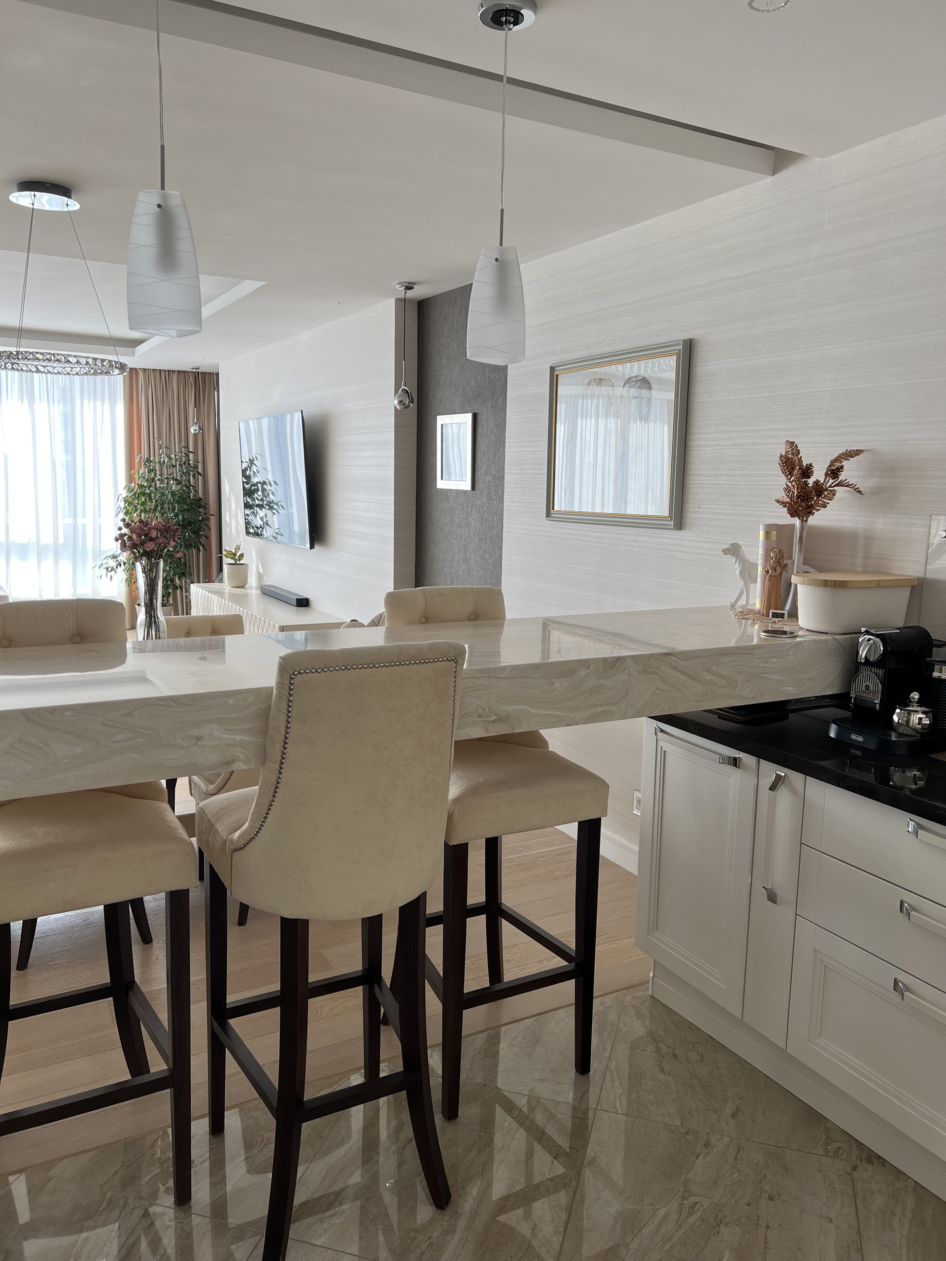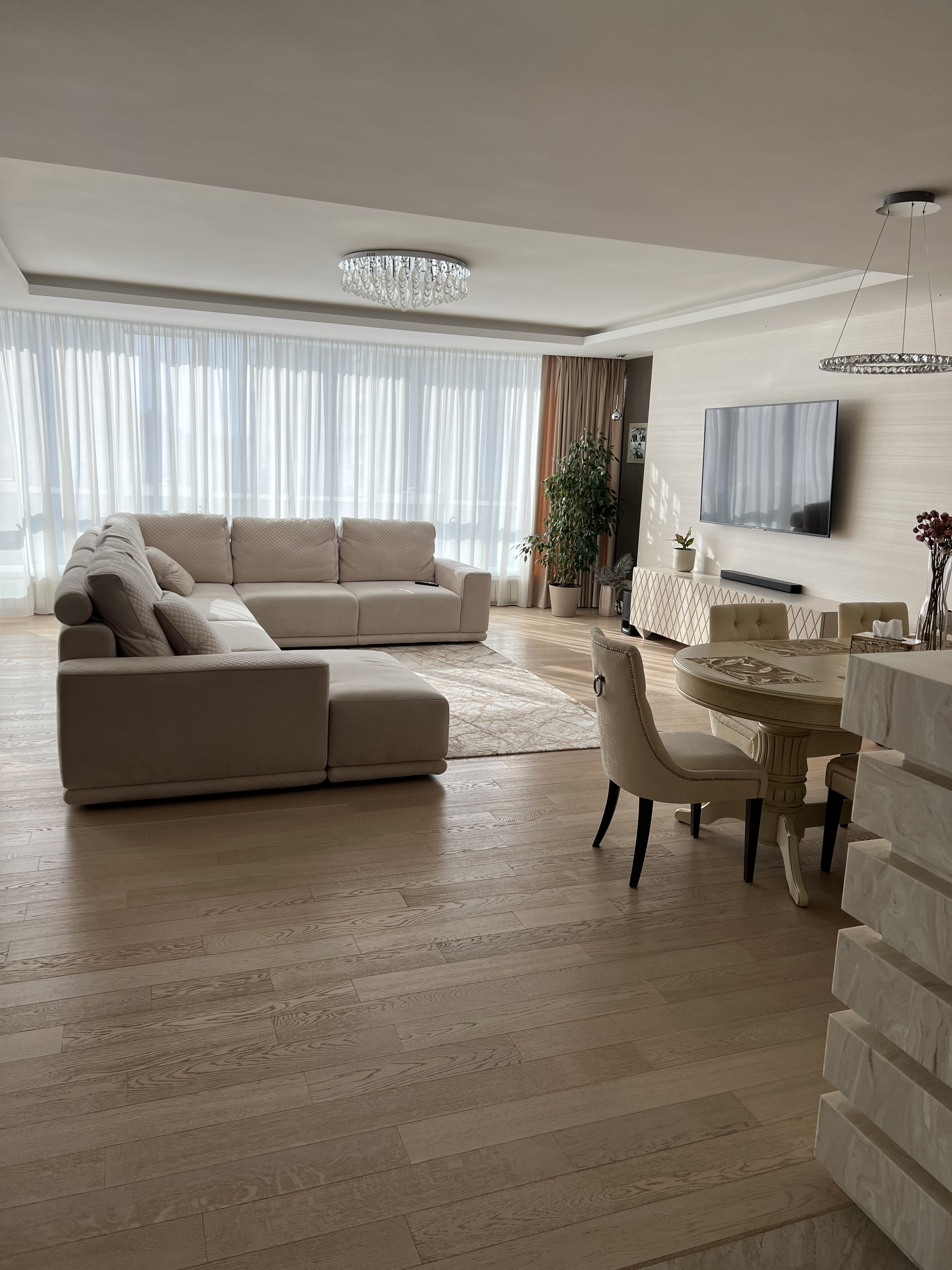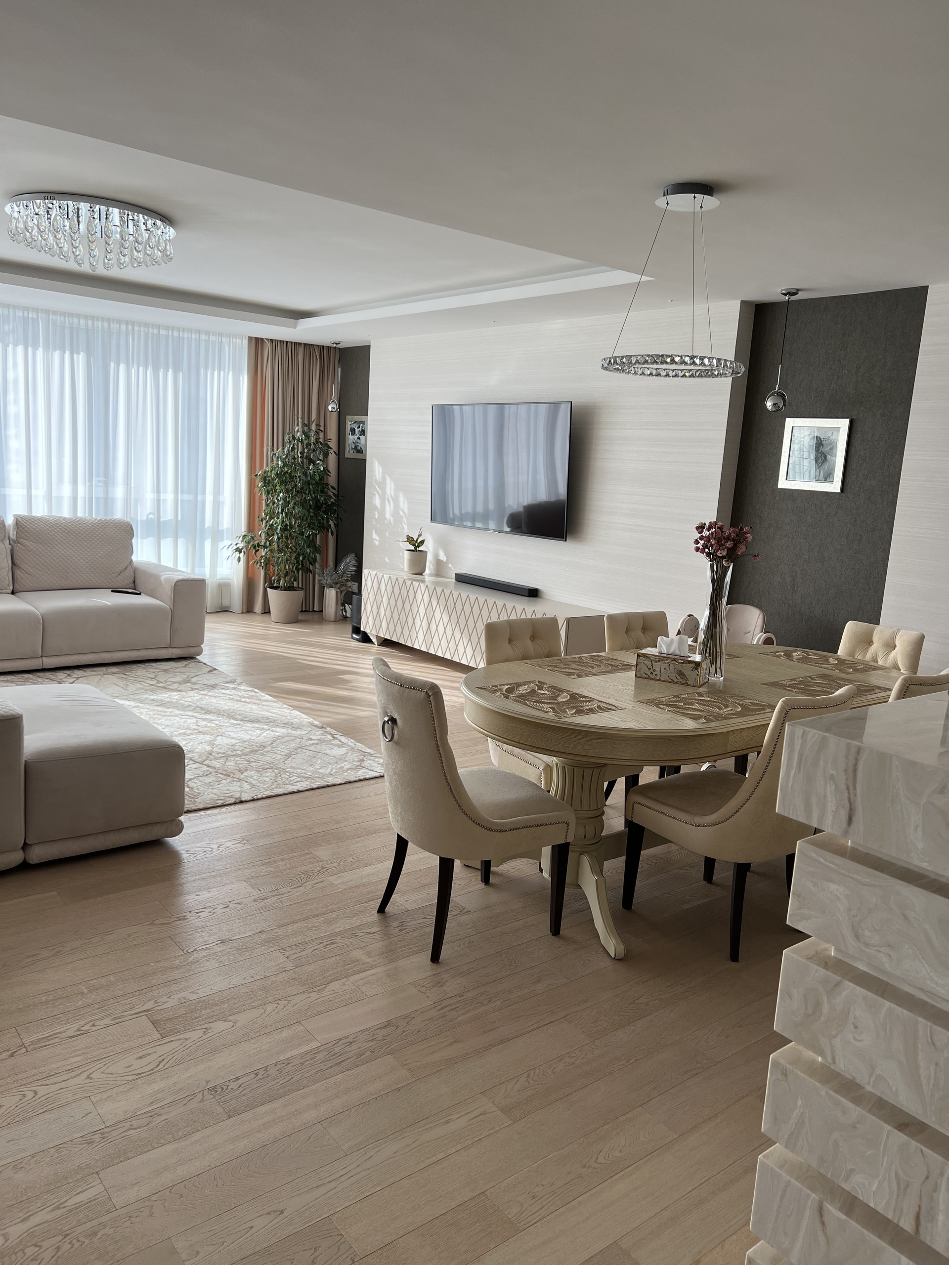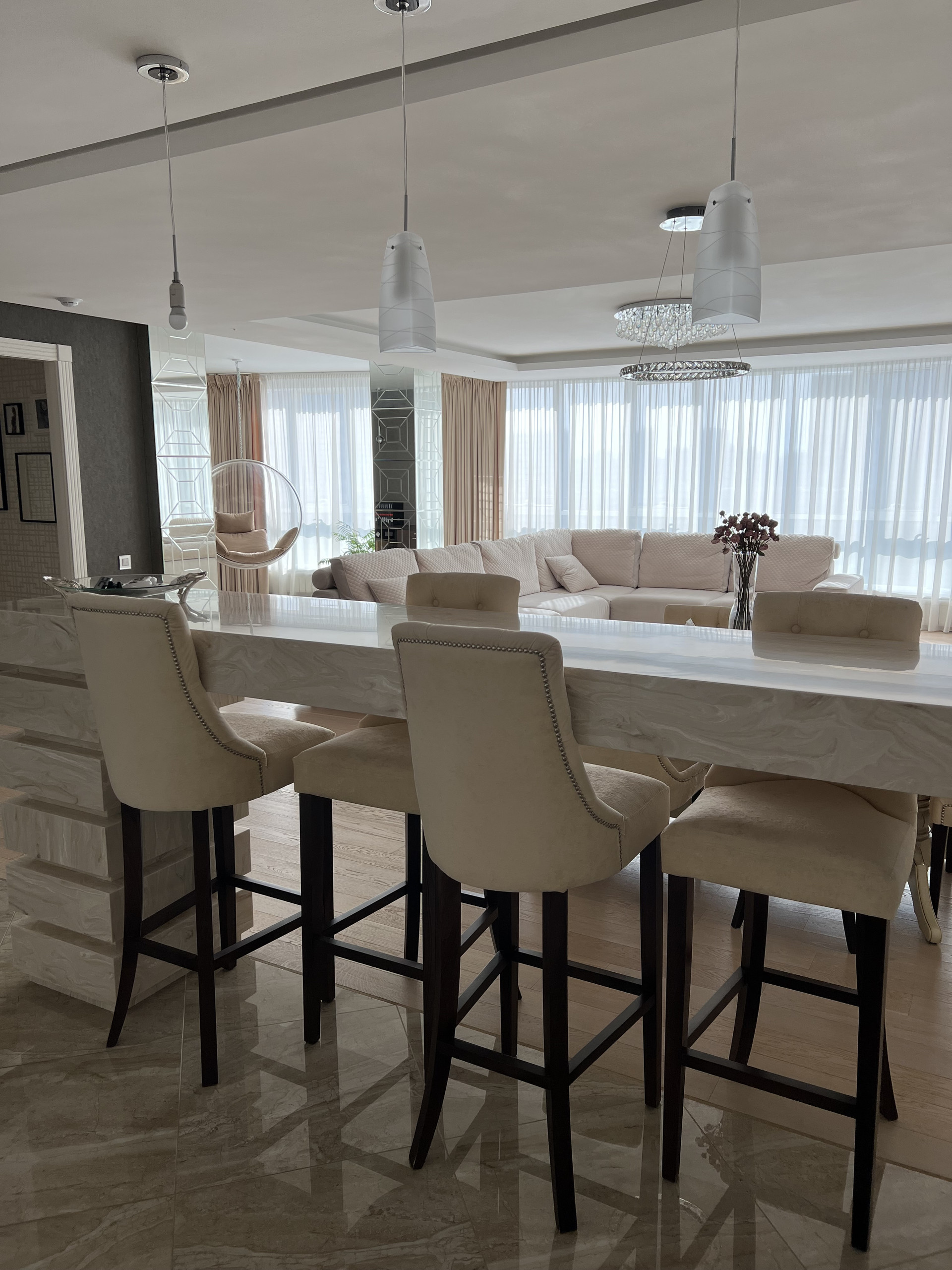 Столешница и барная стойка выполнены из искусственного камня. Длинна барной стойки составляет 3 метра. Обеденный стол из массива дуба, раскладывается и вмещает 8 человек. Барные и обеденные стулья сделаны на заказ ( наше производство) ткань уникальна тем, что они моются влажными салфетками. Во всей квартире очень дорогие итальянские обои, покупали в магазине Skol. Панорамное окно 9 метров, шторы заказывали в архитекторе- магазин Anka , карниз с электро доводчиками , управление с пульта. Декоративные колонны зеркальные с фризировкой выполнены на заказ. В каждой комнате телевизоры фирма Sony. Свет и дизайнерские розетки в квартире везли на заказ, магазин lightelectro . В гостиной , и спальнях на полу паркет ( термостойкий) при долгом отсутствие ( около 3 месяцев) квартира остаётся без увлажнение- паркет не рассыхается. В детской комнате на стенах выполнена художественная роспись, которую можно всегда перекрасить под ваш вкус. В хозяйской спальне мебель из Италии Salerno.