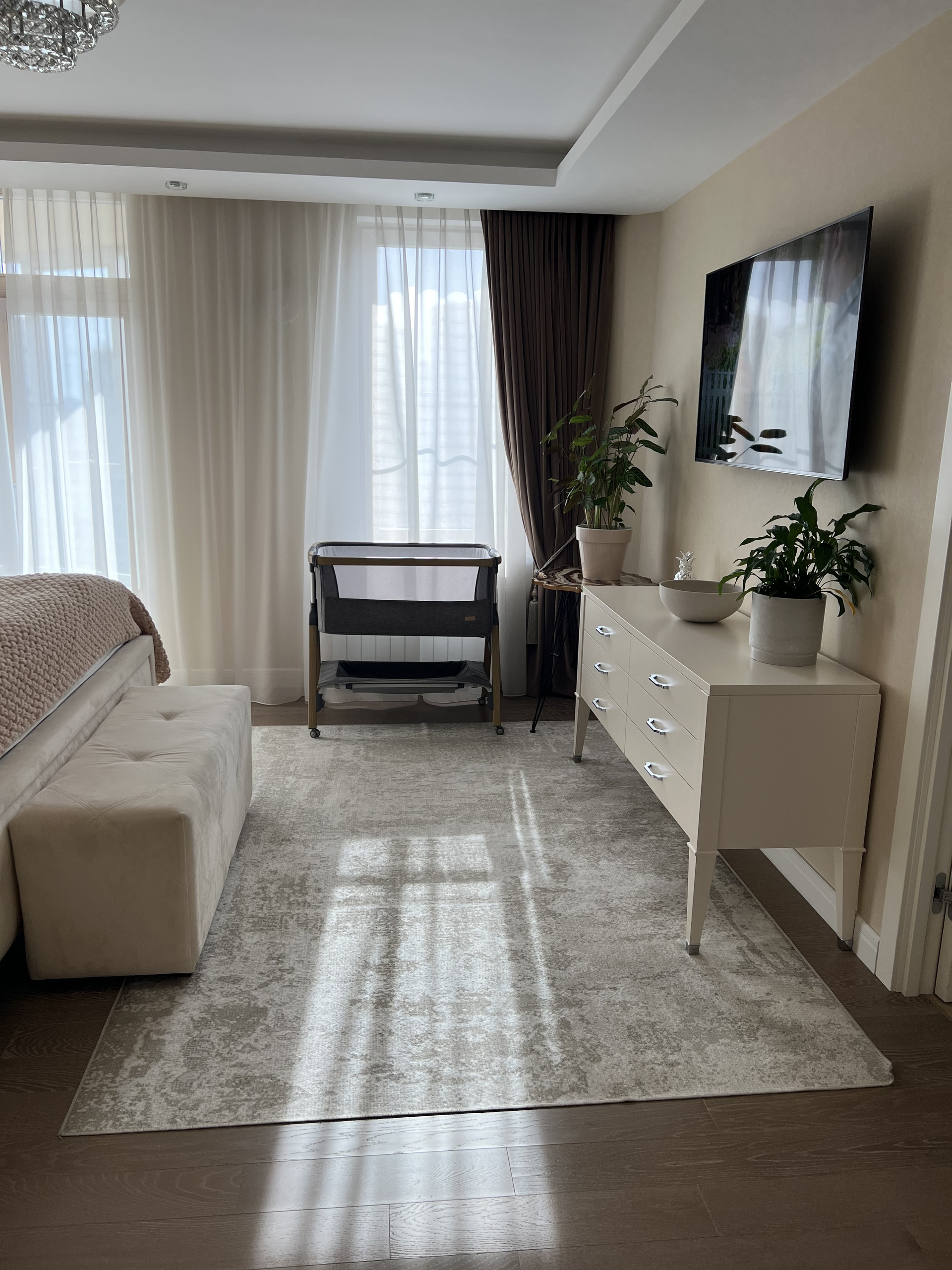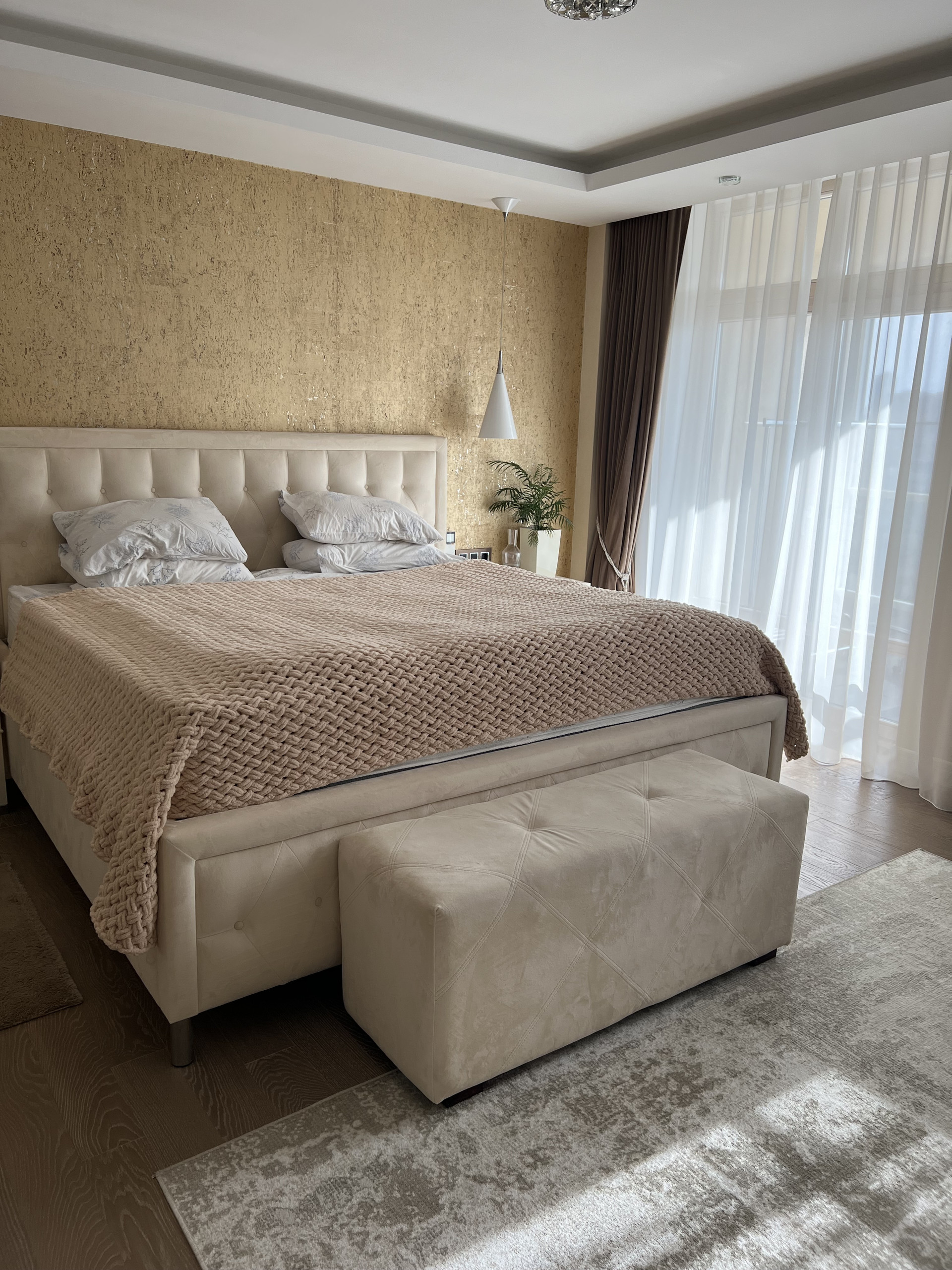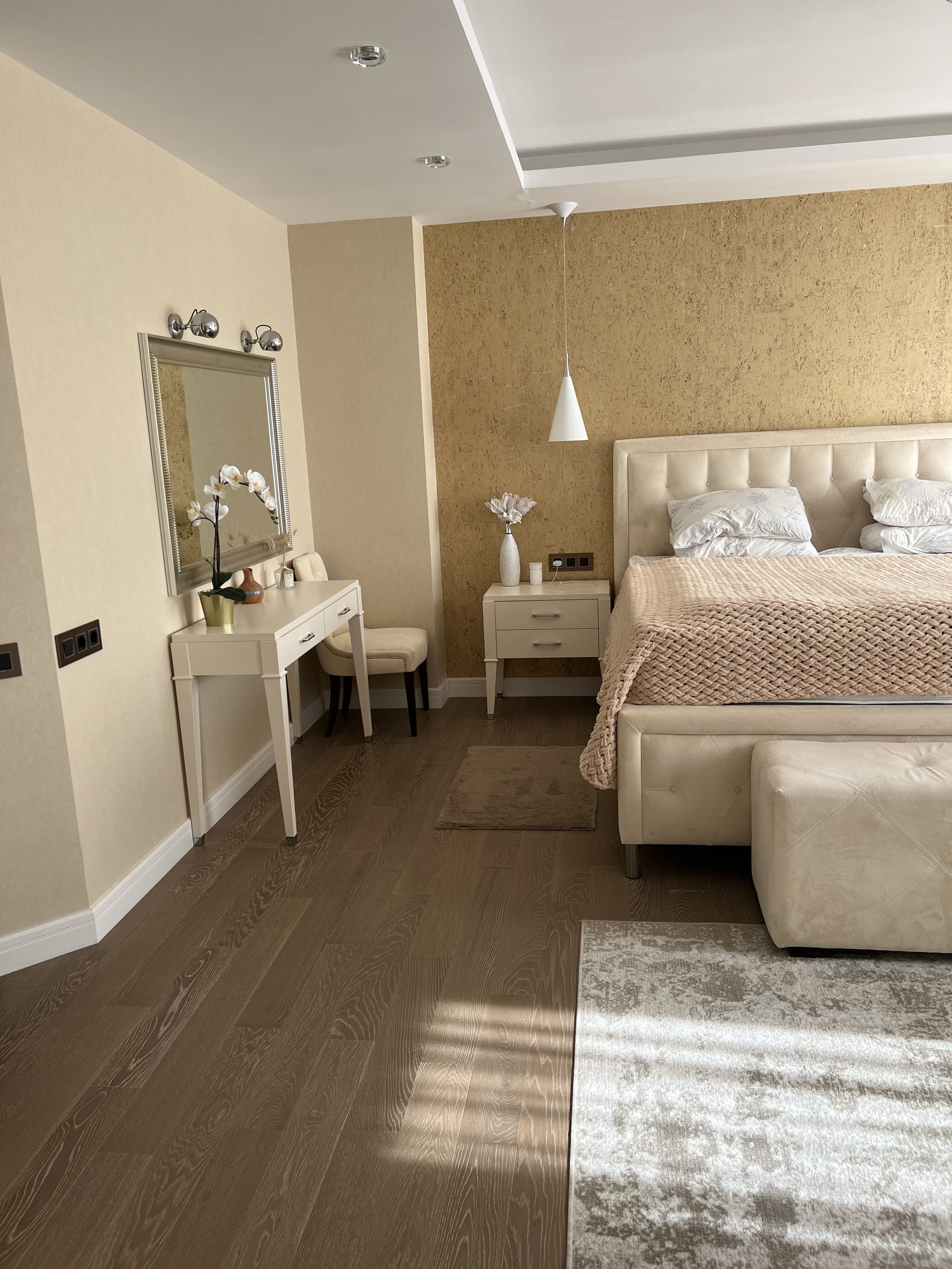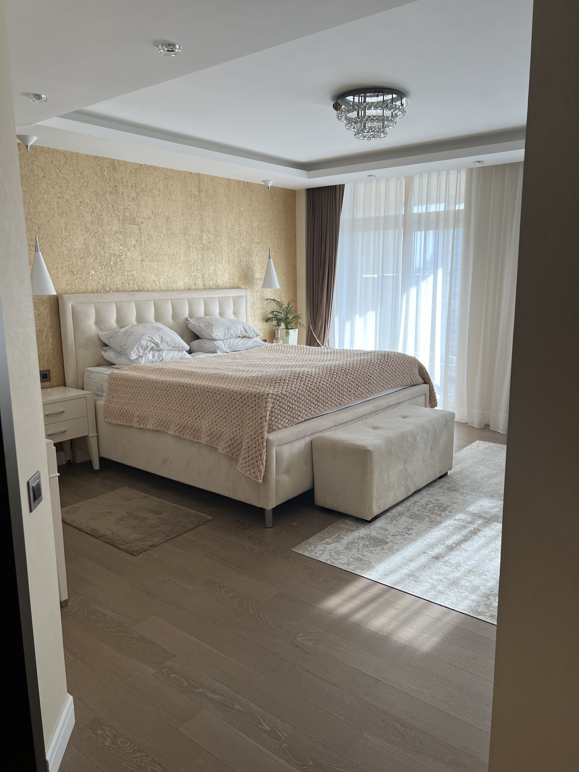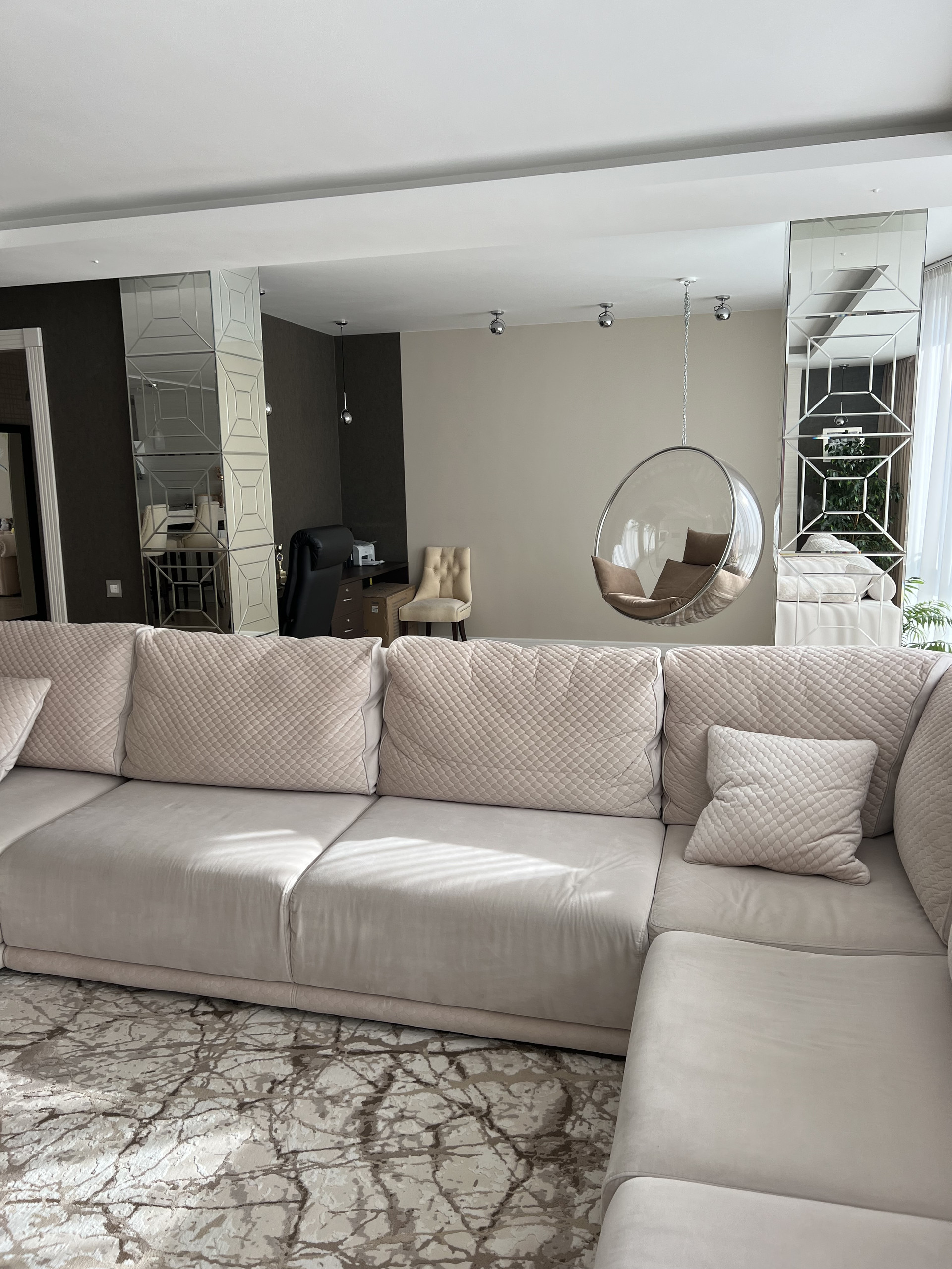 Столешница и барная стойка выполнены из искусственного камня. Длинна барной стойки составляет 3 метра. Обеденный стол из массива дуба, раскладывается и вмещает 8 человек. Барные и обеденные стулья сделаны на заказ ( наше производство) ткань уникальна тем, что они моются влажными салфетками. Во всей квартире очень дорогие итальянские обои, покупали в магазине Skol. Панорамное окно 9 метров, шторы заказывали в архитекторе- магазин Anka , карниз с электро доводчиками , управление с пульта. Декоративные колонны зеркальные с фризировкой выполнены на заказ. В каждой комнате телевизоры фирма Sony. Свет и дизайнерские розетки в квартире везли на заказ, магазин lightelectro . В гостиной , и спальнях на полу паркет ( термостойкий) при долгом отсутствие ( около 3 месяцев) квартира остаётся без увлажнение- паркет не рассыхается. В детской комнате на стенах выполнена художественная роспись, которую можно всегда перекрасить под ваш вкус. В хозяйской спальне мебель из Италии Salerno.