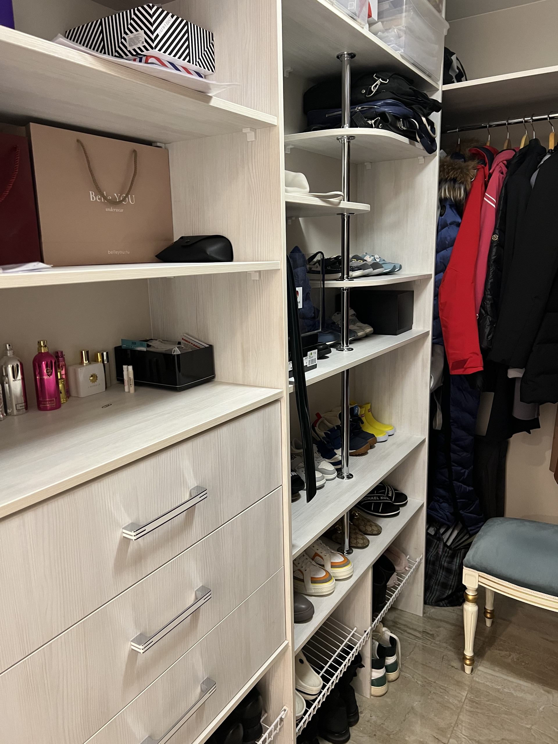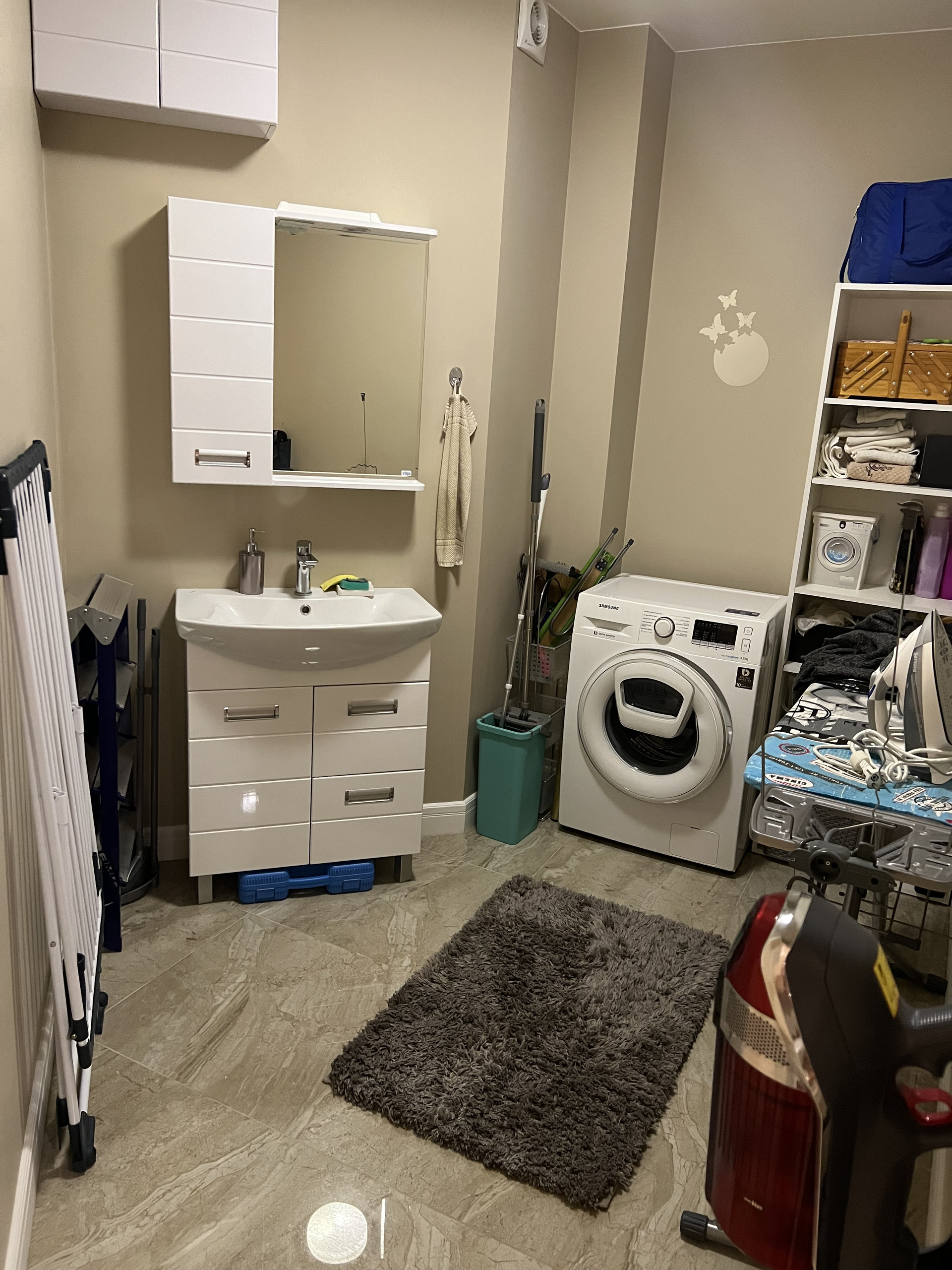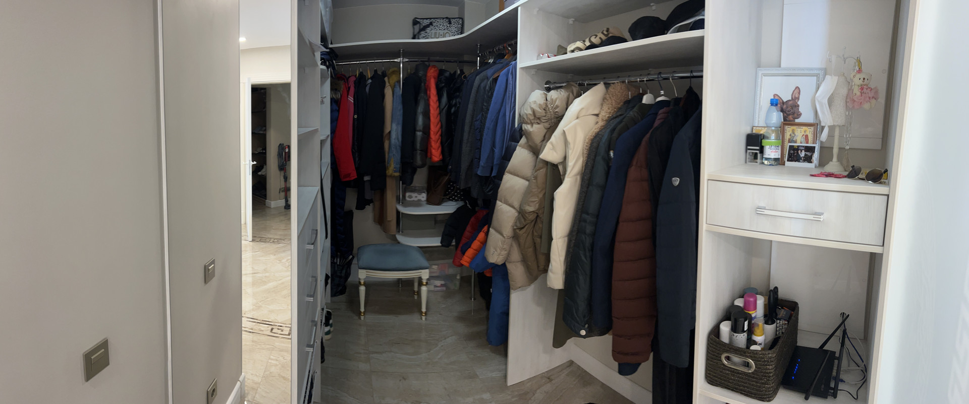 Большая гардеробная для всей семьи и отдельно постирочная комната. Выход в гардеробную есть с коридора и спальни. Стоят фильтры на горячую и холодную воду.