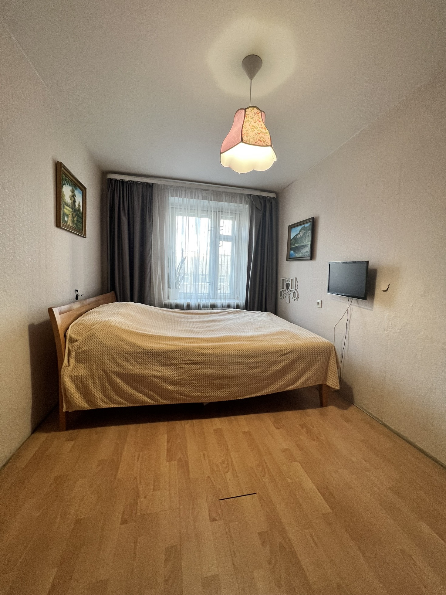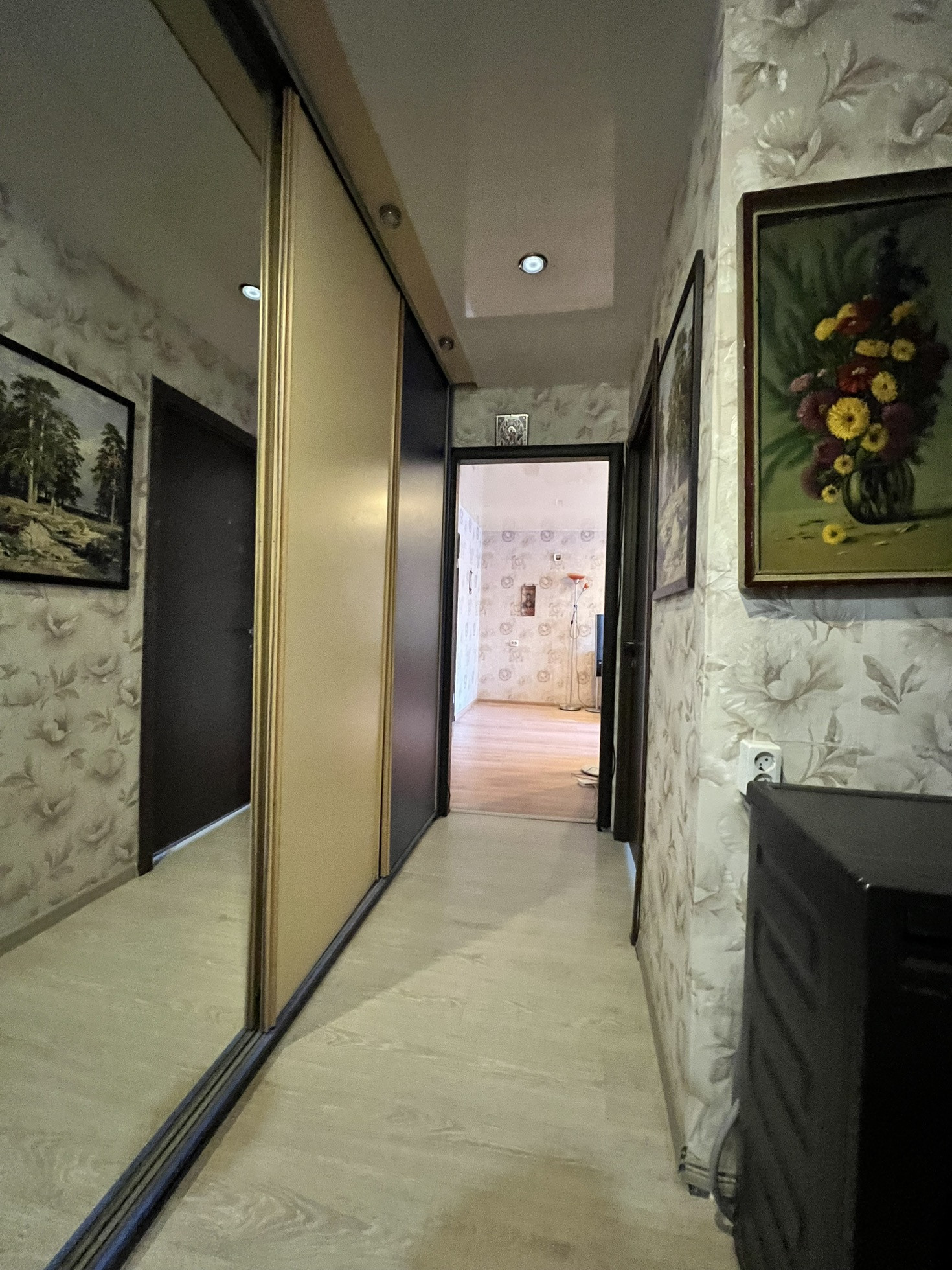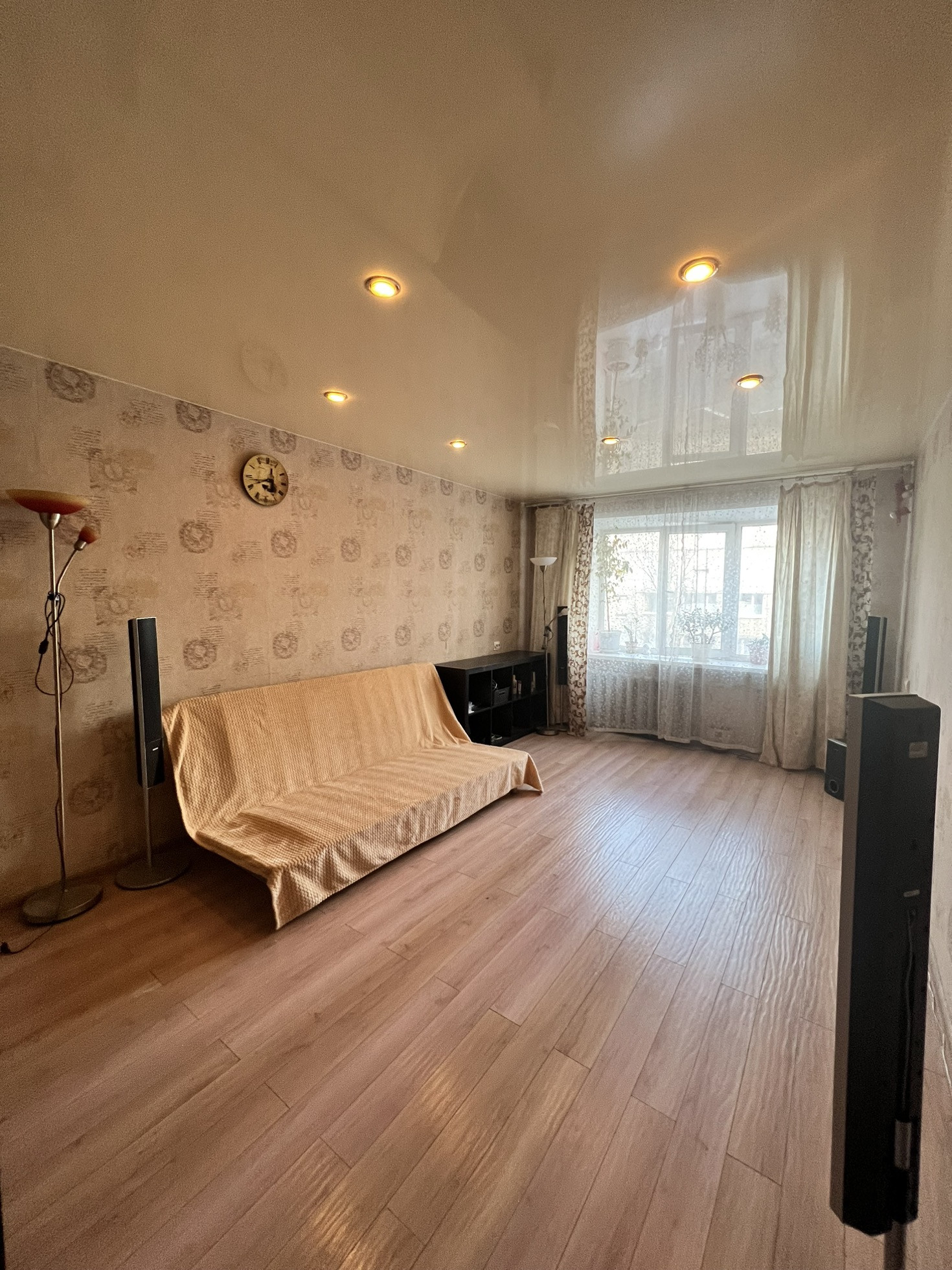 Находиться на самом хорошем  4 этаже. Окна выходят на разные стороны дома, три окна во двор. Два есть балкона! Самое главное все коммуникации заменены : холодная, горячая вода и канализация! На полу ламинат, натяжные потолки , хорошего качества обои. Кухонный гарнитур, с варочной панелью остается, кровать и три шкафа. Лифт в подъезде новый.