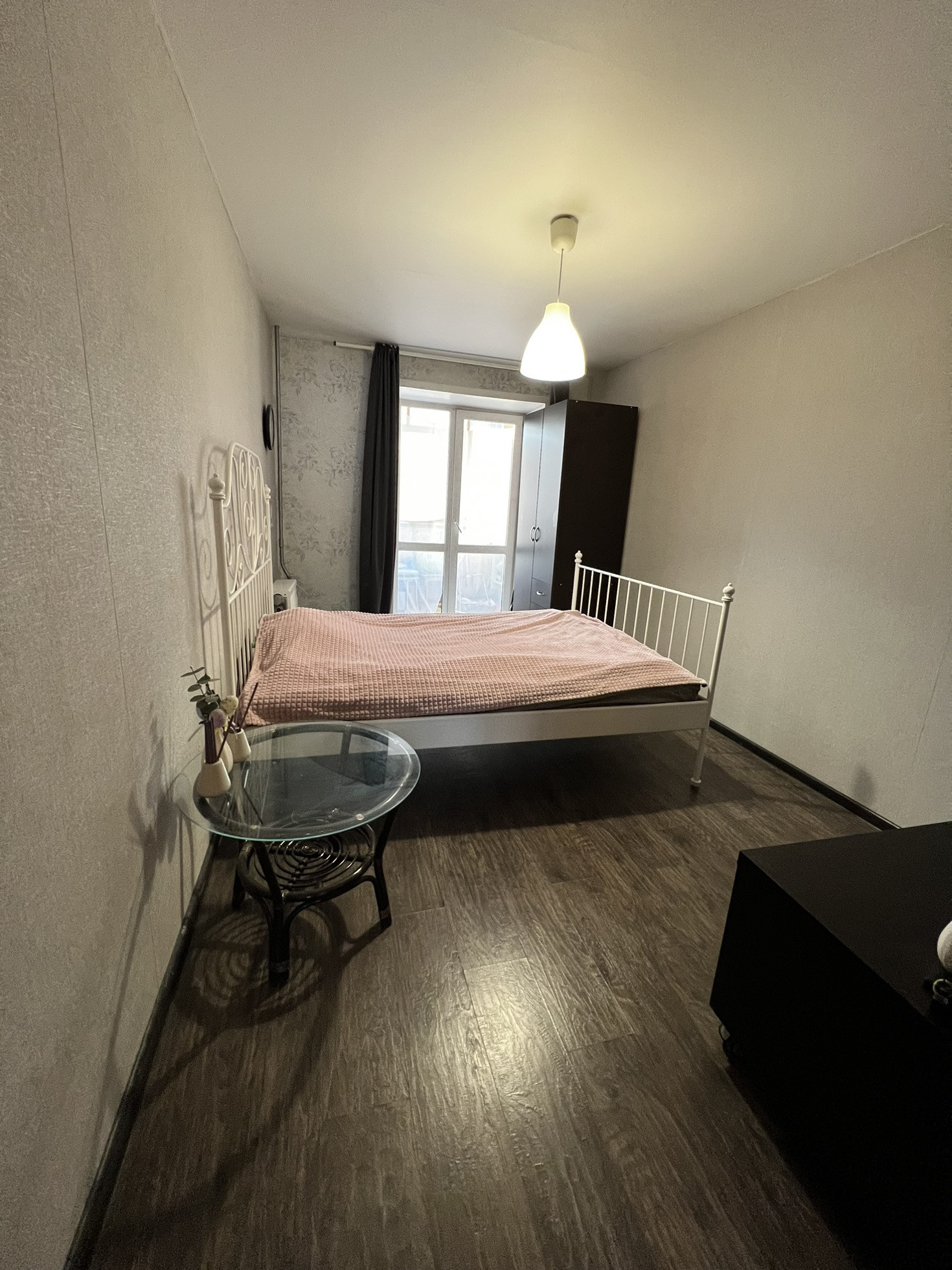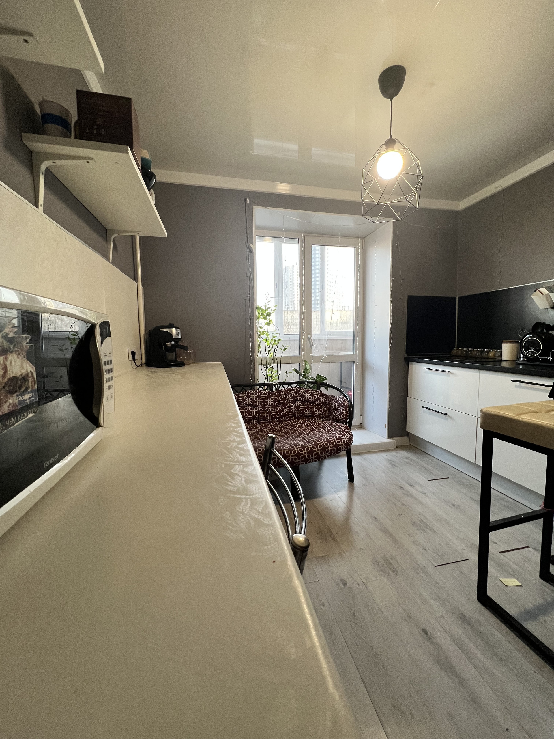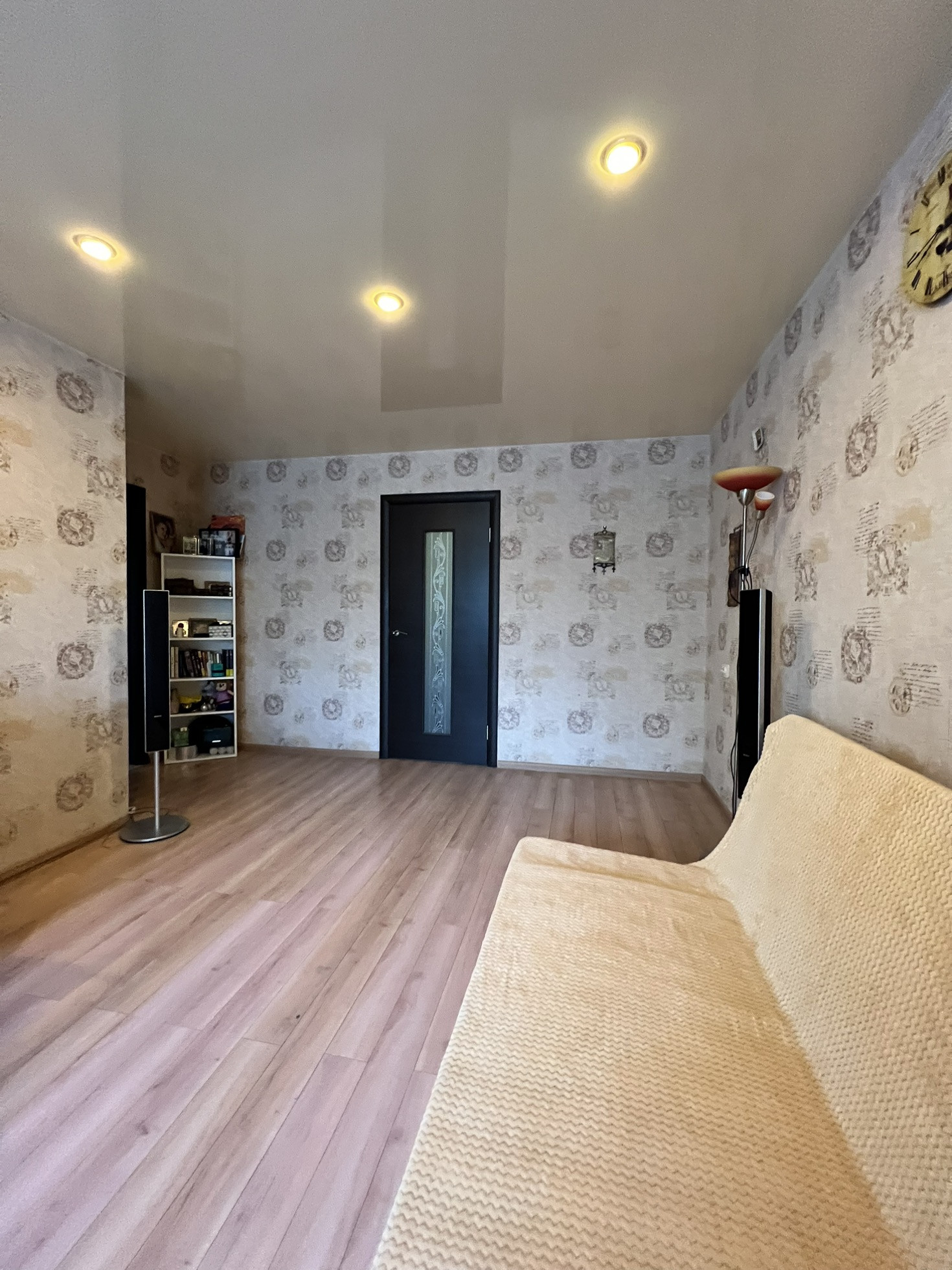 Находиться на самом хорошем  4 этаже. Окна выходят на разные стороны дома, три окна во двор. Два есть балкона! Самое главное все коммуникации заменены : холодная, горячая вода и канализация! На полу ламинат, натяжные потолки , хорошего качества обои. Кухонный гарнитур, с варочной панелью остается, кровать и три шкафа. Лифт в подъезде новый.