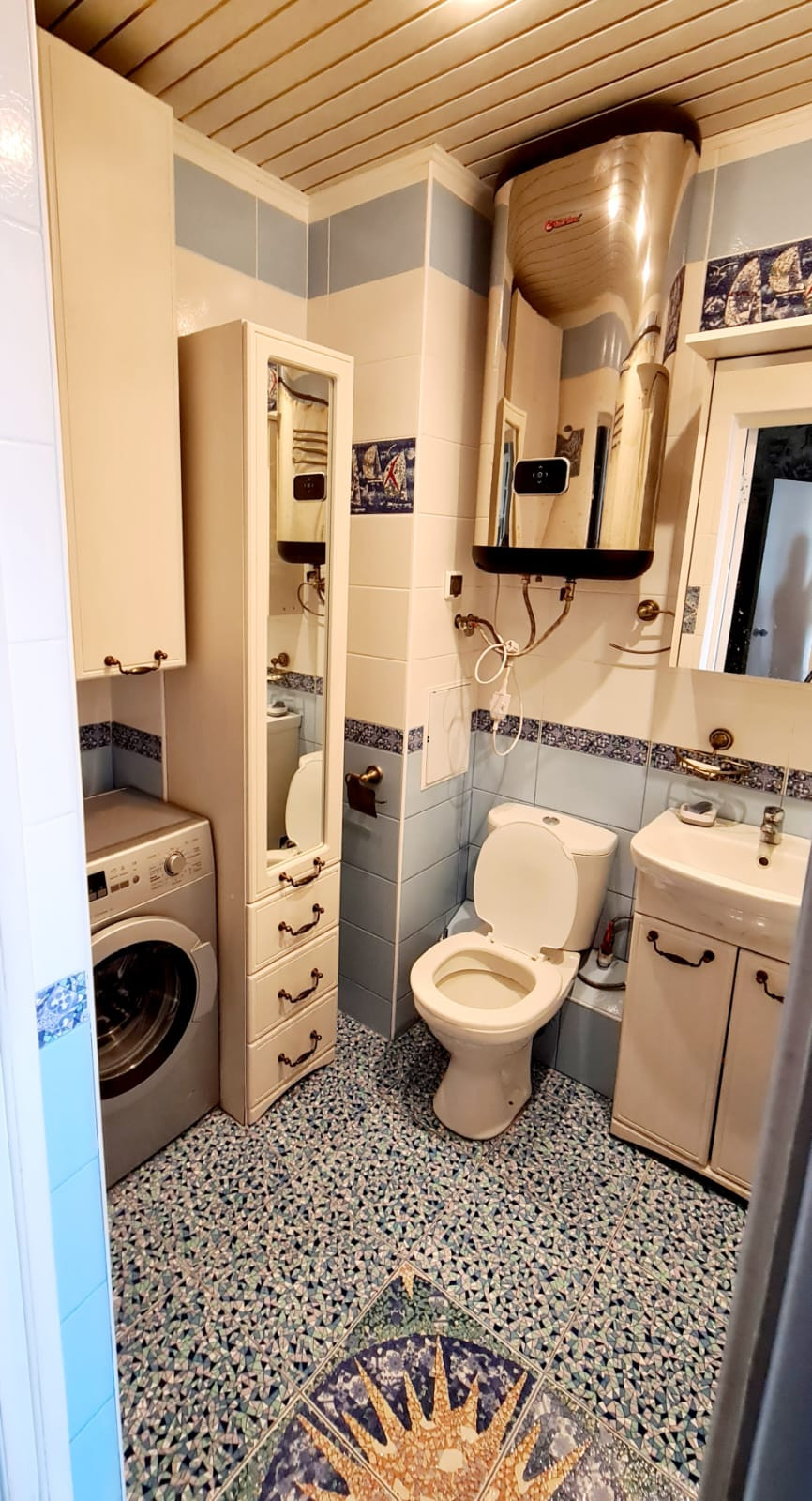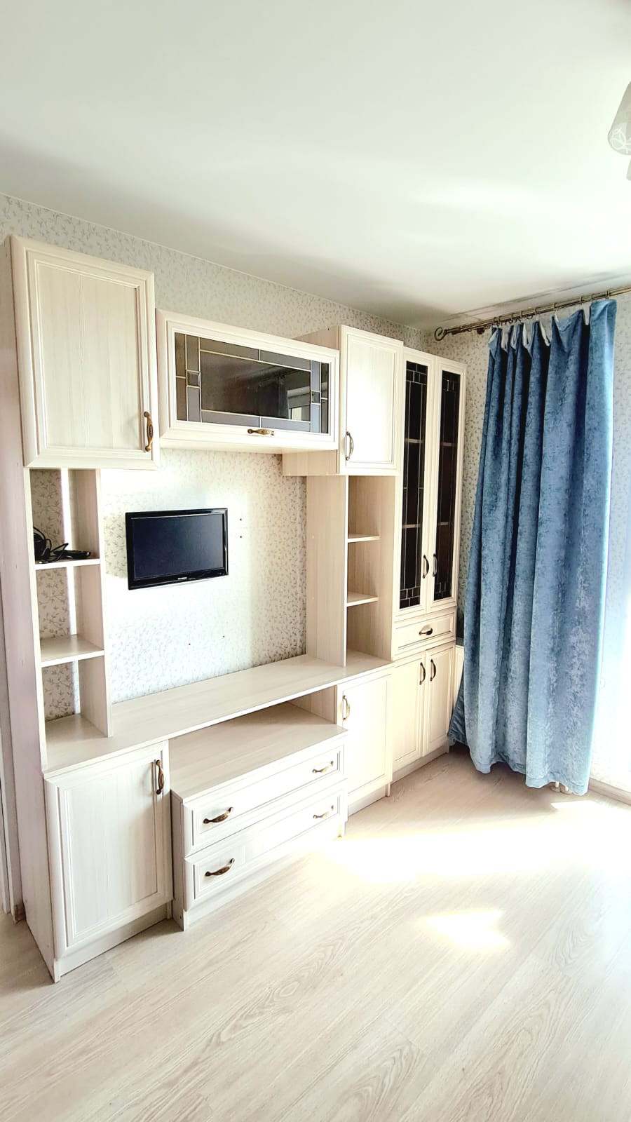 Просторная кухня-гостиная, балкон из гостиной, вторая комната была детской. В коридоре вместительный шкаф-купе, ванная со стиральной машинкой и шкафчиками. Кухонный гарнитур с керамической плитой, духовкой, есть холодильник. В комнате большой шкаф и комод. Кровать 160×200.