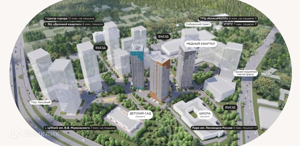 Комплекс расположен в границах улиц Сибирского тракта, переулка Базового, улицы Яламова. В пешей доступности лесопарк, Центральный парк культуры и отдыха им. Маяковского, бизнес центр, развлекательный центр, продуктовые ритейлы и фитнес-клуб.
