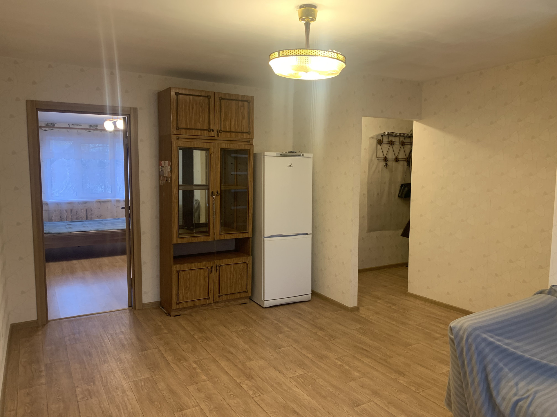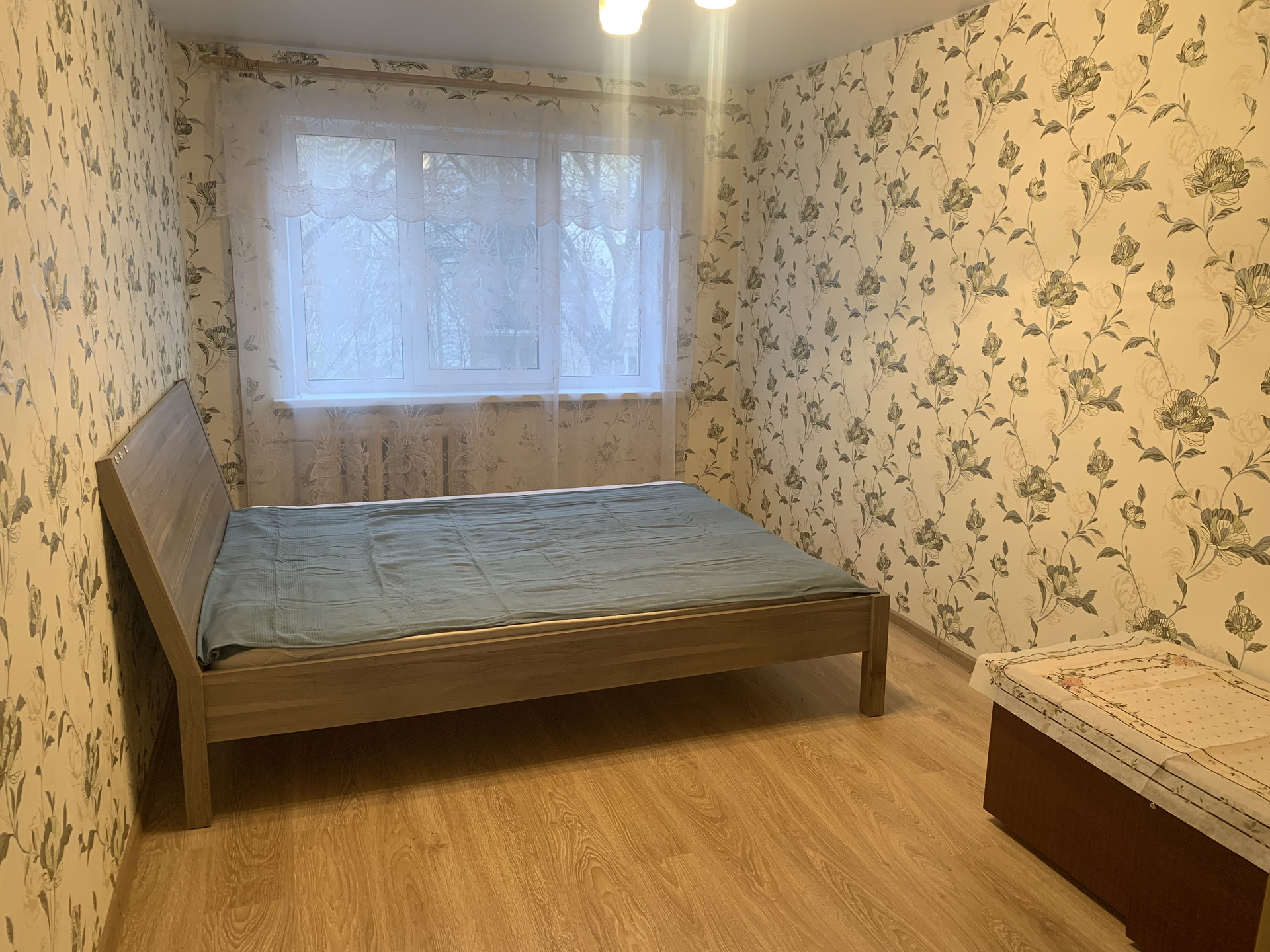 Пластиковые стеклопакеты, натяжной потолок в спальне, ламинат на полу.