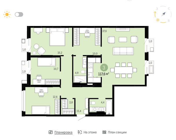 Предлагаю Вам отличную трёхкомнатную квартиру, которую с лёгкостью можно перепланировать под четырёхкомнатную. Панорамные окна в пол заливают комнаты светом, утром со стороны кухни-гостиной наступает рассвет, а днём спальни также освещены естественным светом, несмотря на то, что окна выходят во двор. В коридоре продумана гардеробная и большой санузел.