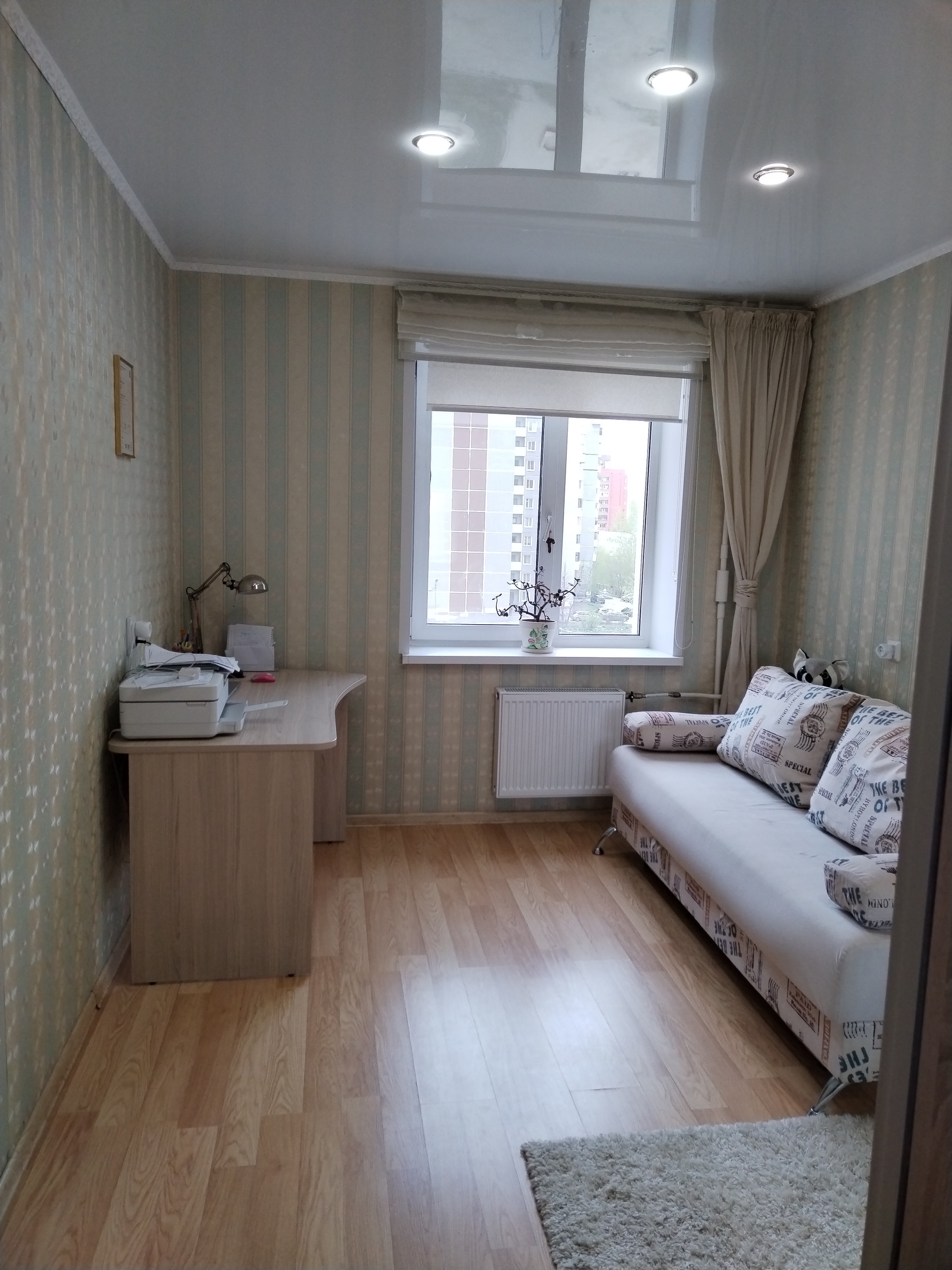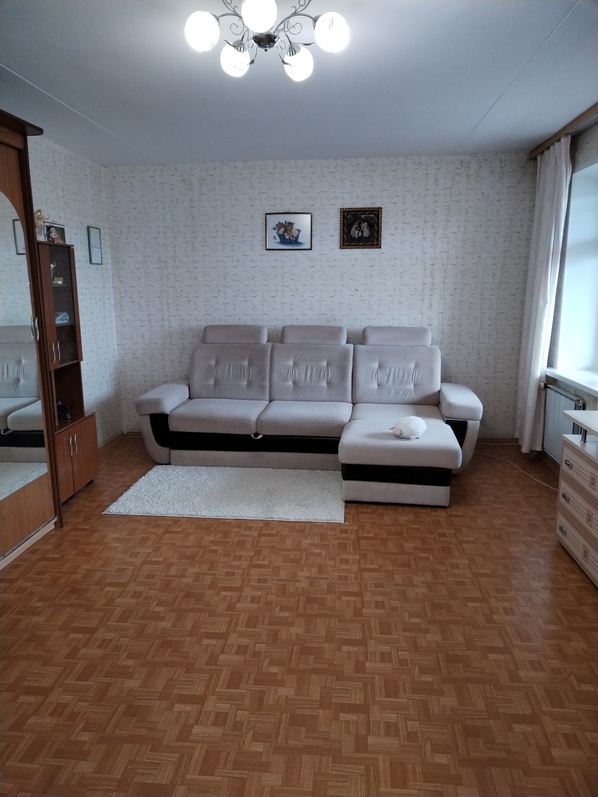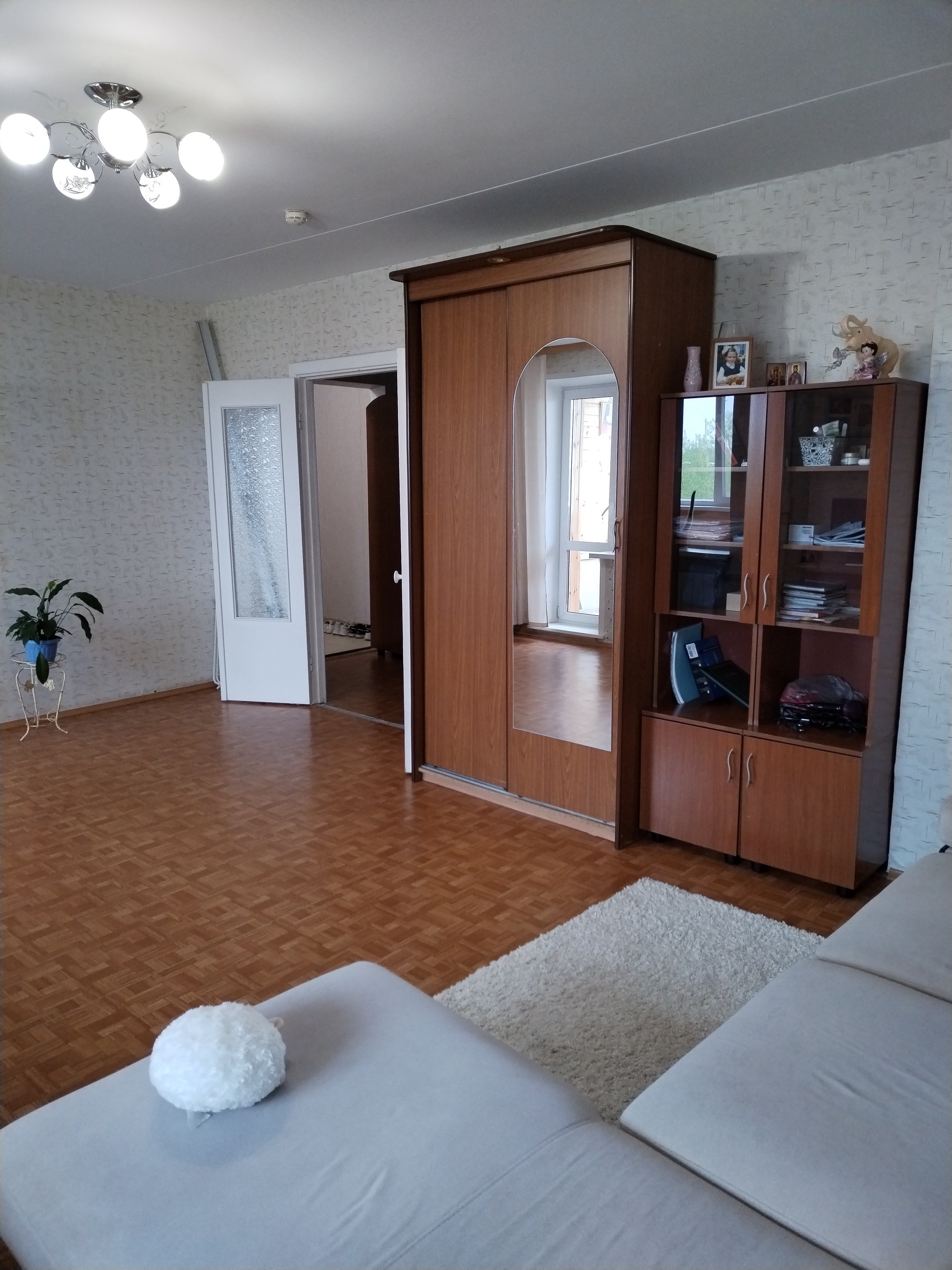 Полы: в спальне –ламинат, в гостиной и коридоре – линолеум, на лоджии – ламинат, на кухне – керамогранит, в сан.узле – керамическая плитка (на кухне и в сан.узле установлены тёплые полы с терморегуляторами).