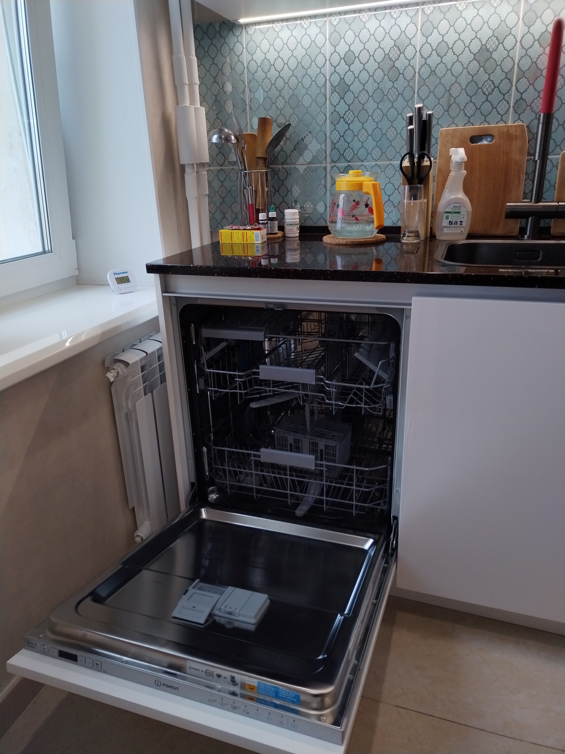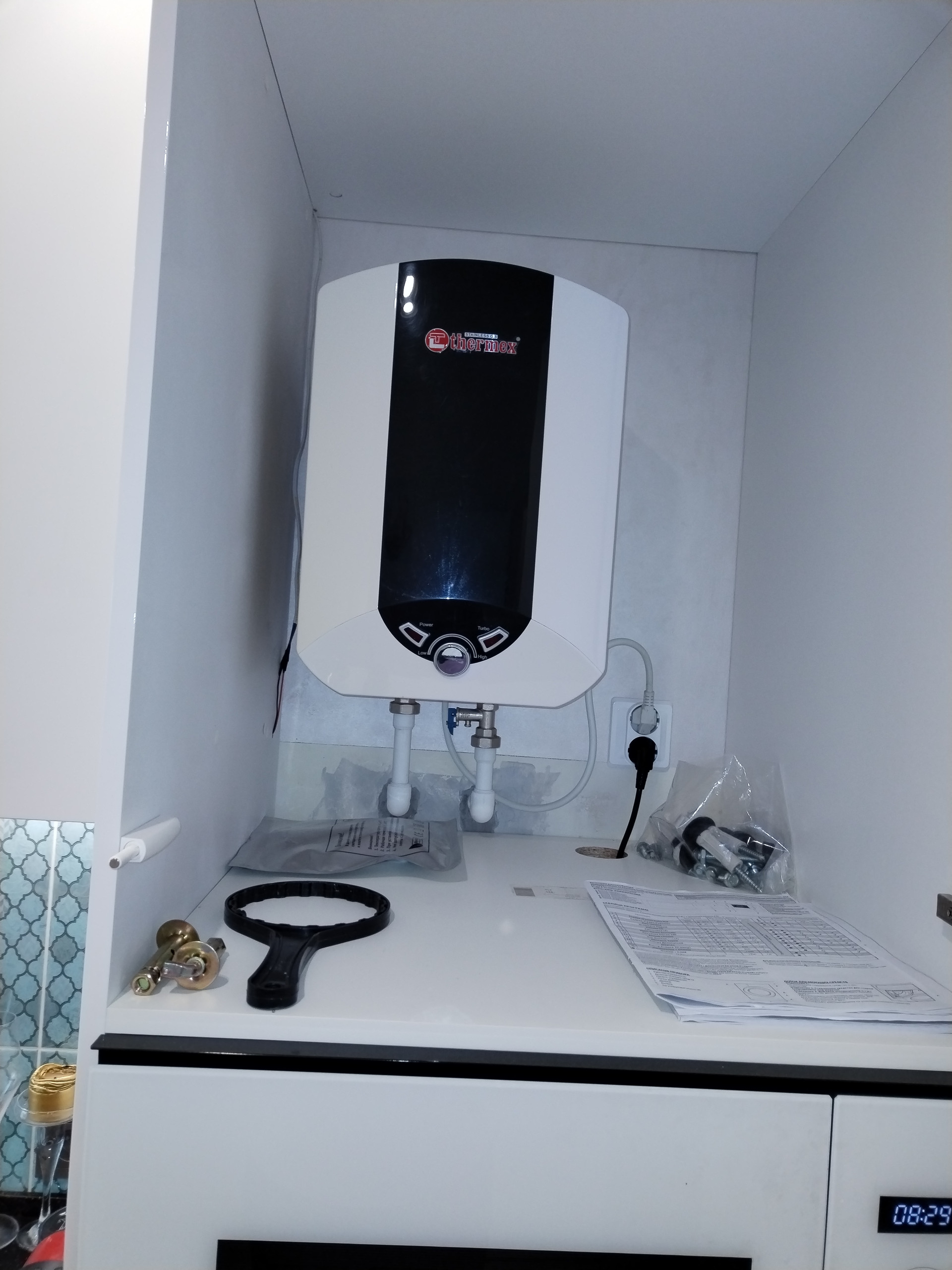 На кухне также установлен водонагреватель. Т.ч. горячая вода будет всегда.