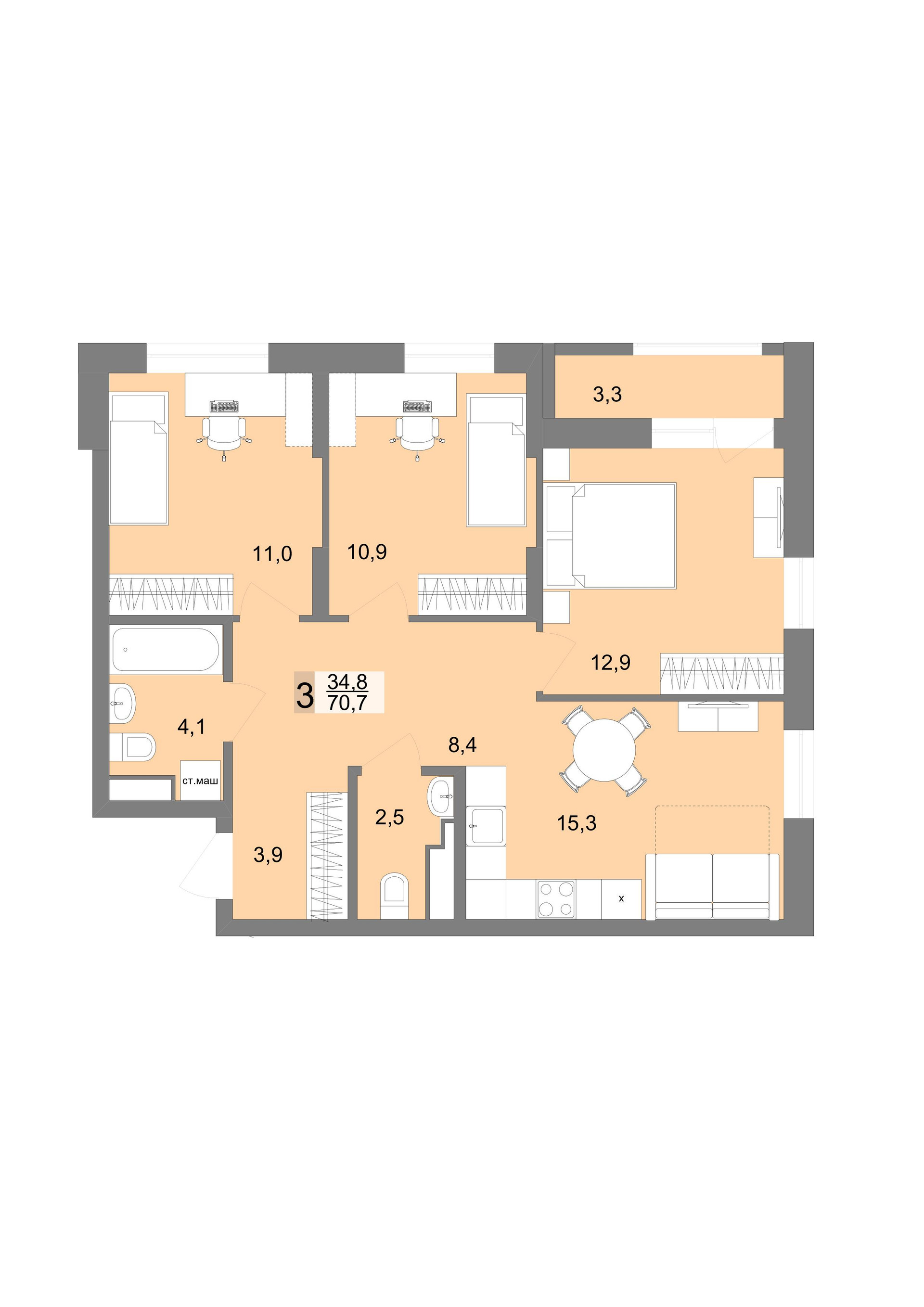 Общая площадь 70.5 м2