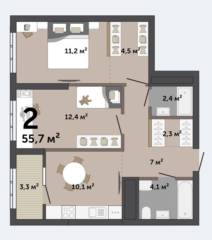 Общая площадь 55.7 м2