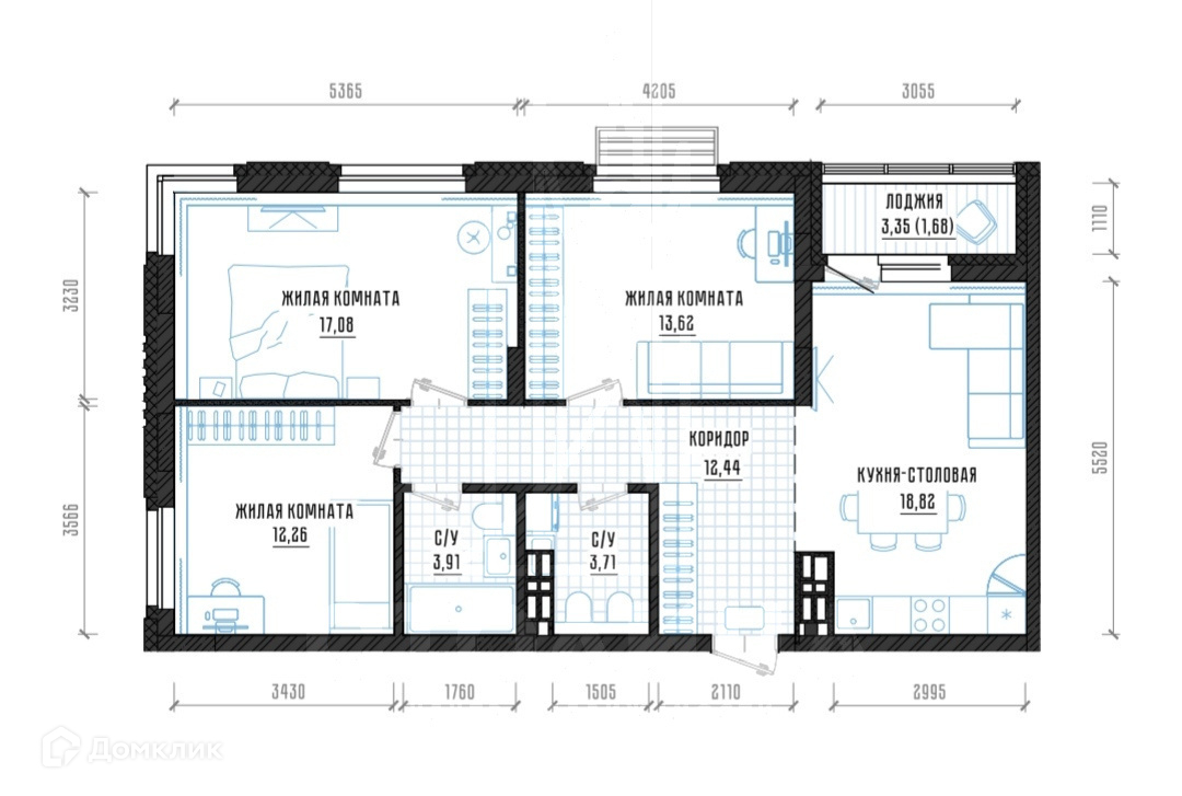 Жилая площадь 42.96 м2