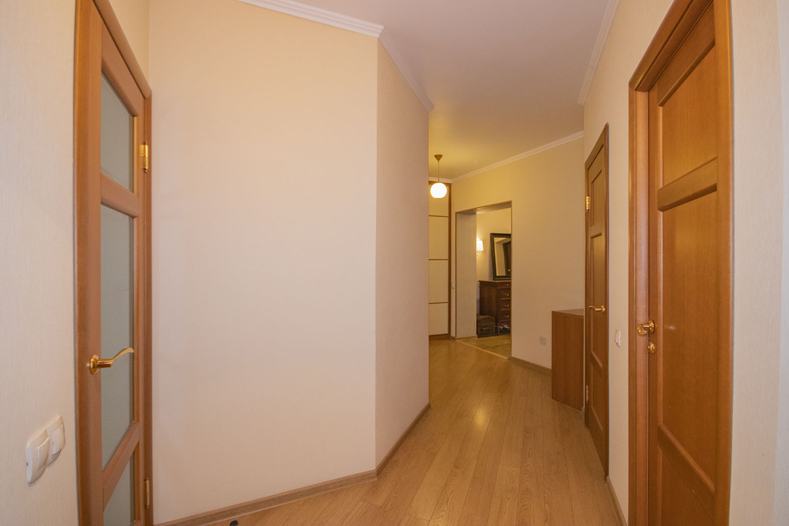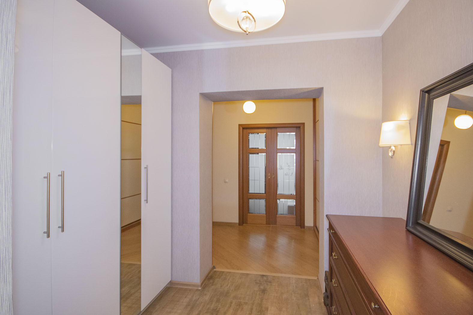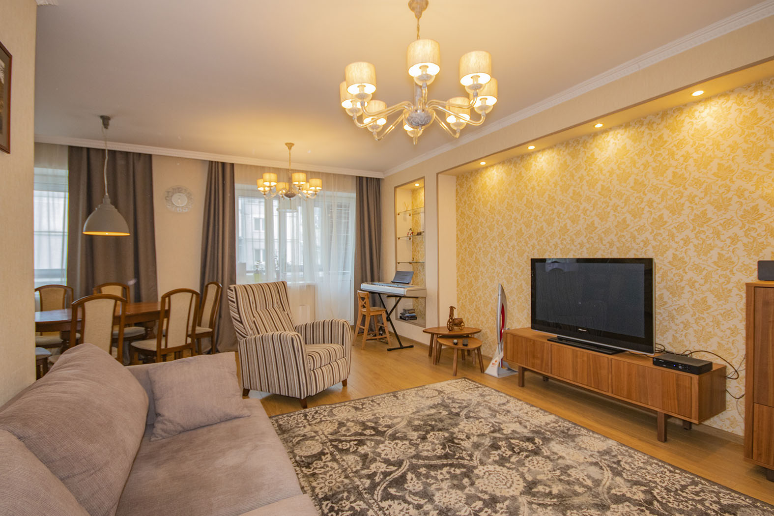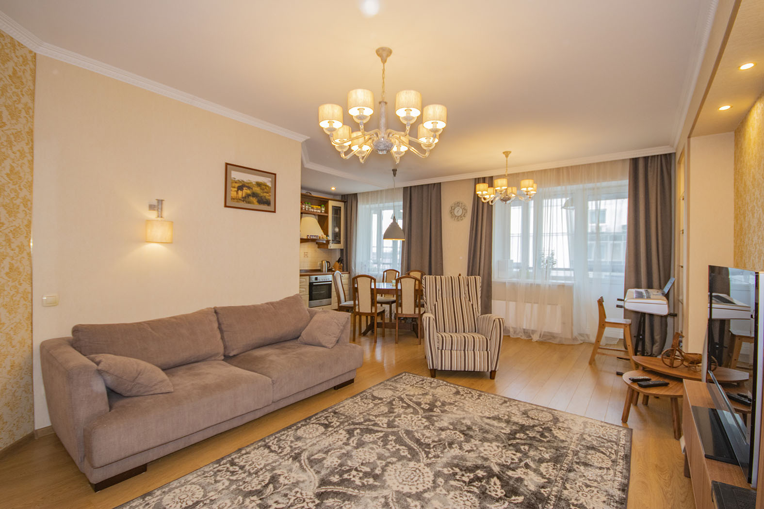 В квартире предусмотрено много точек освещения (люстры, светильники, лампы), что добавляет уюта.