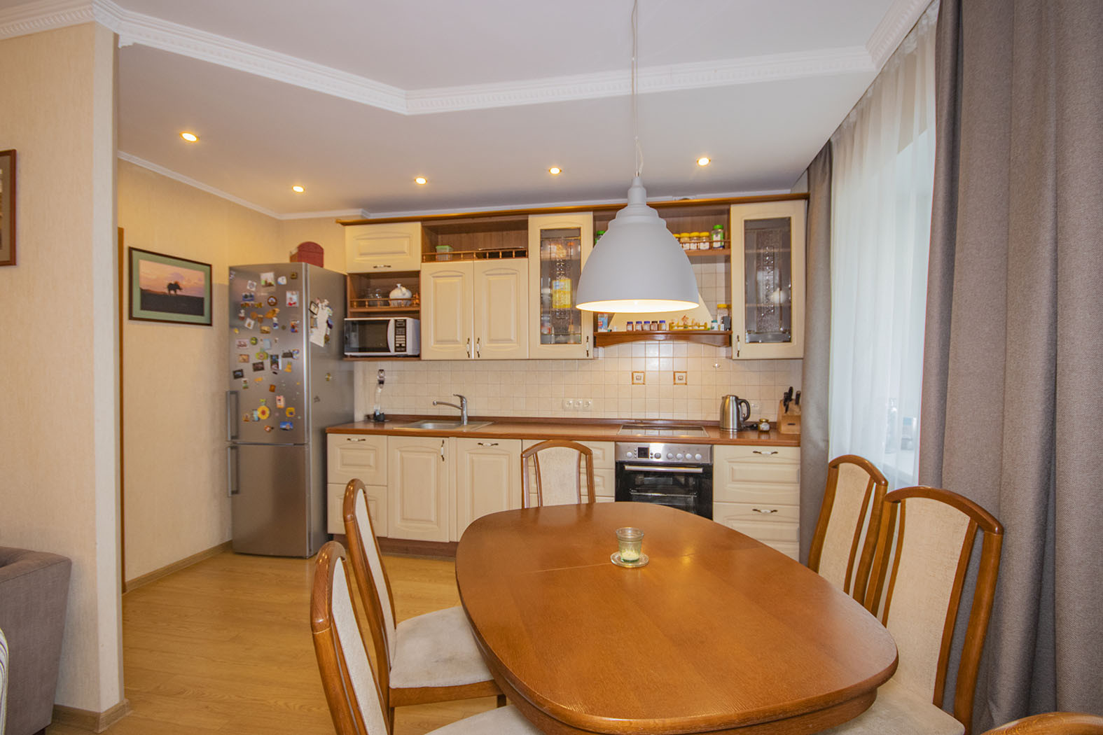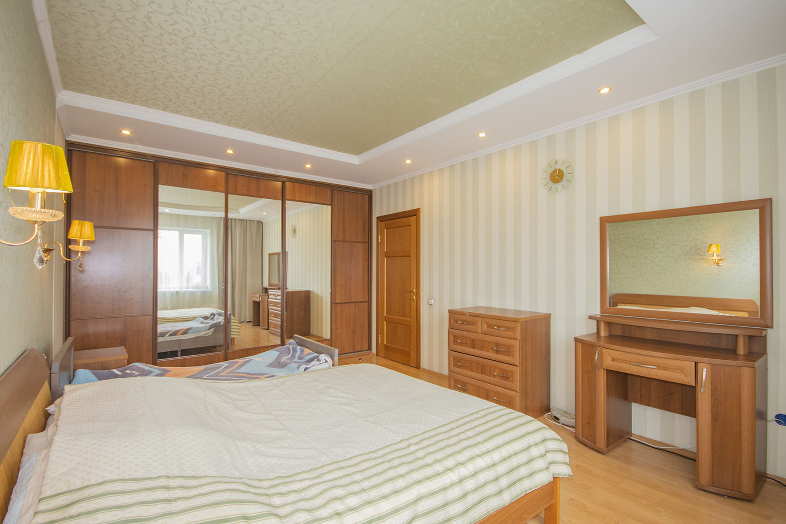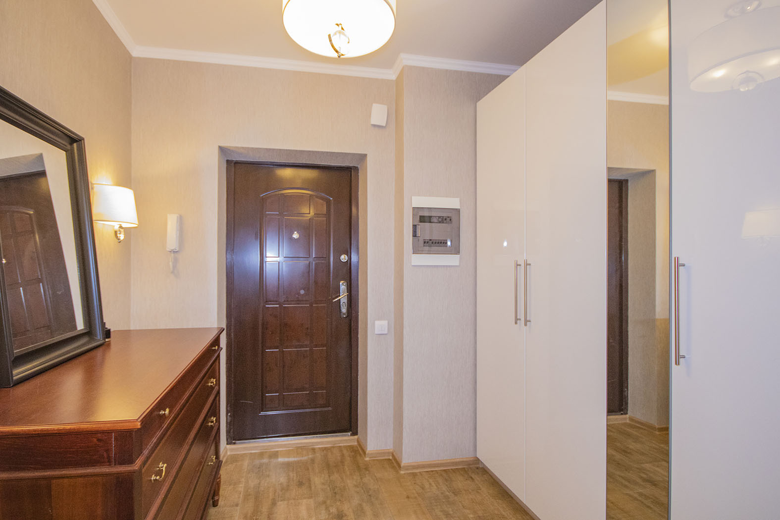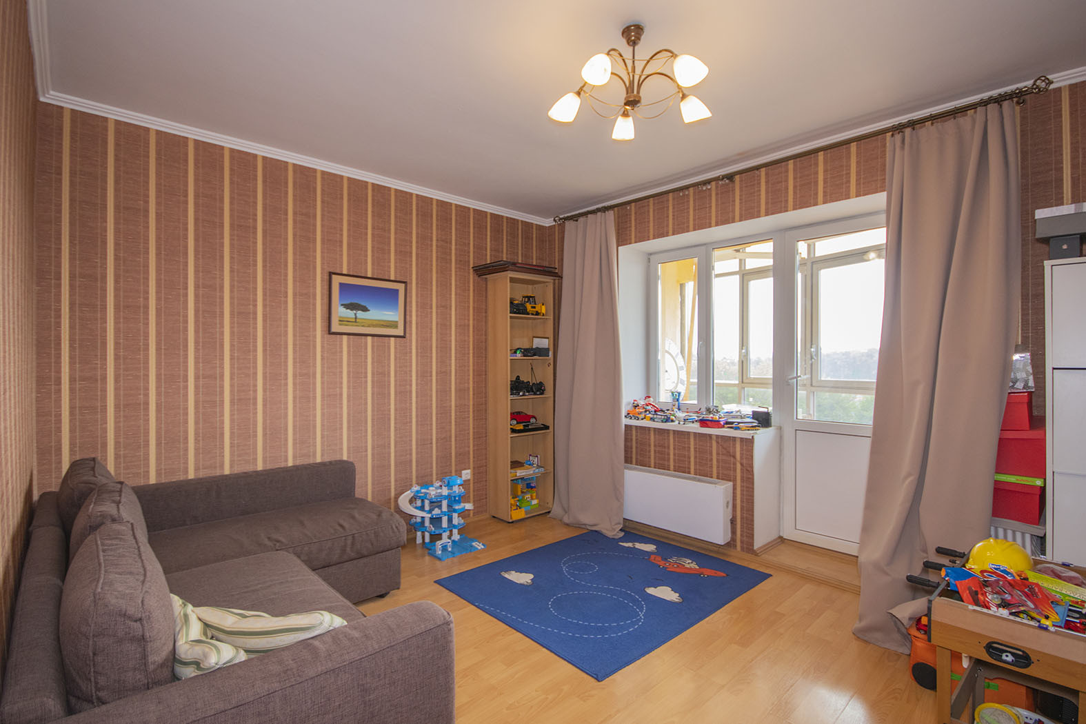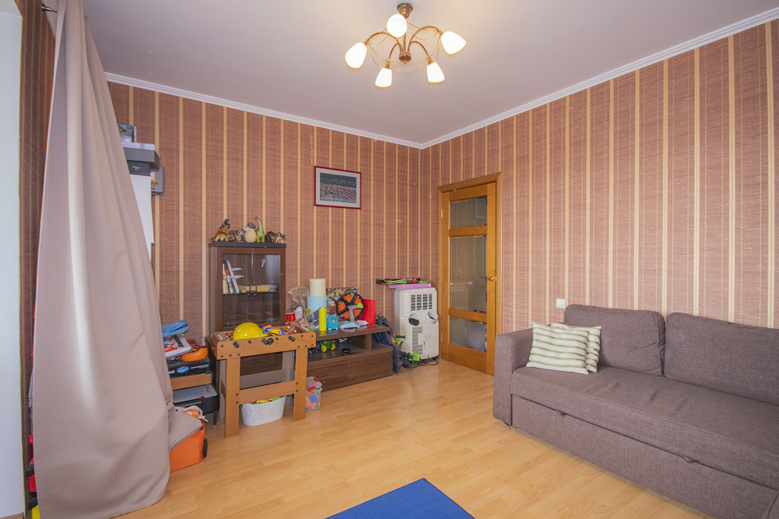 В квартире предусмотрено много точек освещения (люстры, светильники, лампы), что добавляет уюта.
