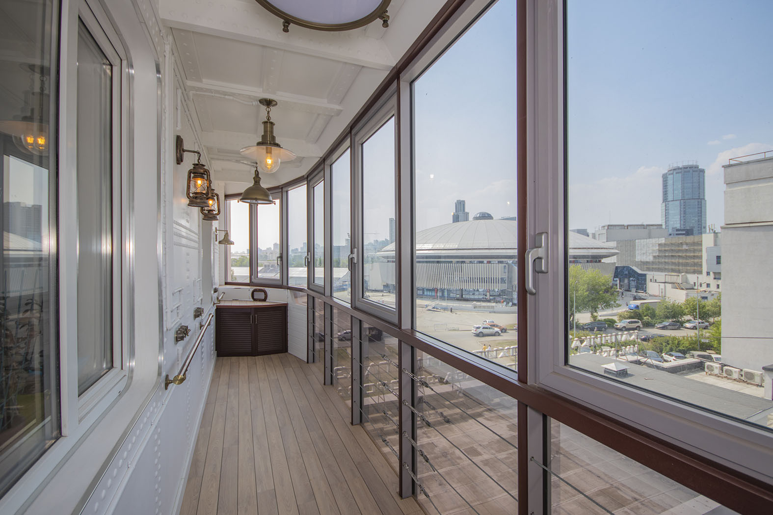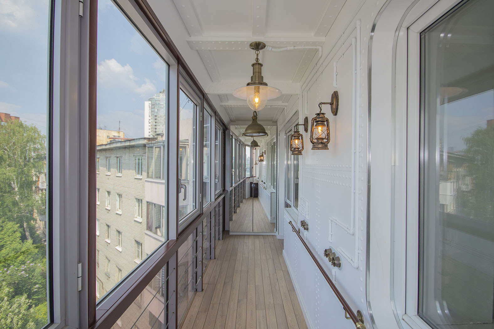 Плюс 2 лоджии: 11 кв метров (оформление в виде палубы корабля) и 9 кв метров (полукруглая веранда с панорамным остеклением). Два санузла, кладовая.