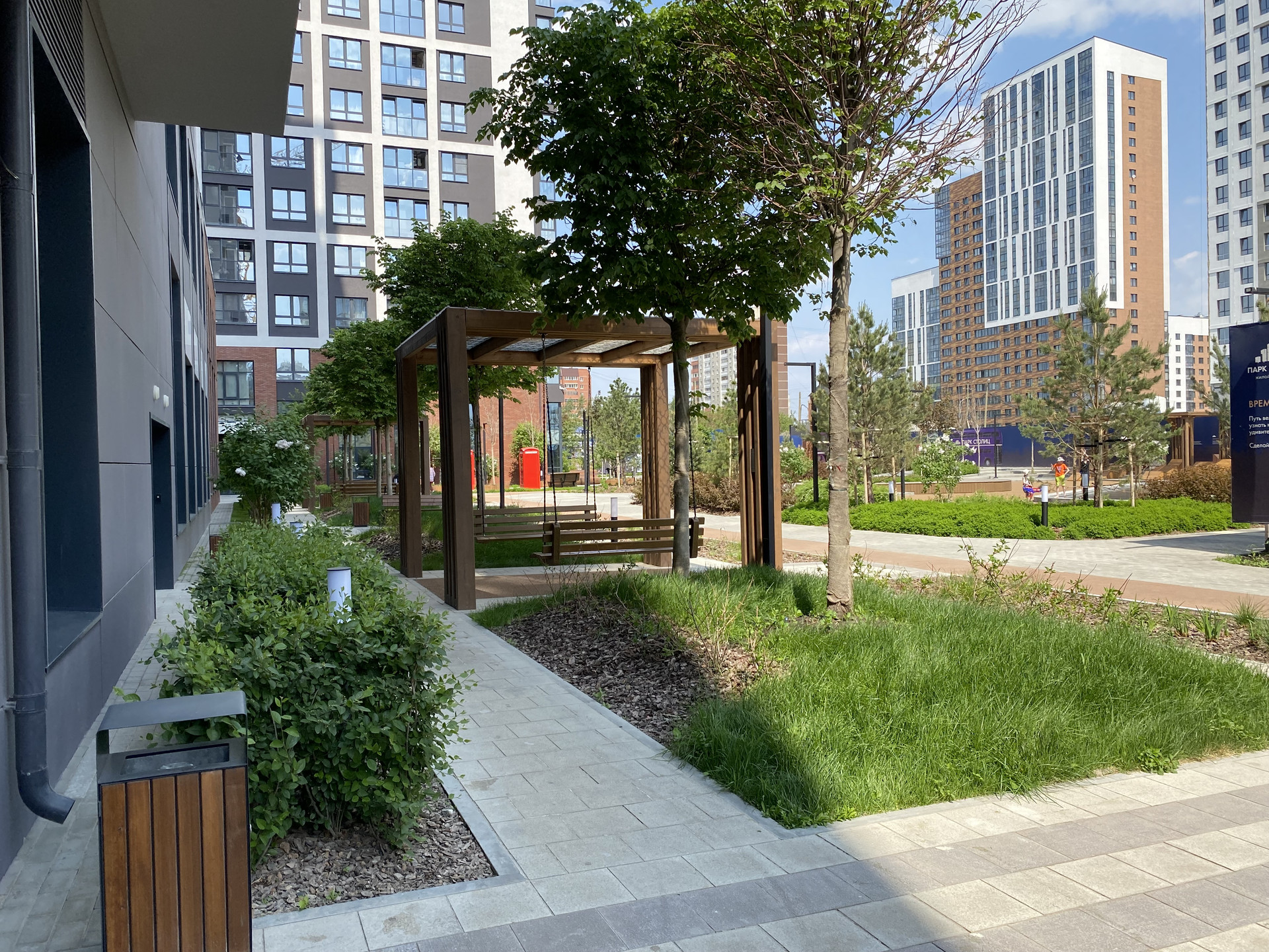 На территории двора организованы - Беговые и велодорожки, собственный водоем с ручьем, детские площадки для разных возрастов и авторские зоны отдыха станут настоящим открытием для всех жителей. В уютных беседках можно почитать книгу в летний день, а на спортплощадке сыграть в баскетбол с детьми.