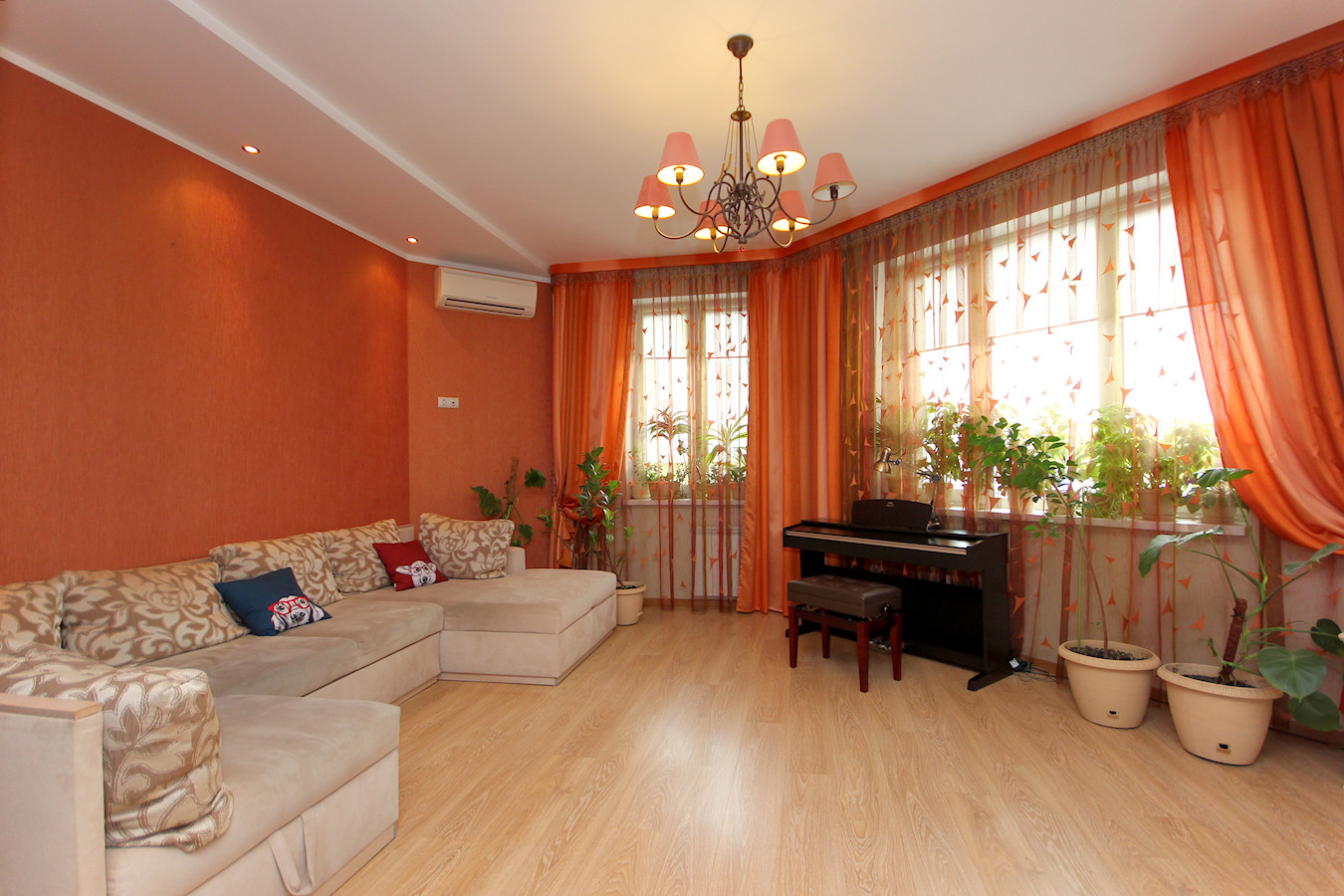 Два совмещенных сан.узла с ванной и душевой. Двухуровневые потолки, на полу - паркет, керамогранит. Есть кондиционер. Окна выходят на разные стороны, при этом очень тихо, дом расположен в глубине квартала самого центра города, вдали от шумных дорог.