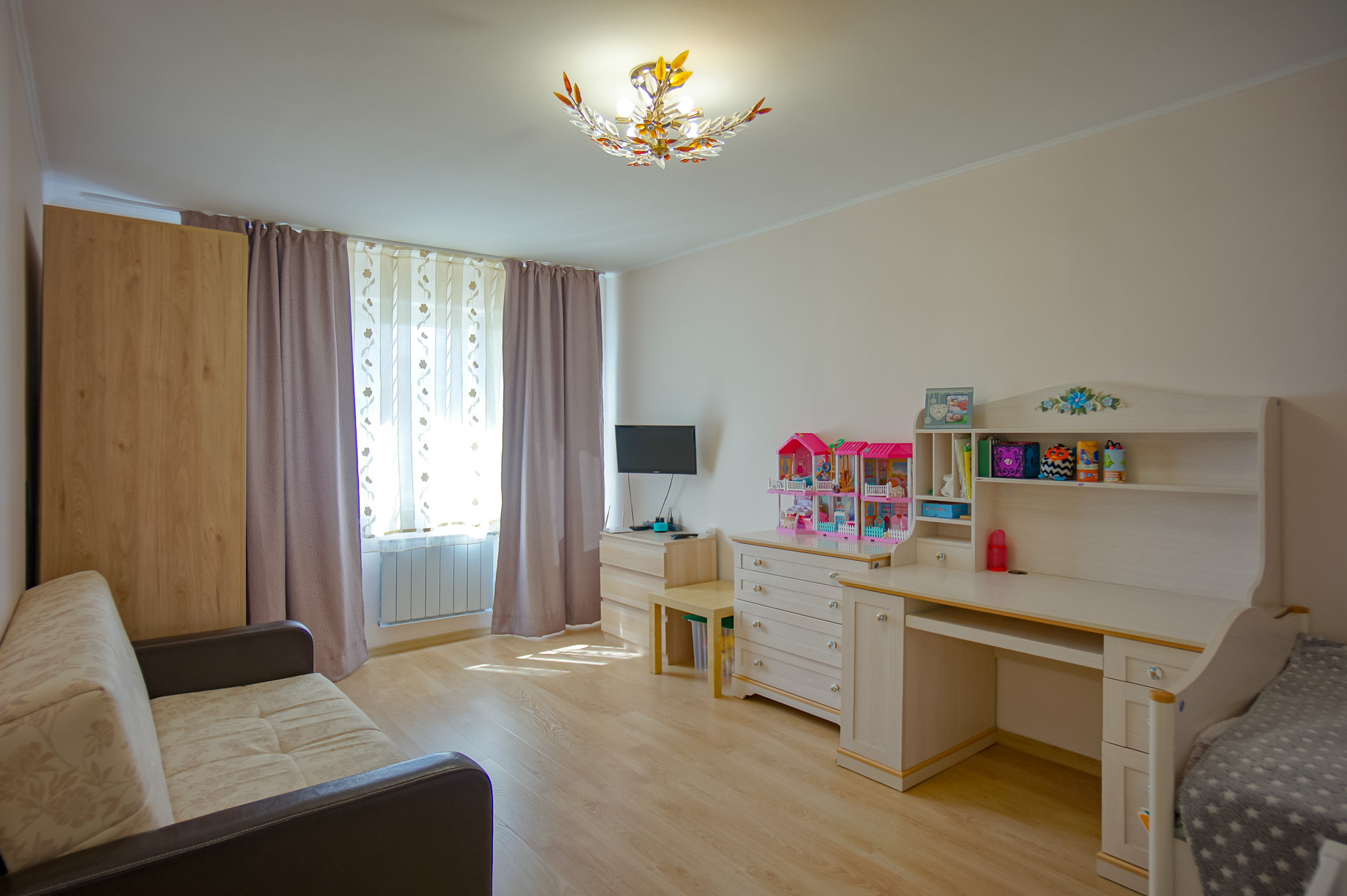 Комната и кухня правильной формы , что позволяет эффективно использовать пространство.