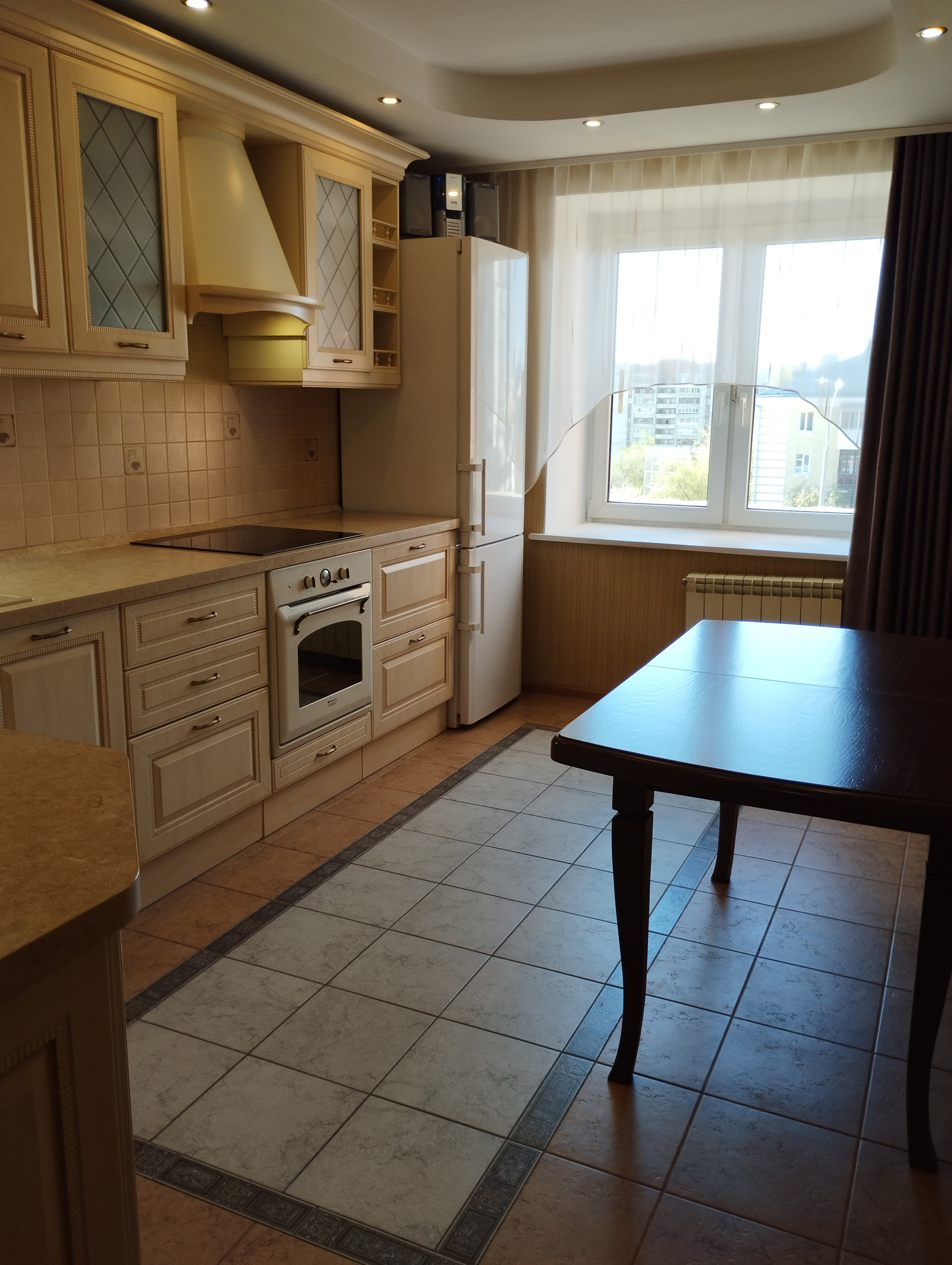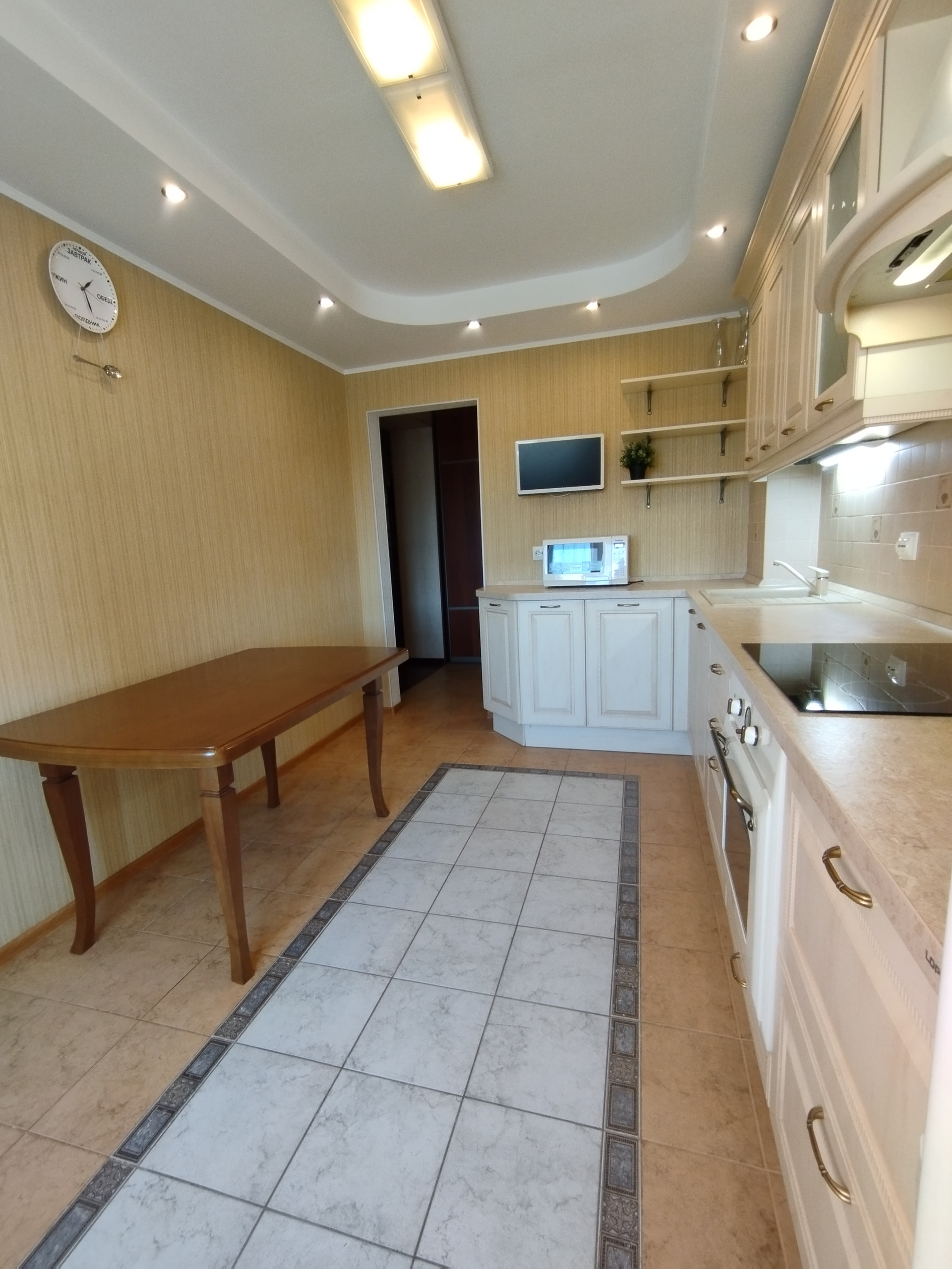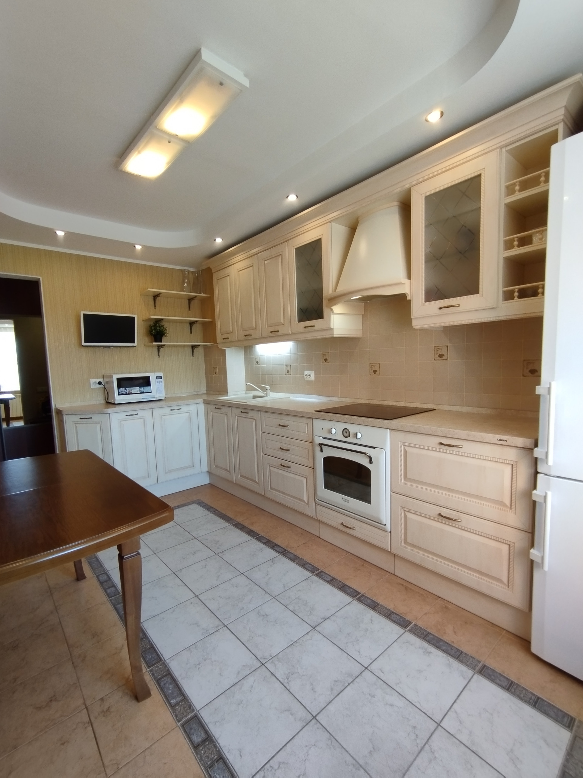 - В кухне гарнитур LORENA с встроенной техникой: духовой шкаф и индукционная варочная панель ARISTON, вытяжка, посудомойка BOSCH, фильтр воды.