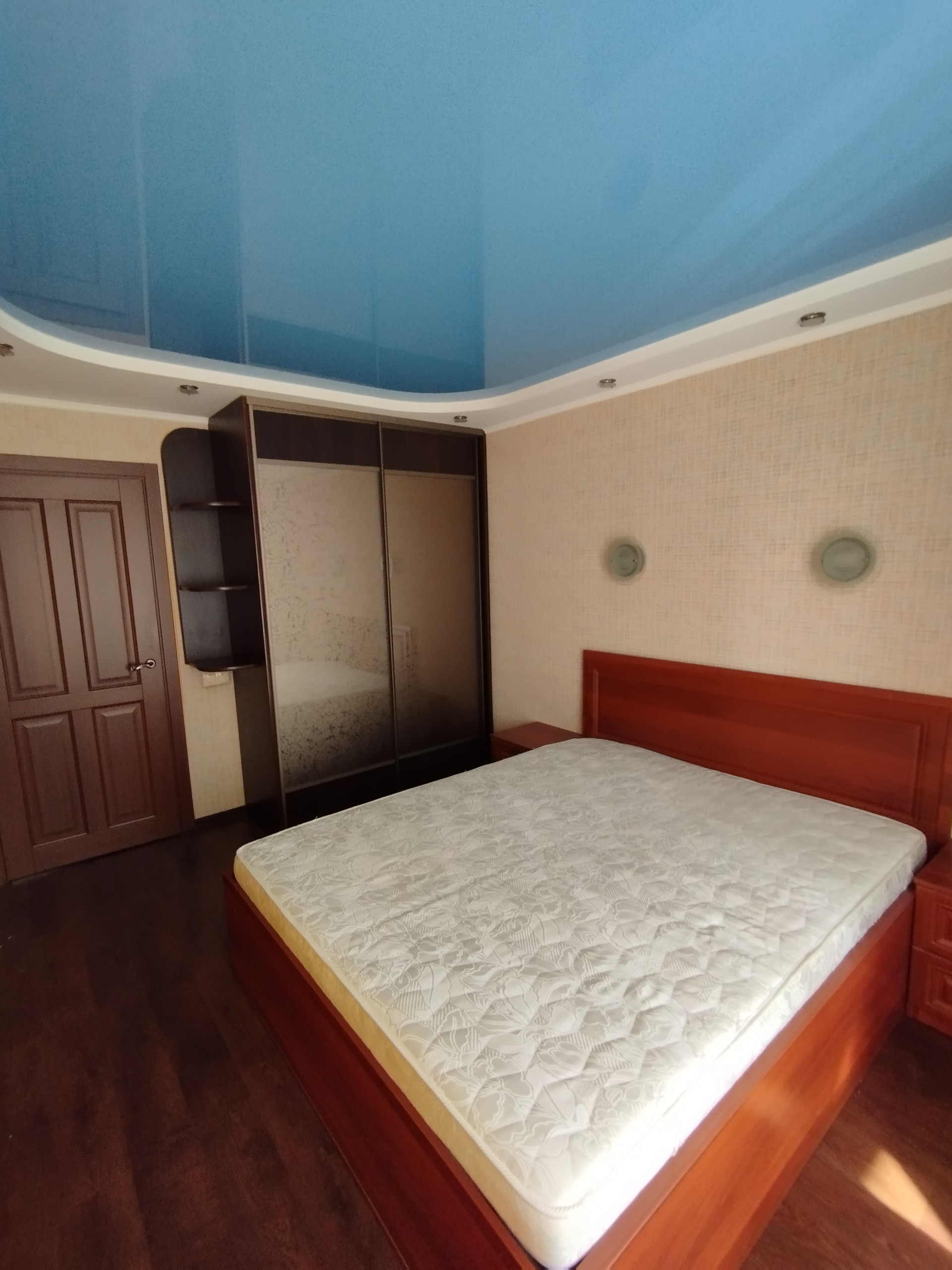 - Пол ламинат и керамогранит, потолки натяжные в спальнях, на кухне навесной.