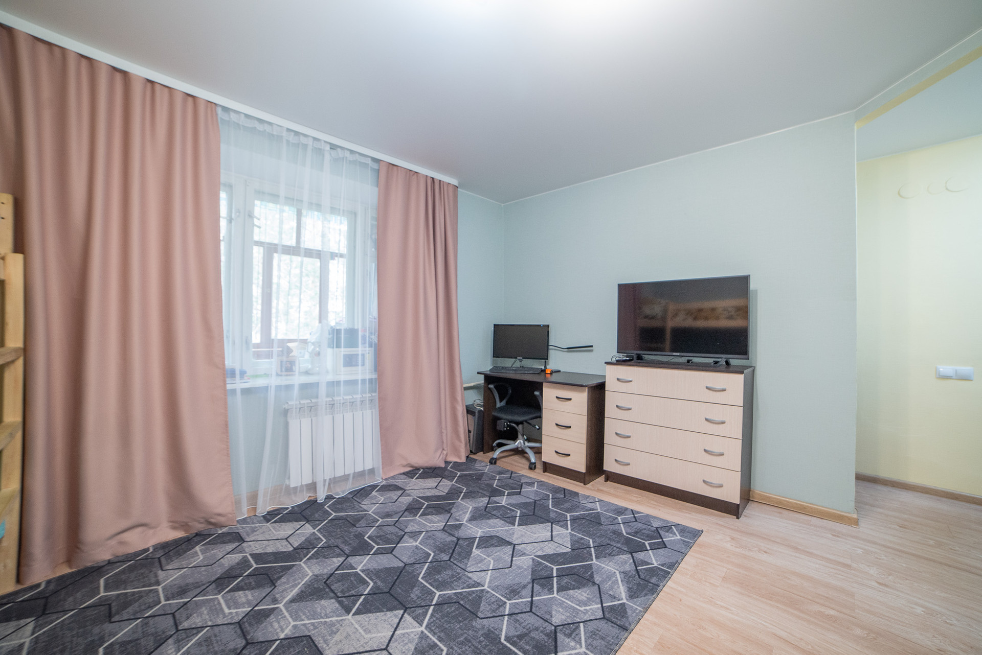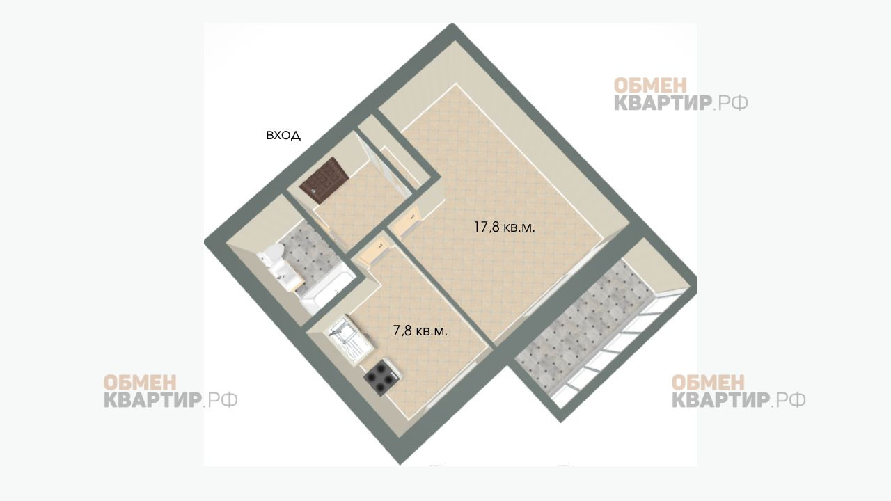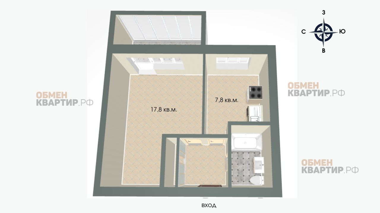 Грамотная планировка квартиры состоит из прихожей, в которой расположена вместительная гардеробная, просторной кухни с новым кухонным гарнитуром, и большой, удобной комнаты с выходом на застекленный балкон.