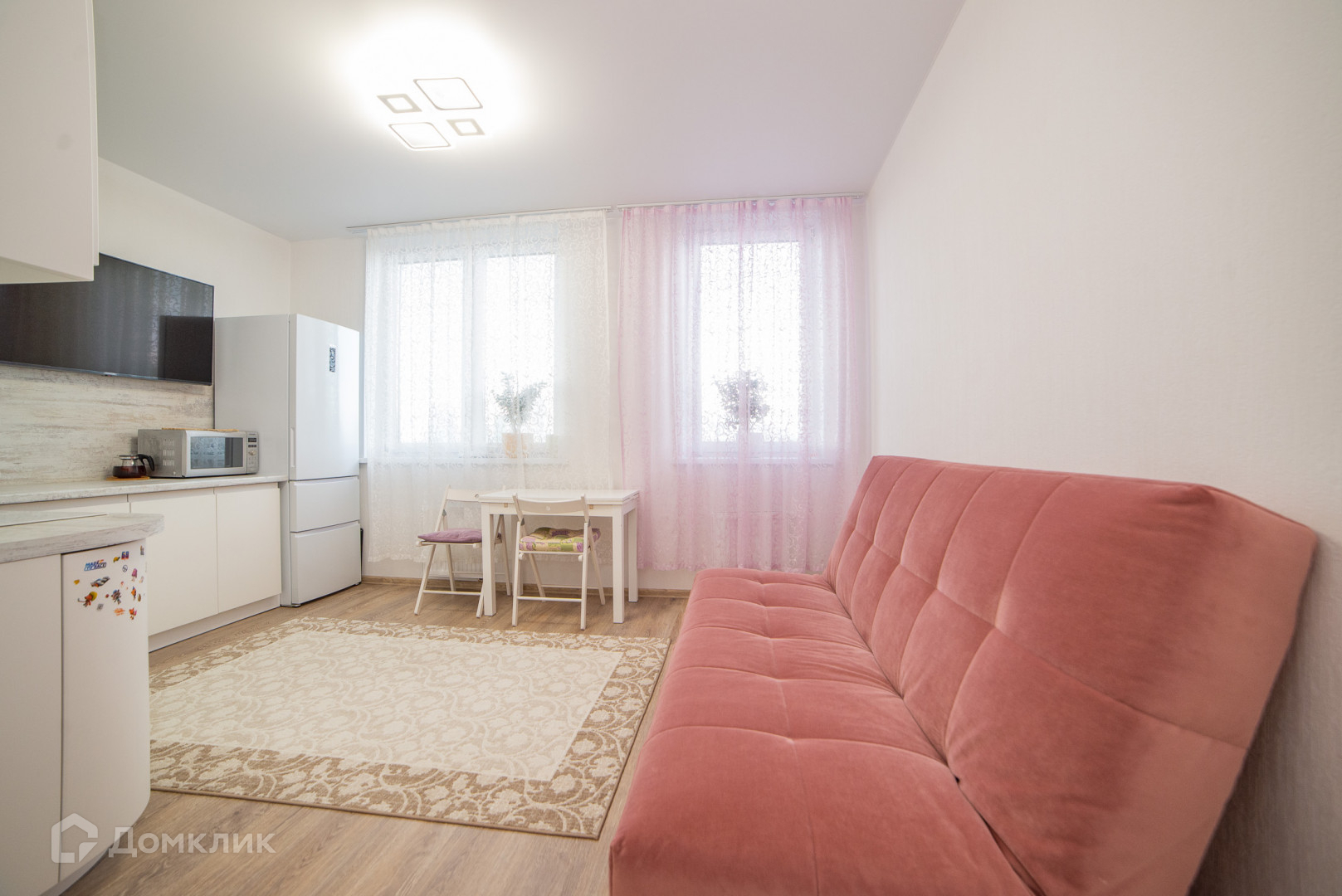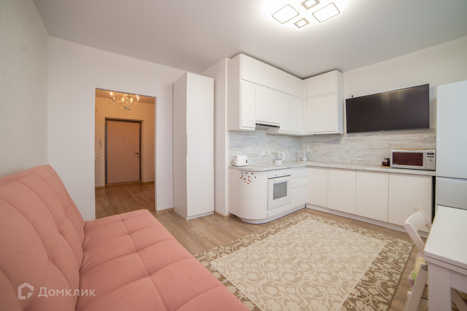 Интерьер выполнен в светлых, приятных тонах. Новый кухонный гарнитур с дорогой техникой и холодильником оставим новому собственнику. Удачная планировка - большие и квадратные пространства, много воздуха и света.