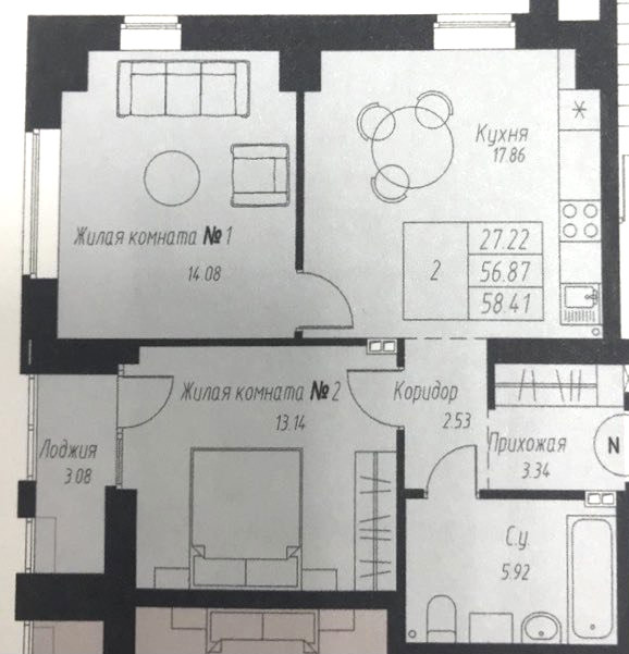 Общая площадь 58 м2