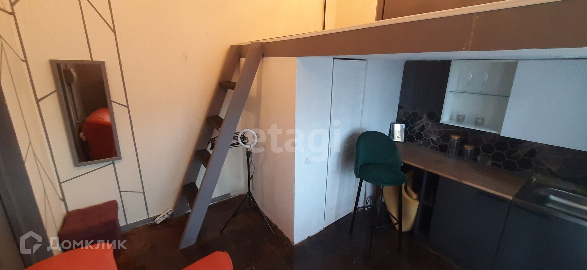 Студия меблирована - кухонный гарнитур, диван, и другие предметы, все что на фотографиях, все остается.