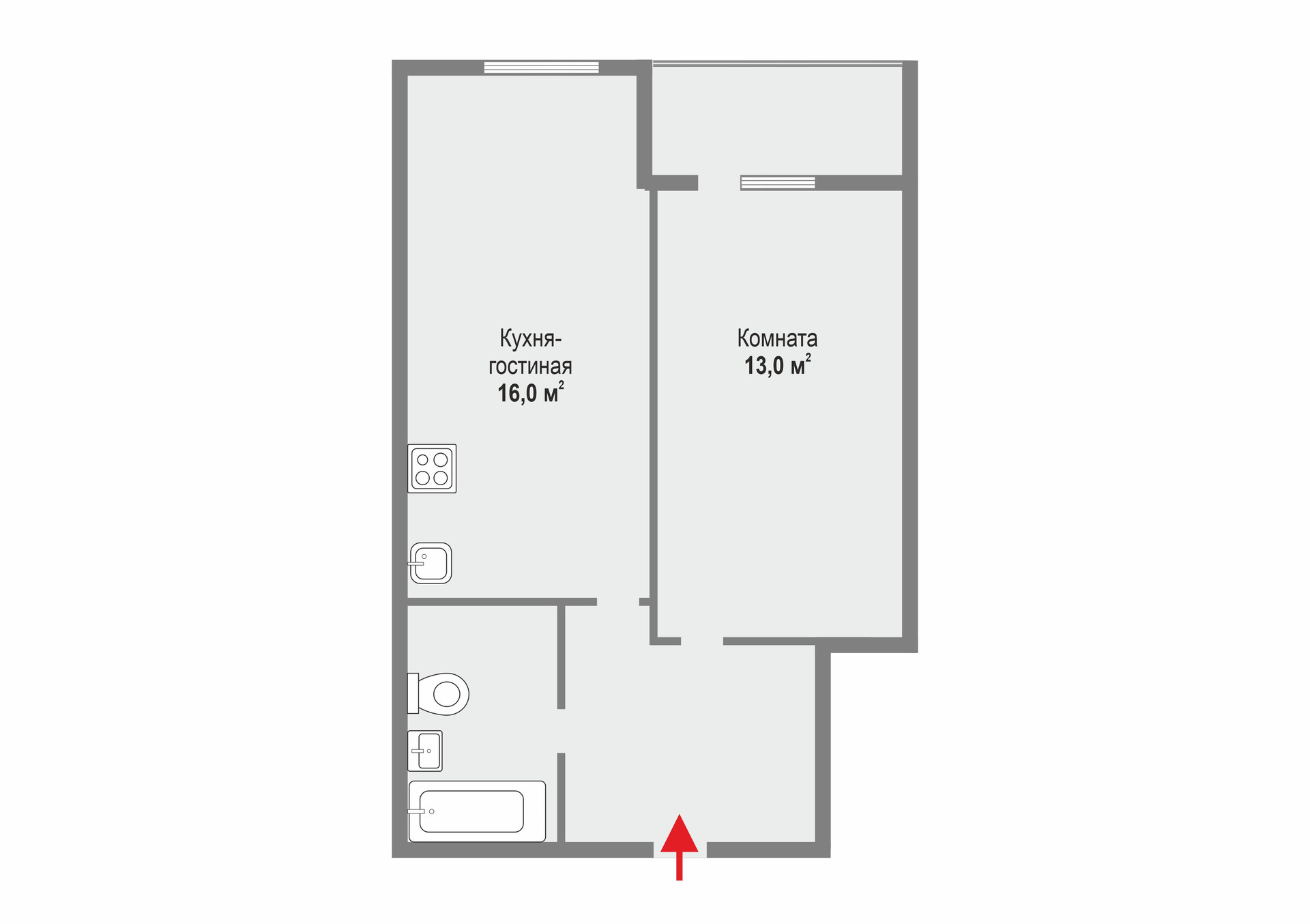 Самая актуальная и функциональная планировка квартиры- «евродвушка» (40 кв.м. по документам,без учета лоджии): кухня-гостиная  16 метров, где разместится и зона кухни, и зона отдыха с диваном и телевизором;  спальня 13 метров. В коридоре есть ниша под большой шкаф-купе, просторный санузел (см. планировку).
