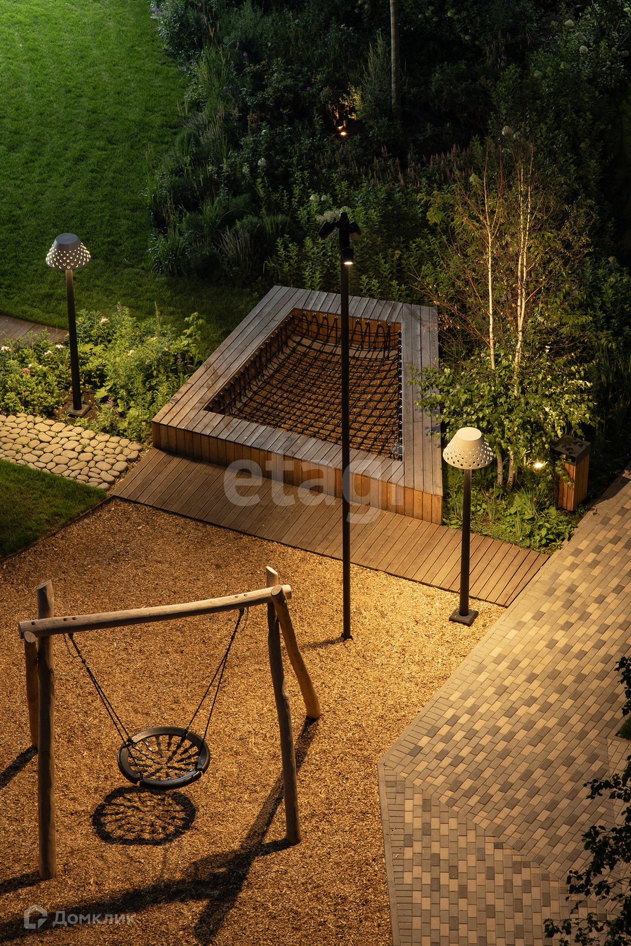 Закрытый двор оснащен современной детской площадкой, спортивным кортом, тренажерами и зонами отдыха для взрослых