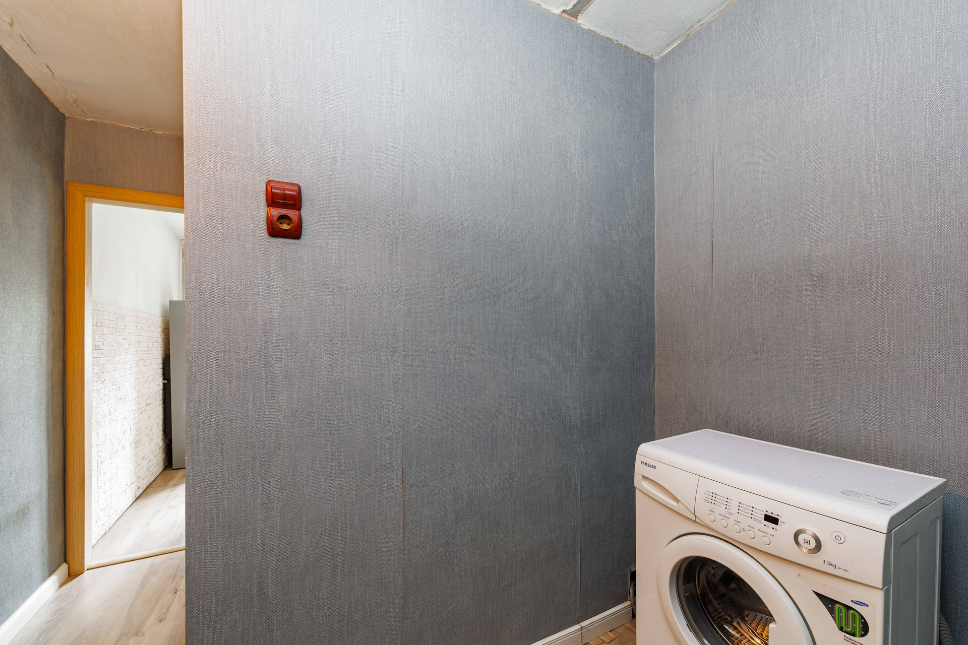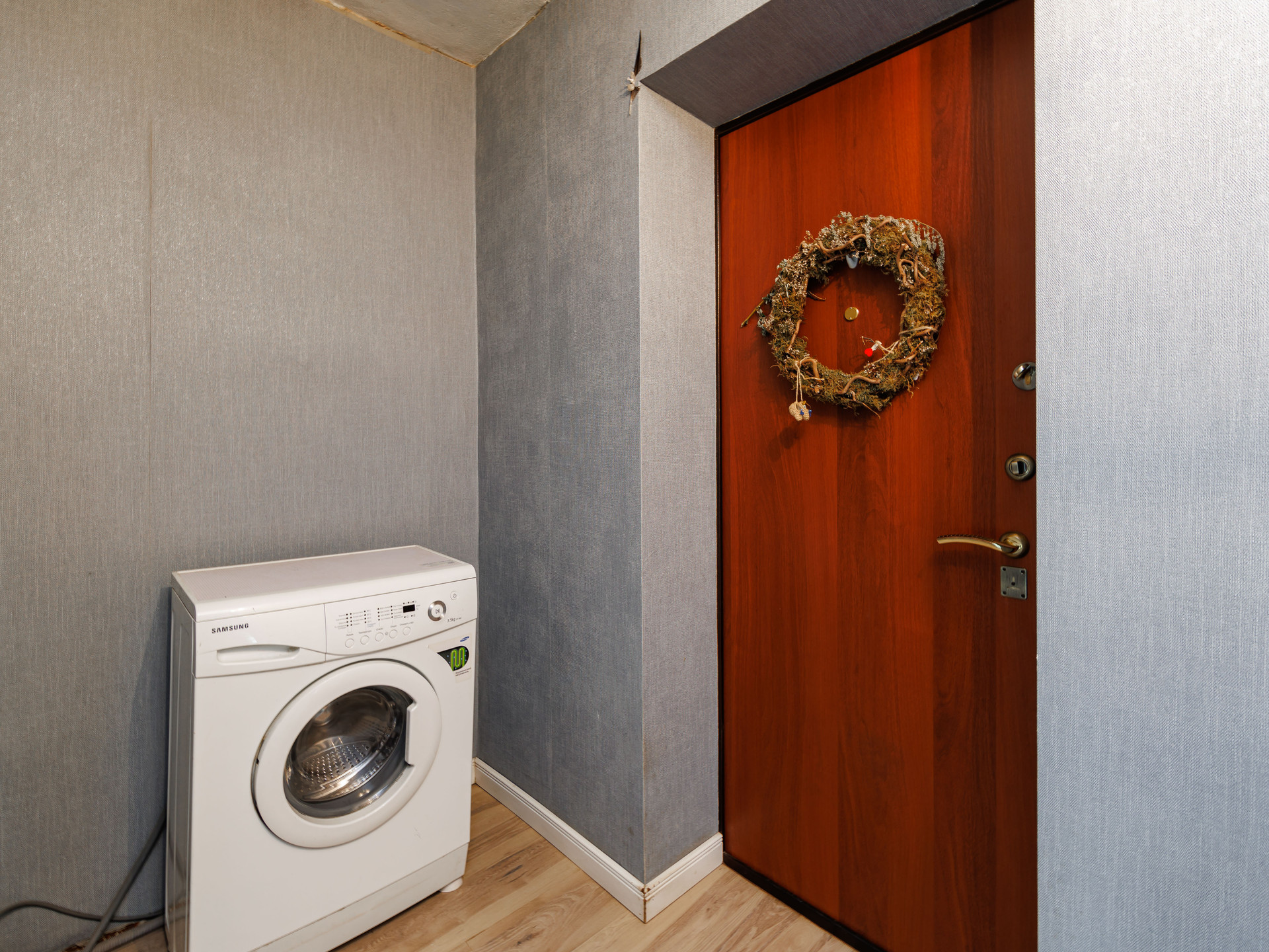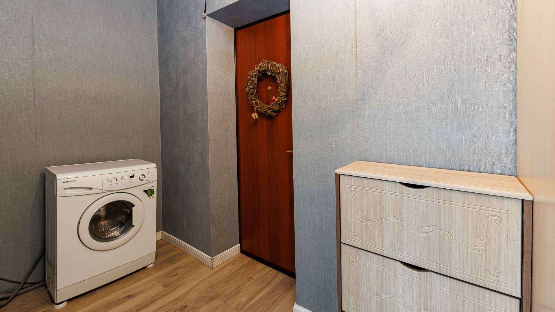 Оставляем большую двуспальную кровать и вместительный шкаф в гостиной, прихожую, кухонный гарнитур и стиральную машину.
