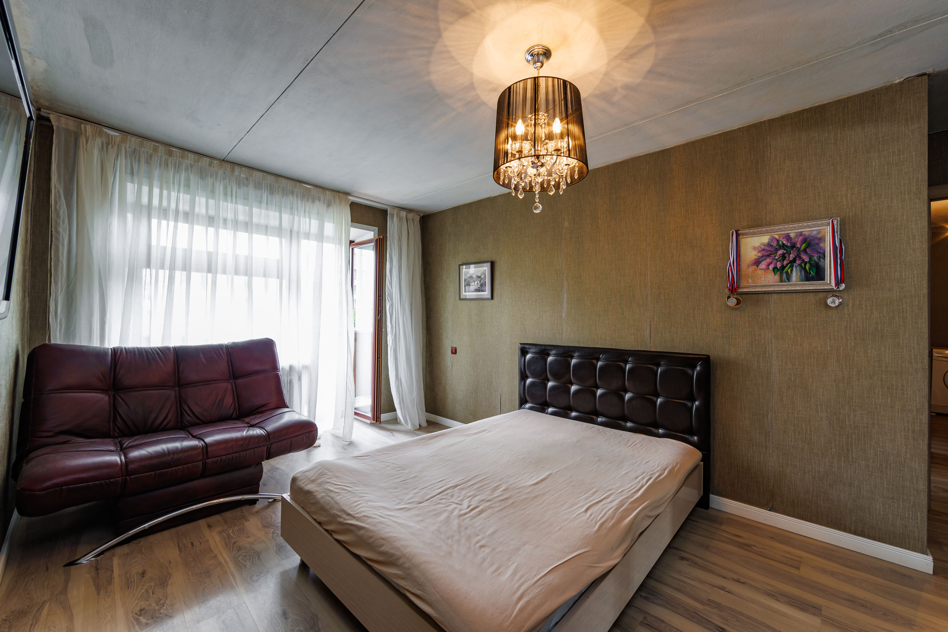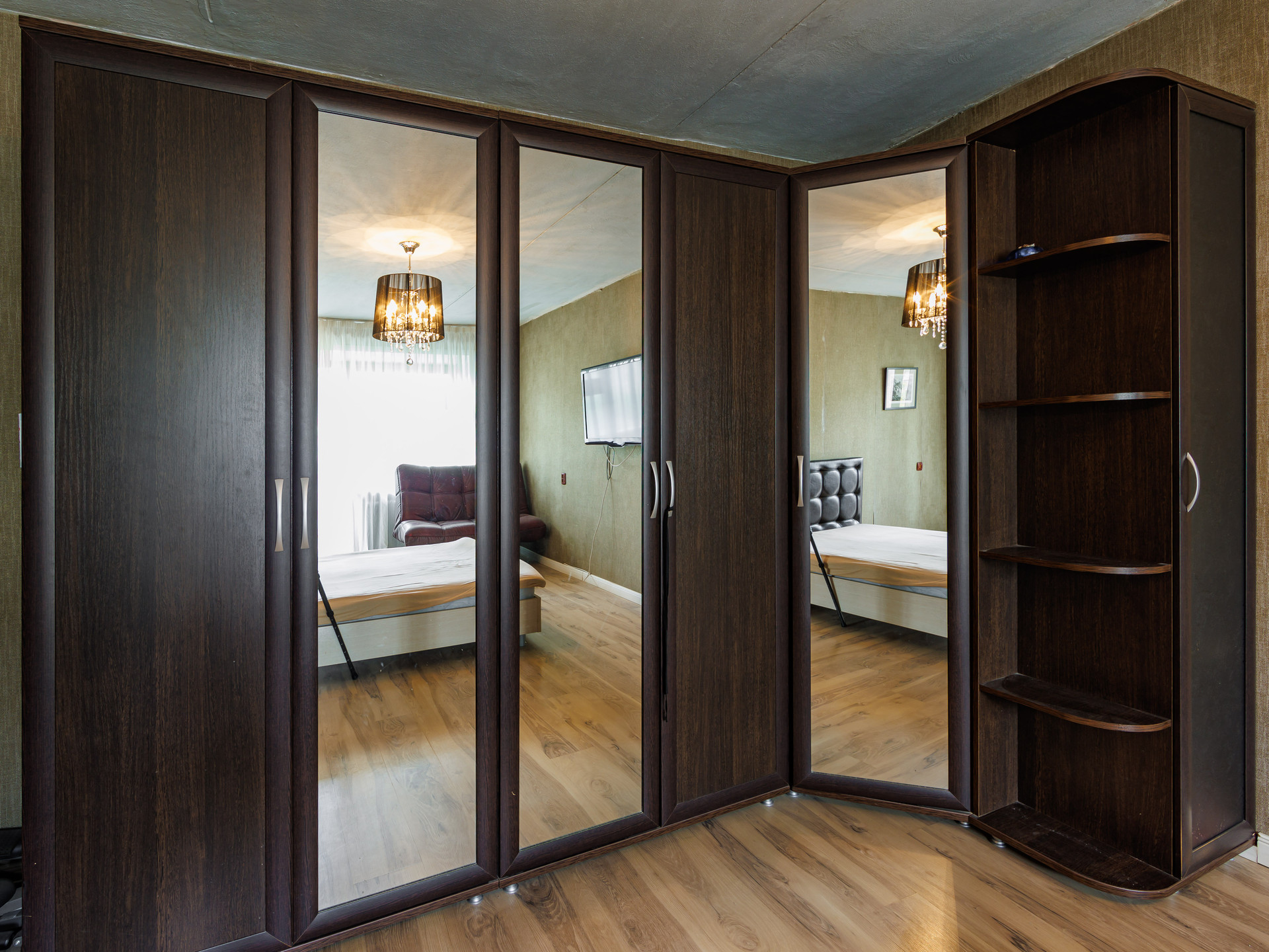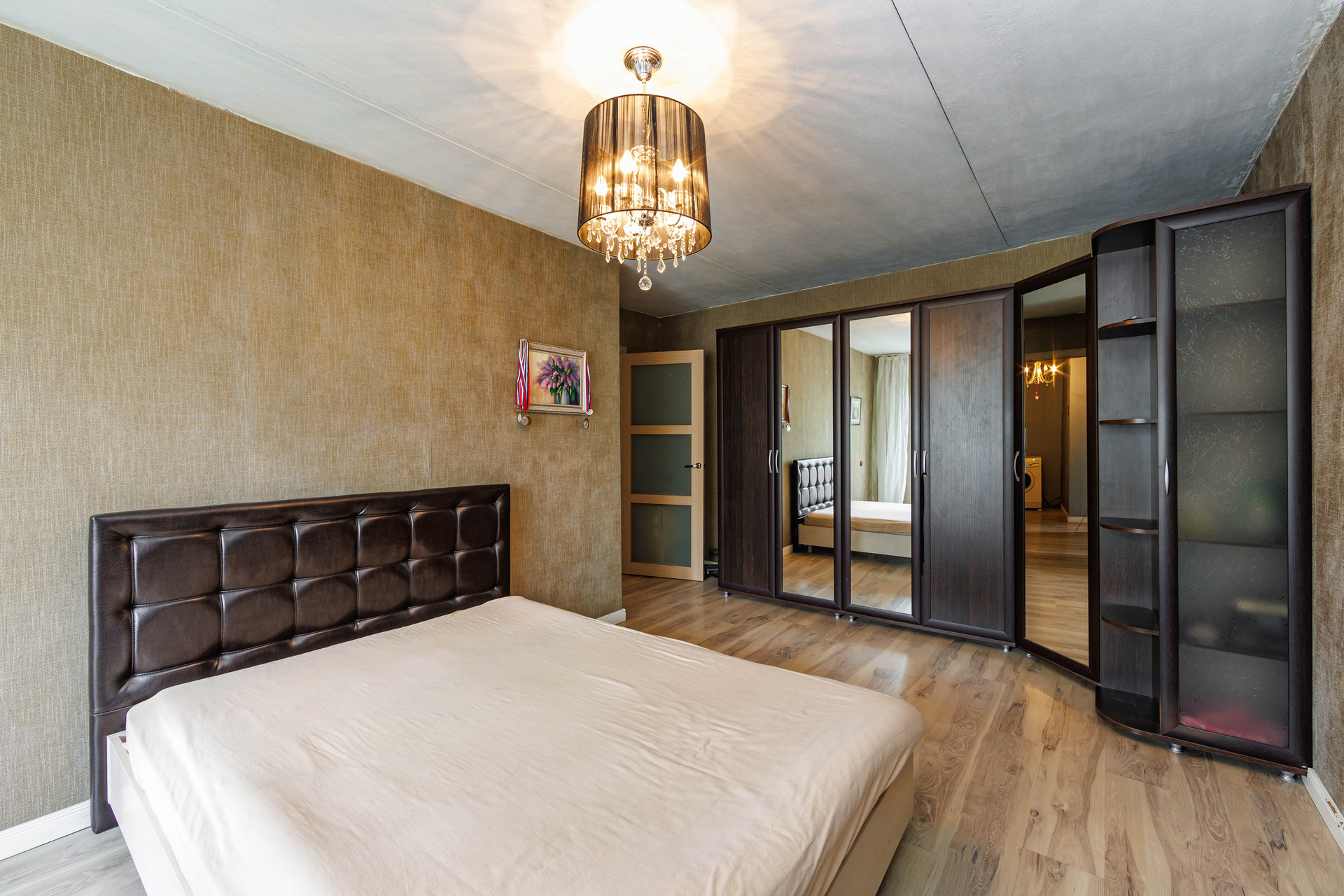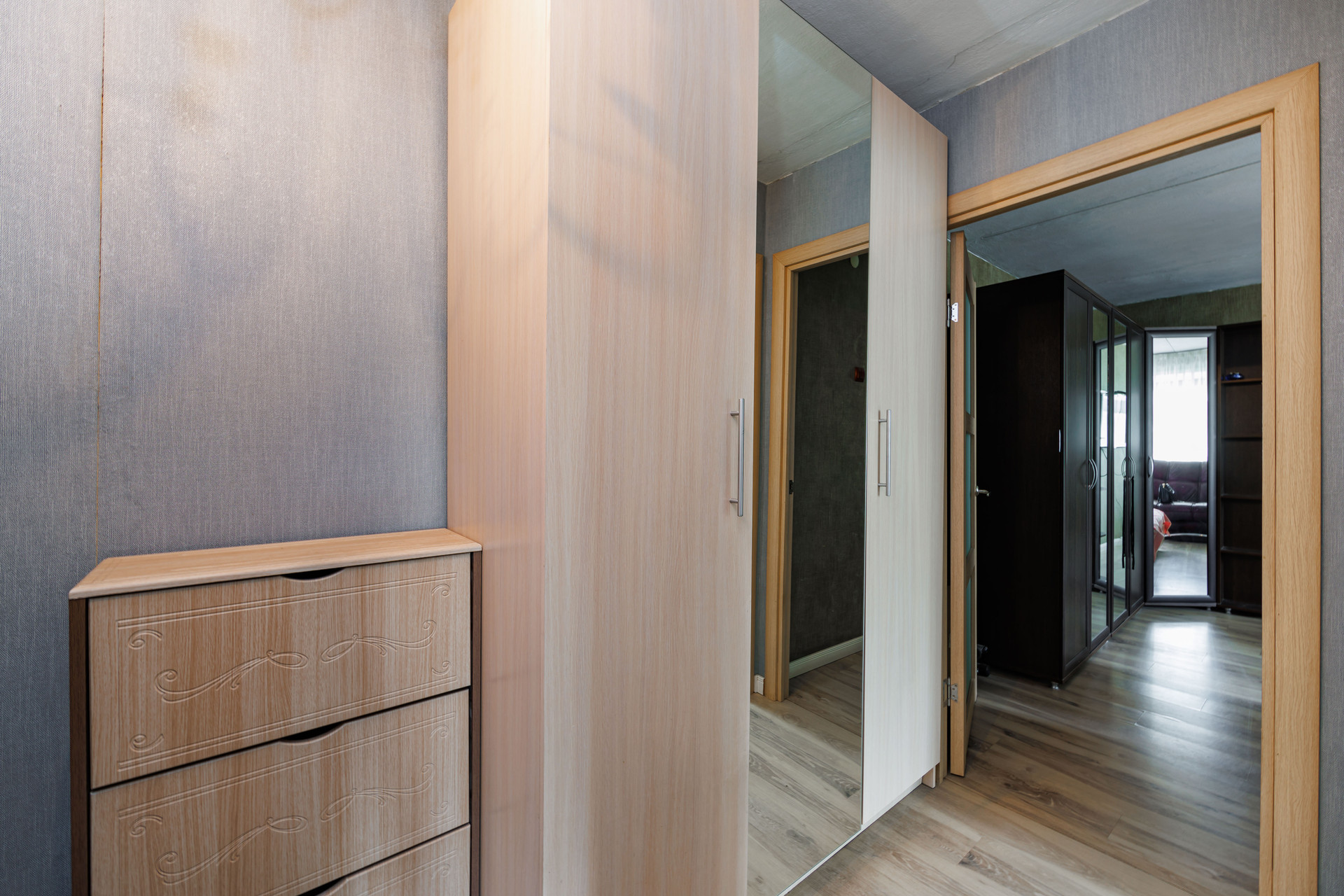 Оставляем большую двуспальную кровать и вместительный шкаф в гостиной, прихожую, кухонный гарнитур и стиральную машину.