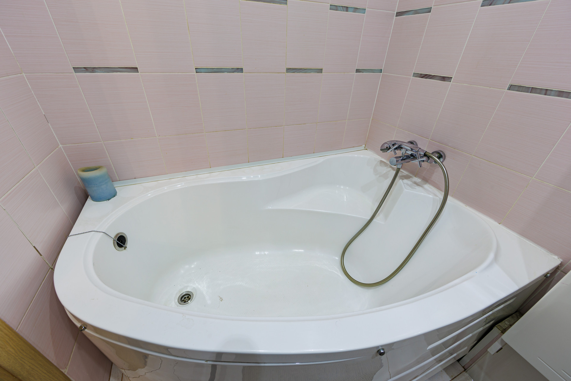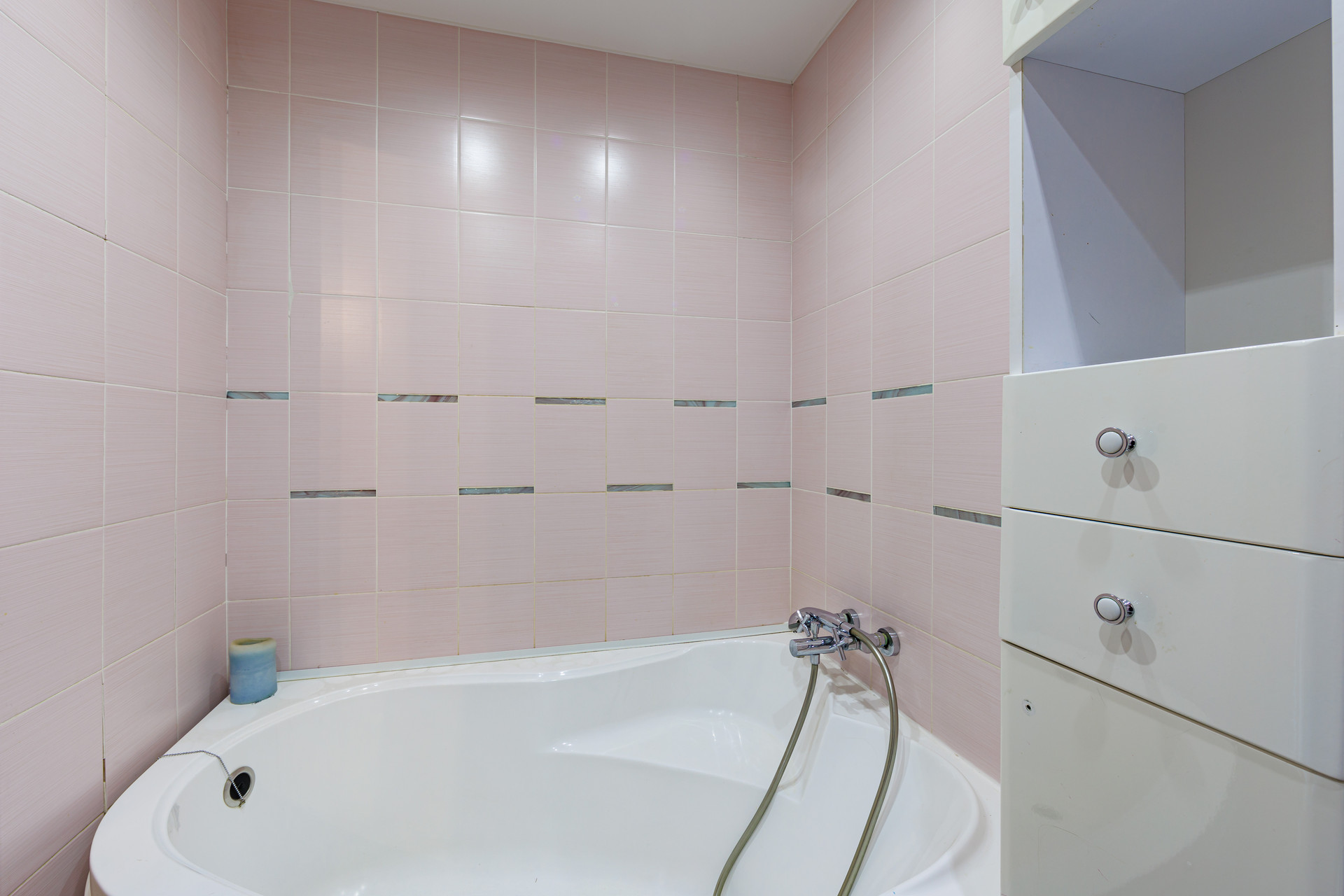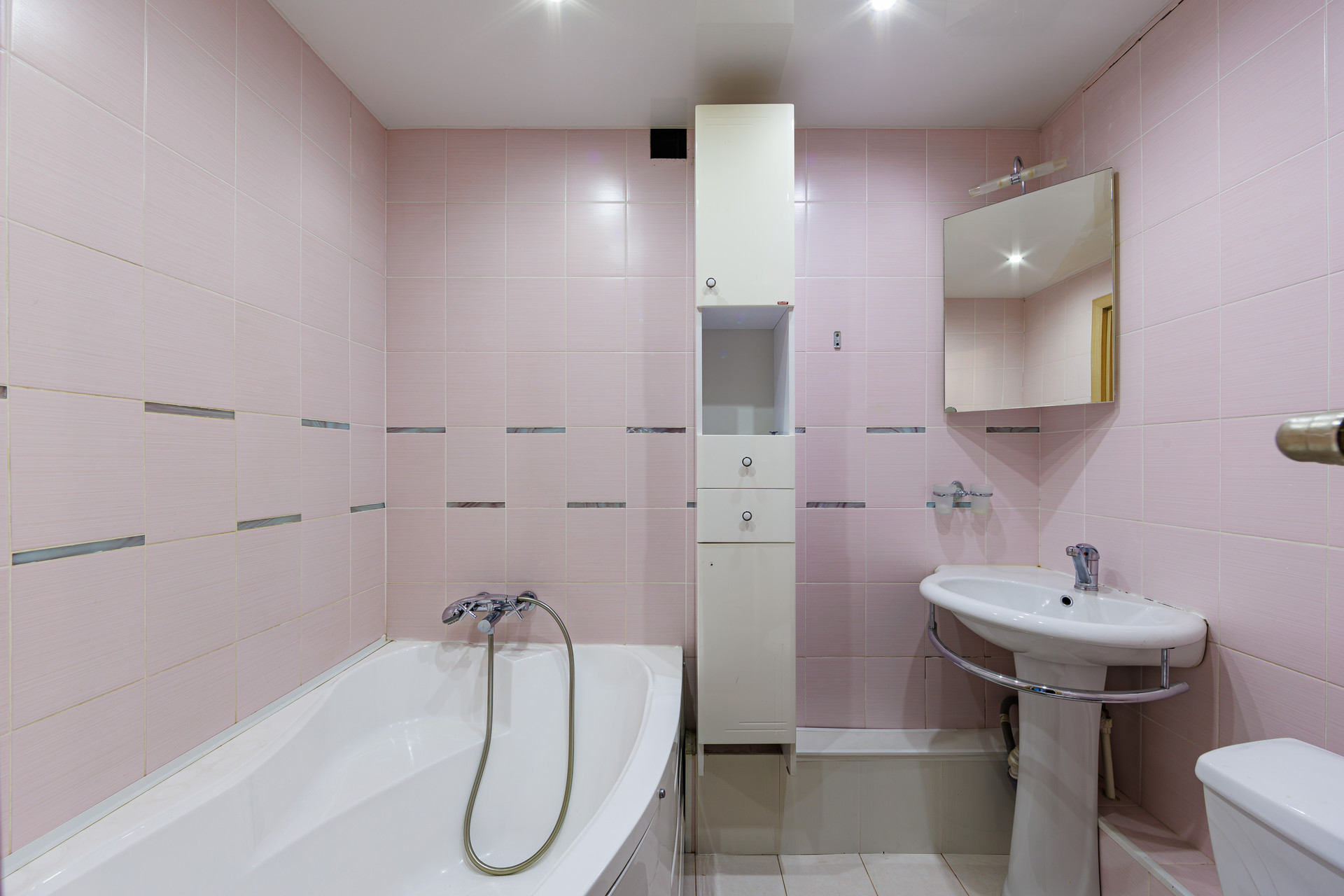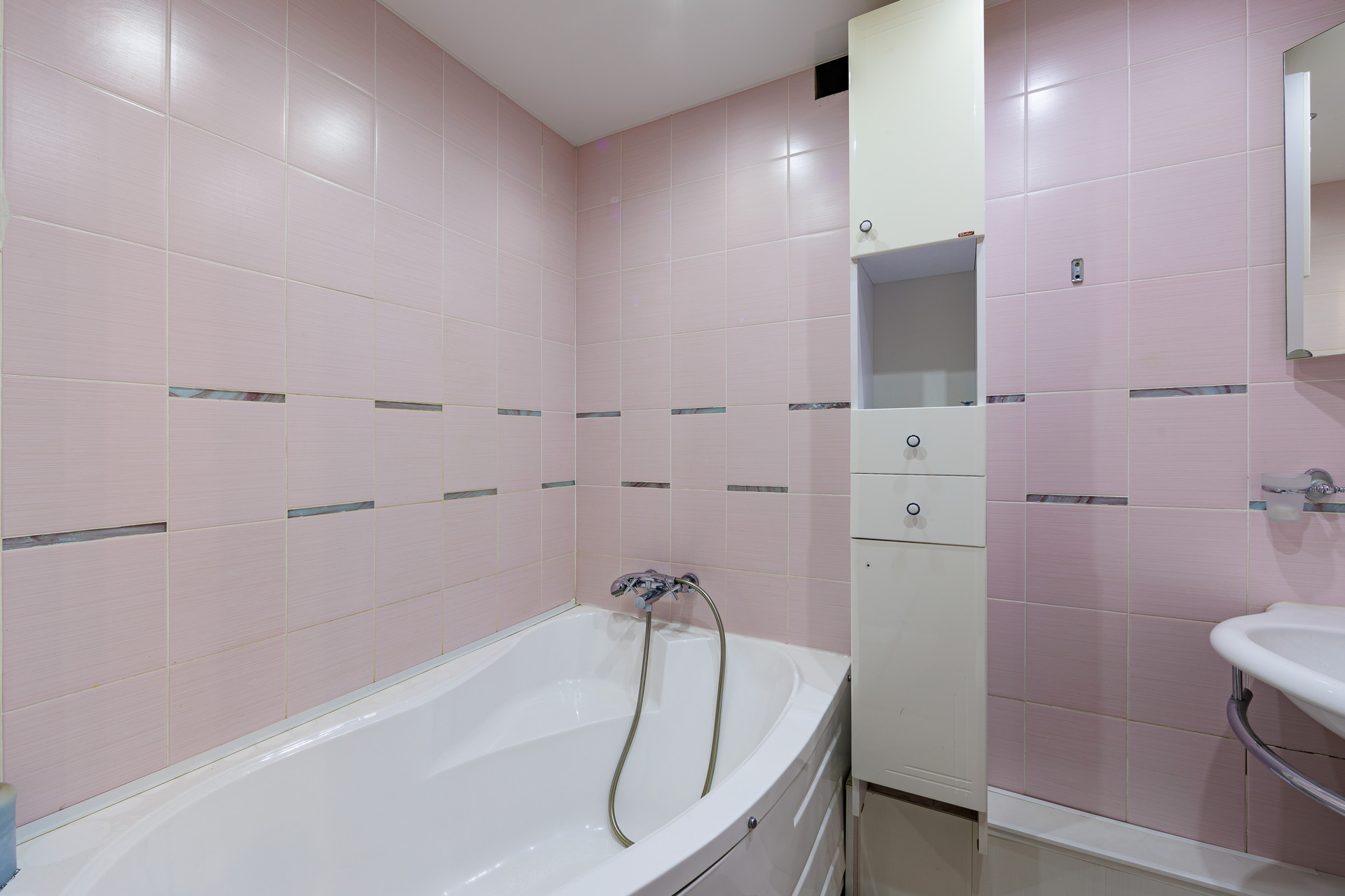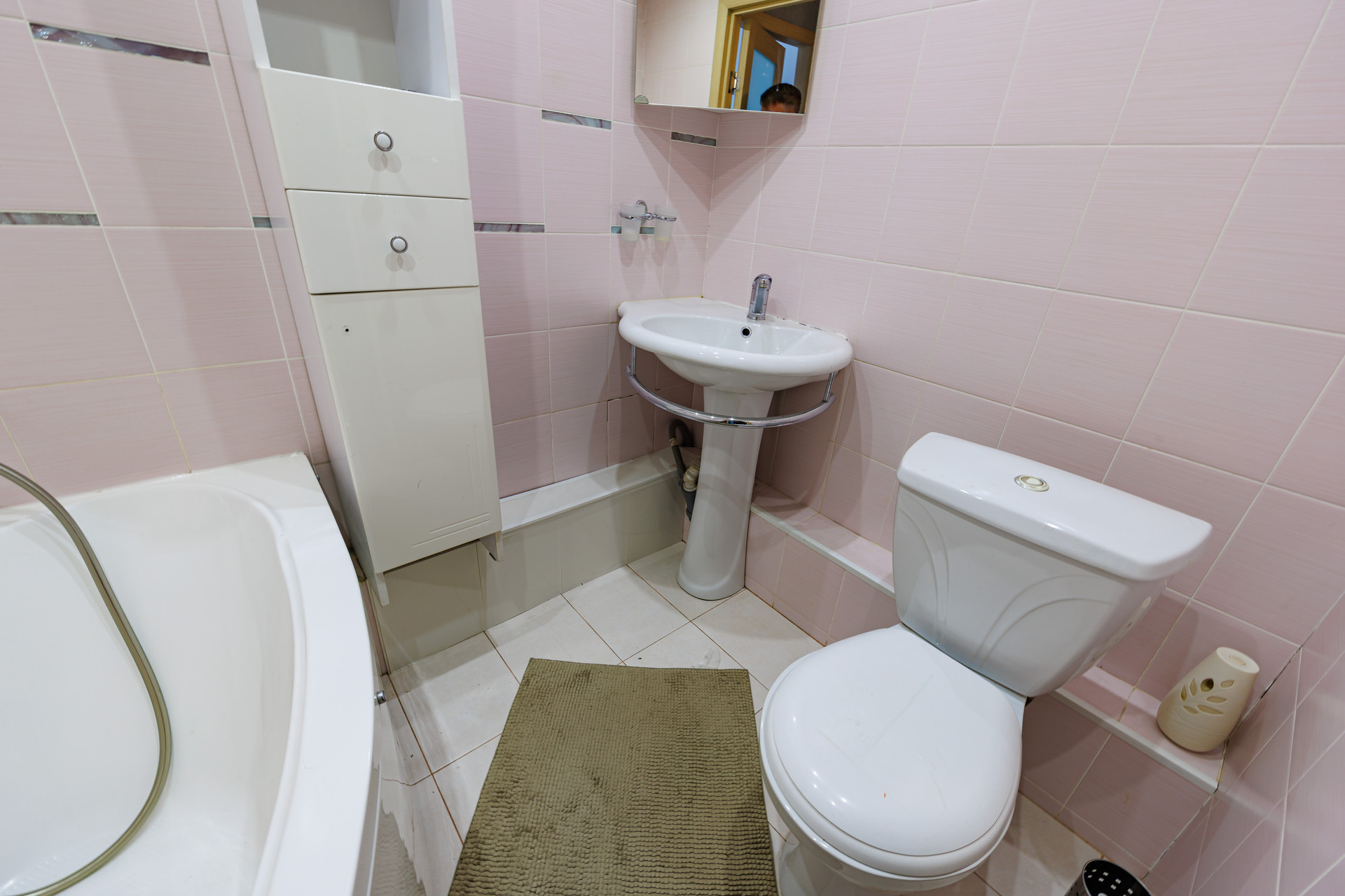 - Санузел совмещенный, плитка на полу и стенах, большая ванна.