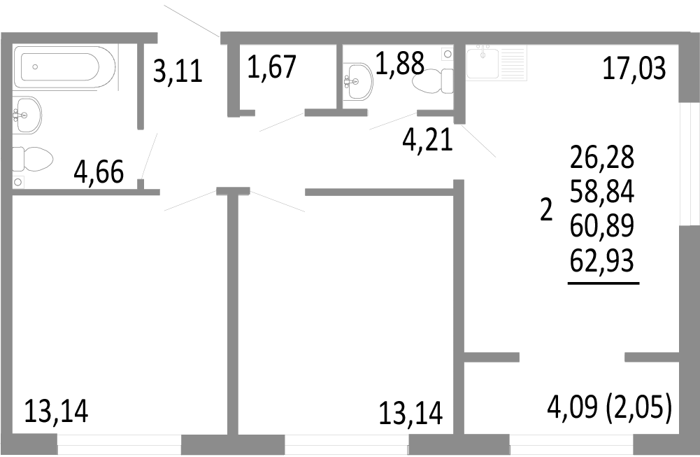 Общая площадь 57.6 м2