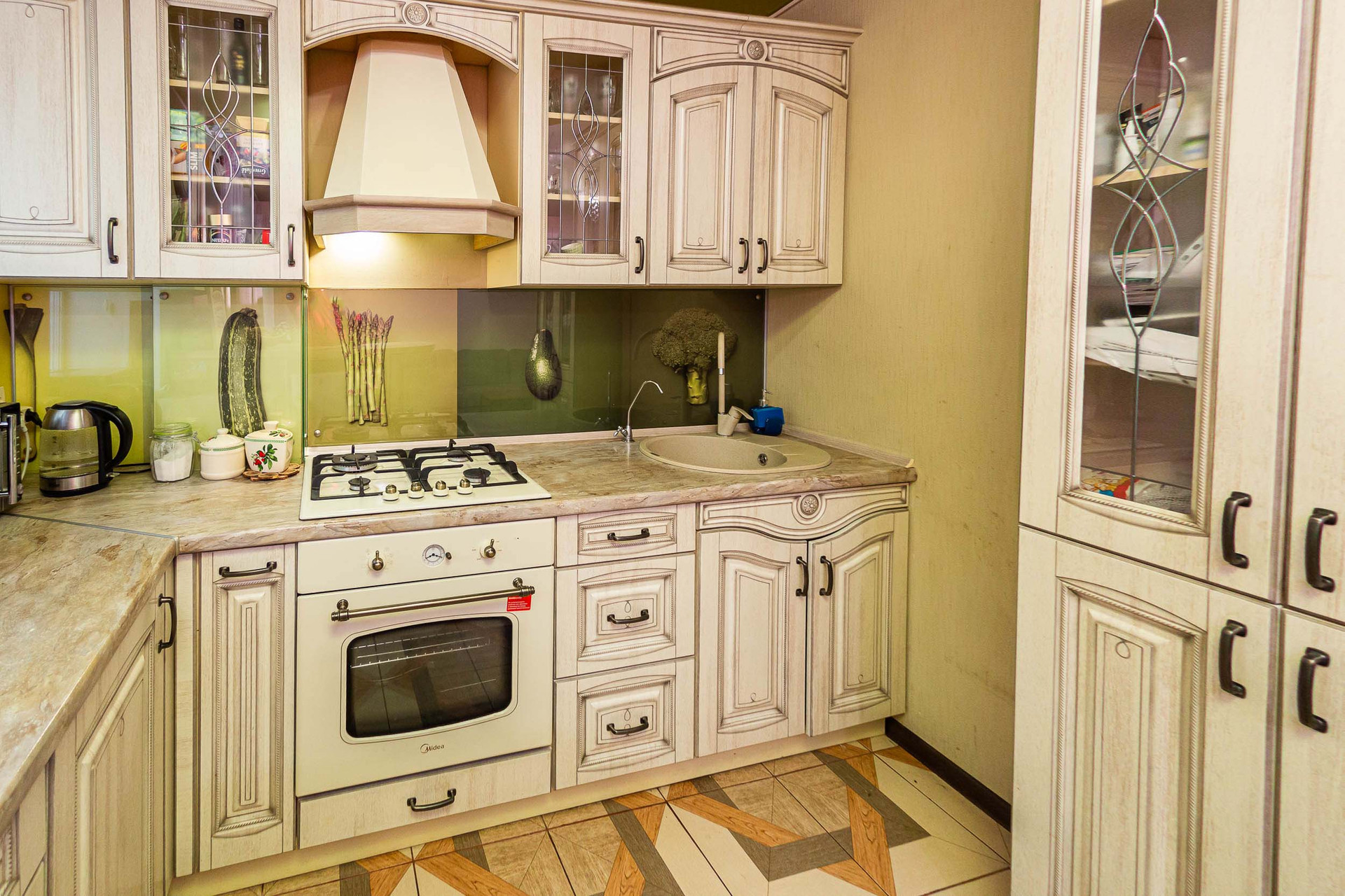В подарок покупателю остается дорогой кухонный гарнитур со встроенной бытовой техникой (варочная панель, духовой шкаф, посудомоечная машина, вытяжка) и  холодильник. По договоренности можно оставить остальную мебель.