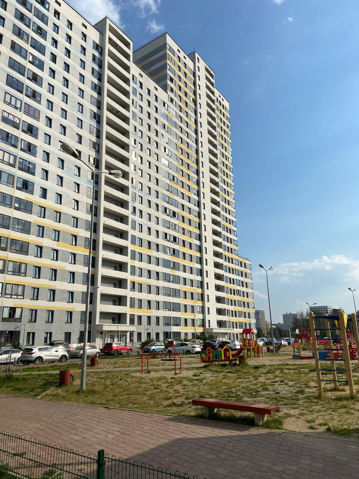 Во дворе дома благоустроены зеленые пешеходные зоны, детские и спортивные площадки.