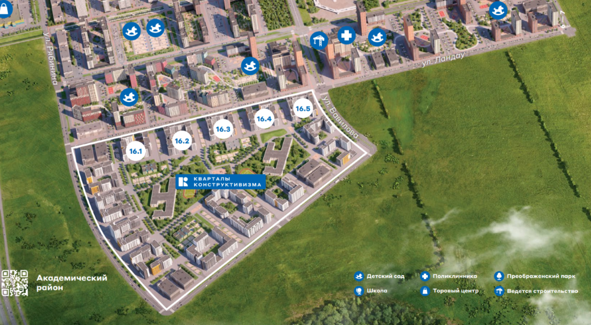 В сформированной инфраструктуре района Академический строится новый ЖК Конструктивизм. Квартал расположен на пересечении улиц Академика Ландау и Вавилова. В настоящее время в шаговой доступности от домов началось строительство новой школы на 1200 мест. Кроме того, проектируется школа, которая расположится на территории Кварталов конструктивизма. В соседнем квартале Eleven уже введены в эксплуатацию детские сады № 43 и № 150, Детская художественная школа №2 им. Г.С. Мосина.