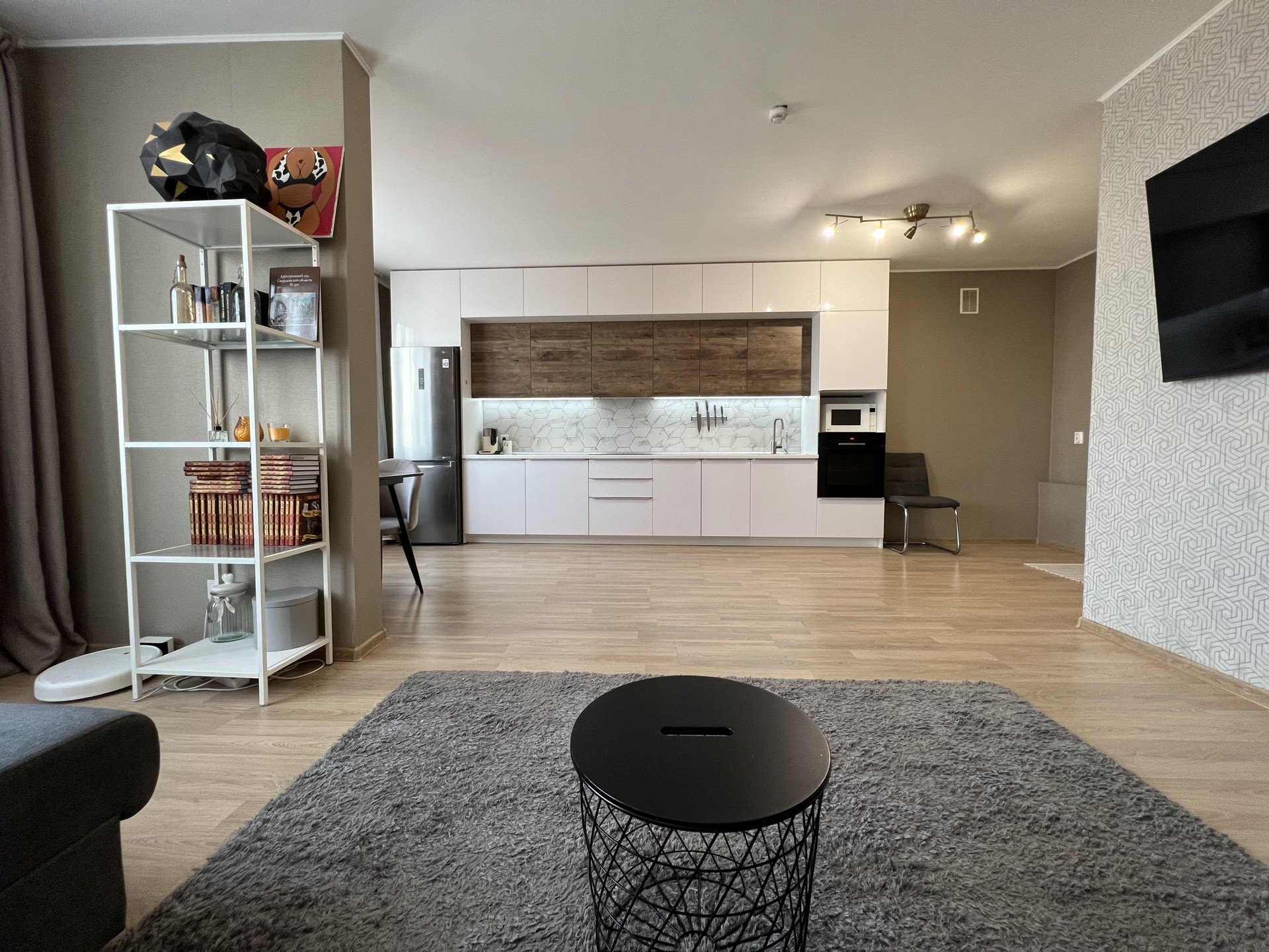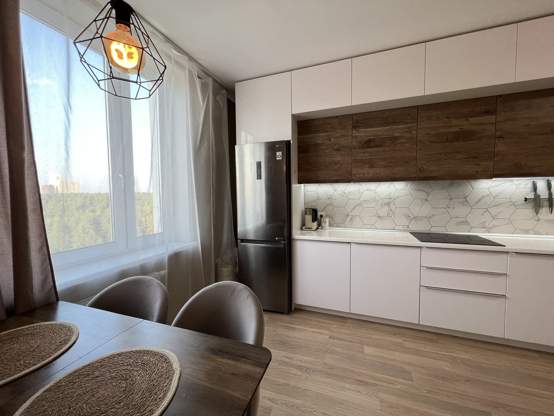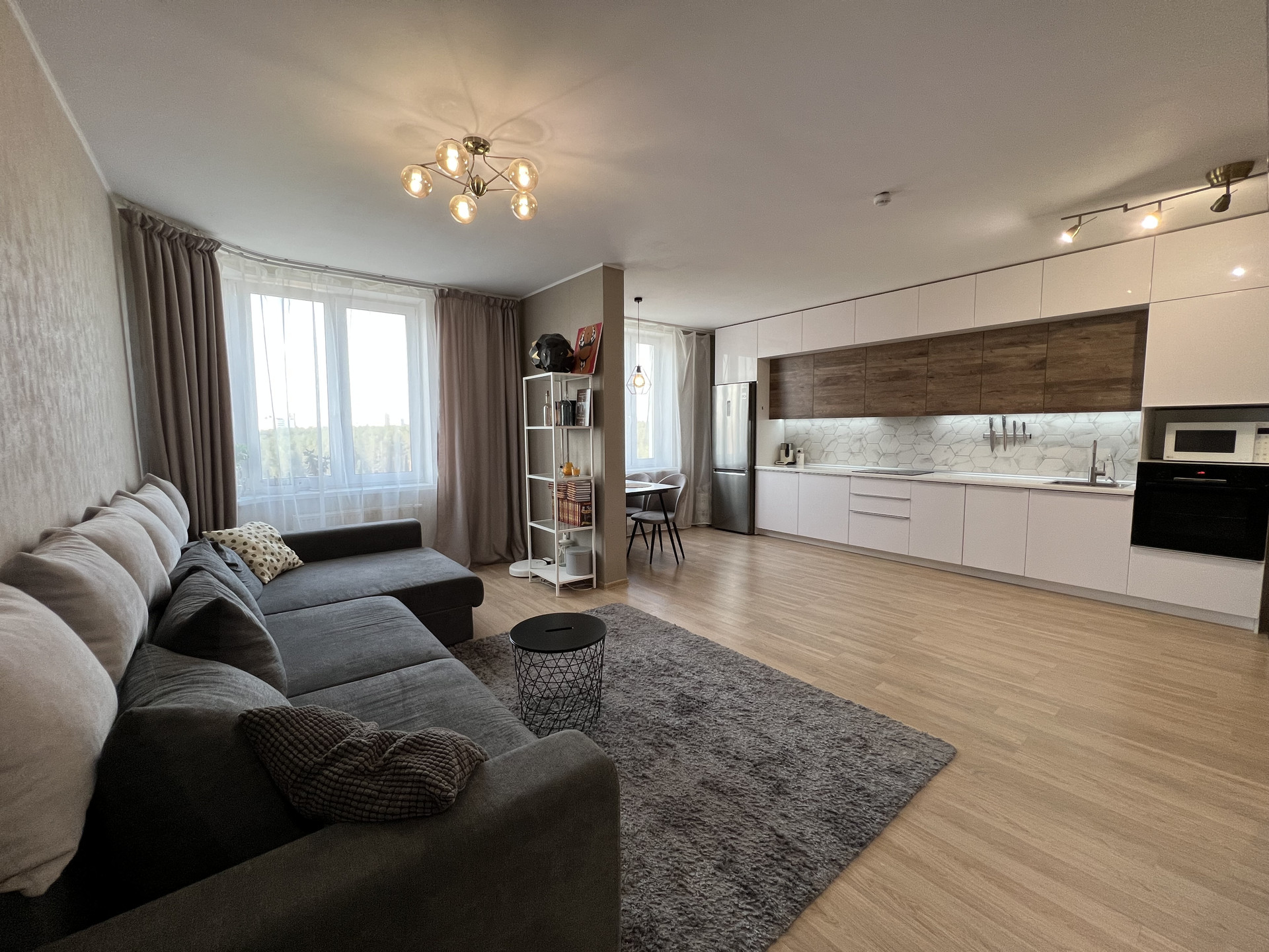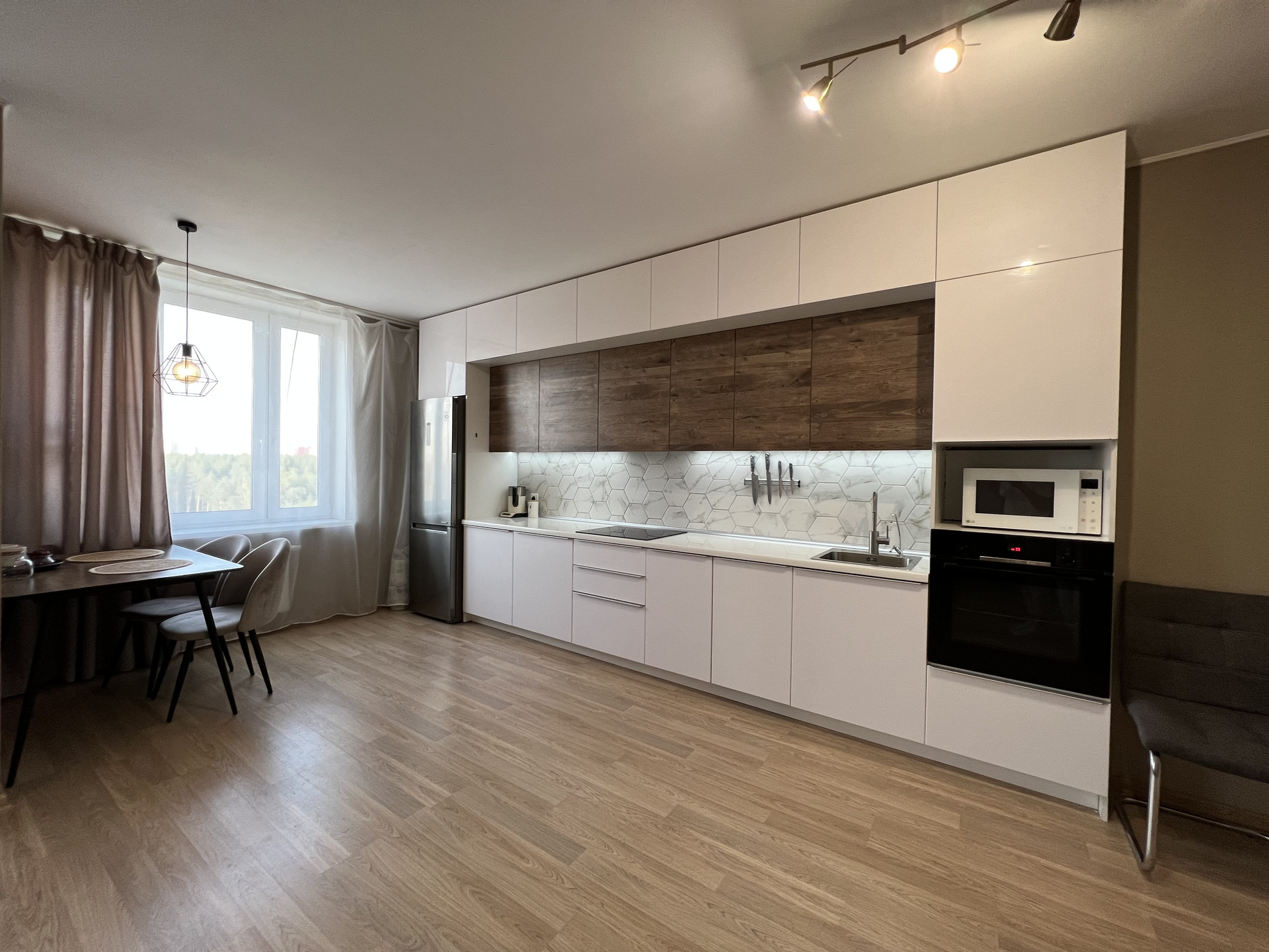 В СТОИМОСТЬ ВХОДИТ: кухонный гарнитур, варочная поверхность Bosch, вытяжка скрытая Maunfeld, духовой шкаф Bosch, микроволновая печь LG, посудомоечная машина Bosch, стол обеденный, два стула. Шторы и люстры, все приборы освещения, зеркала. Сан.техника в комплекте.