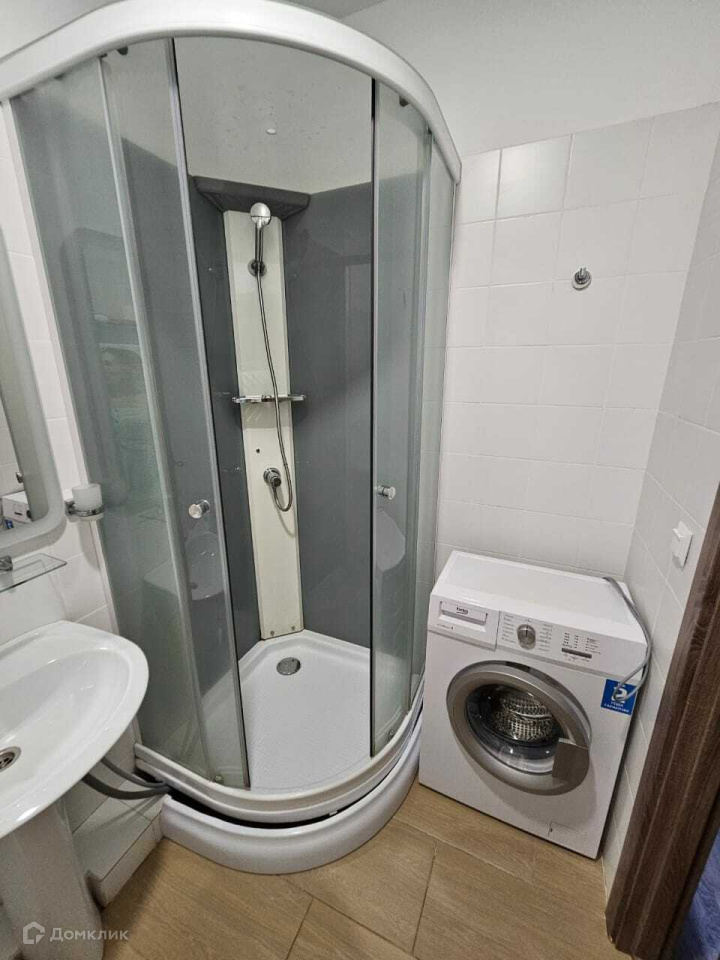 с установленной душевой кабиной и стиральной машиной, а также блоком