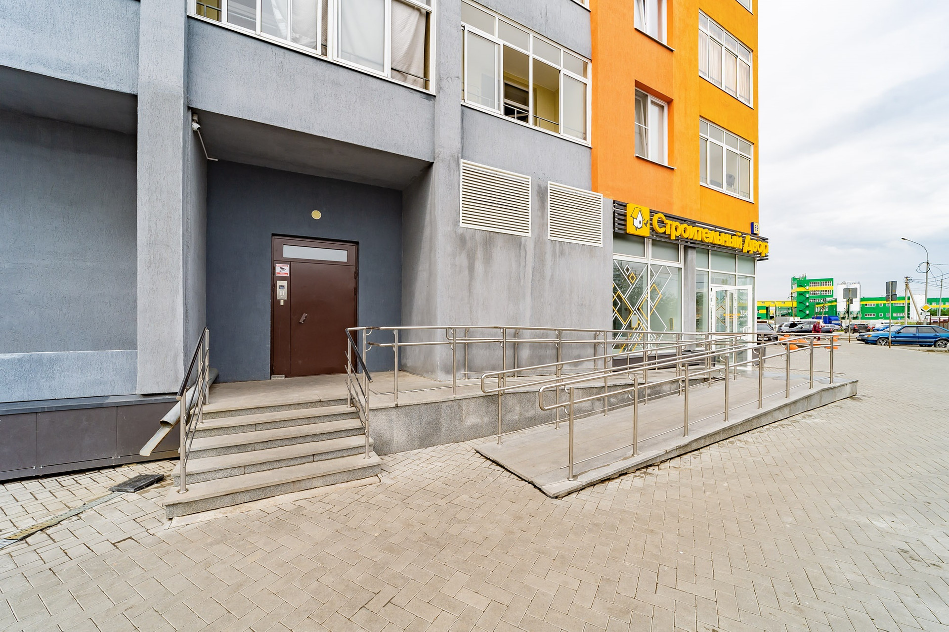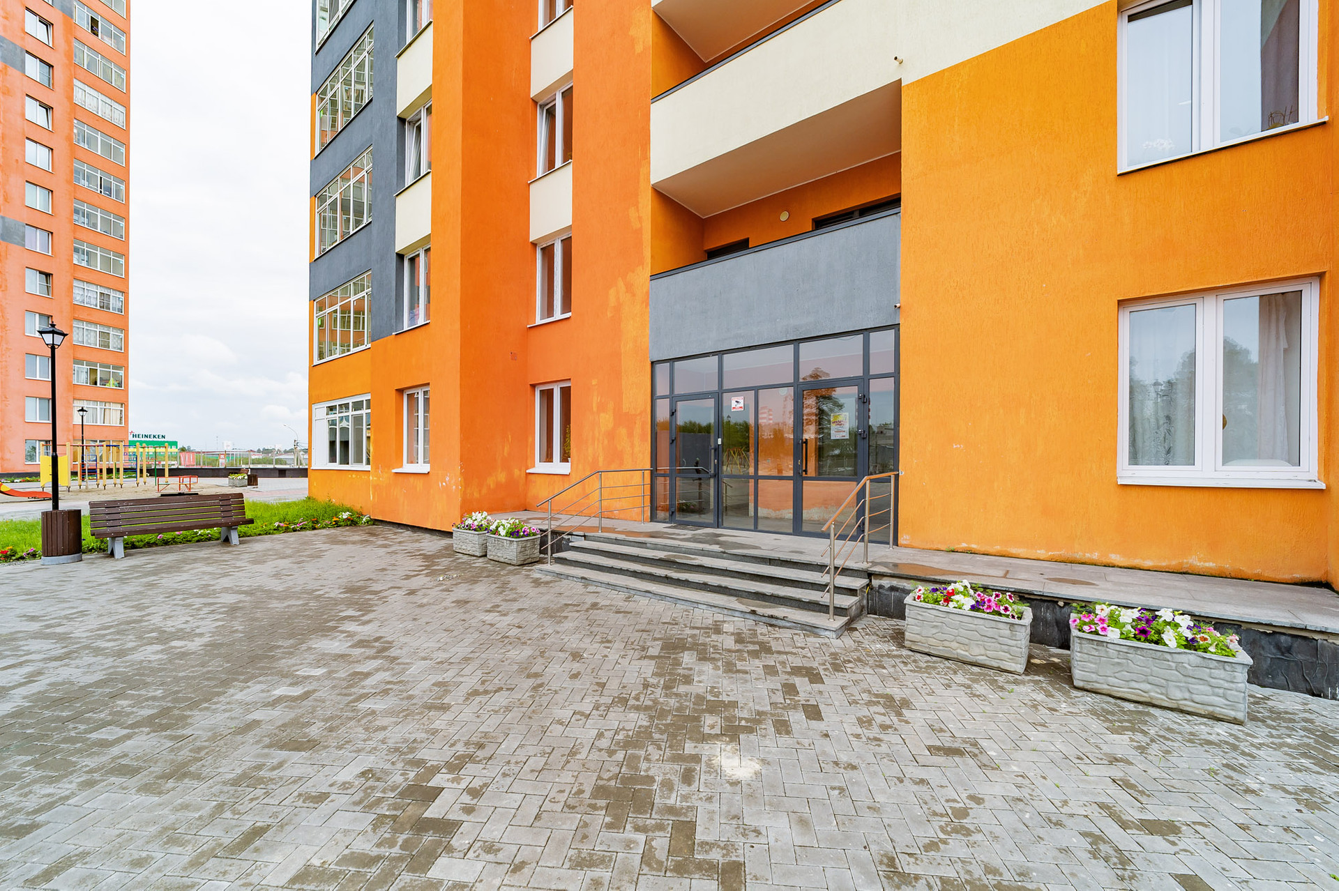 Дом стоит на стилобате, что закрывает двор естественным образом, без забора. На стилобате расположена детская площадка, выход на нее со второго этажа дома. В доме есть три лифта, подземный паркинг, колясочные.