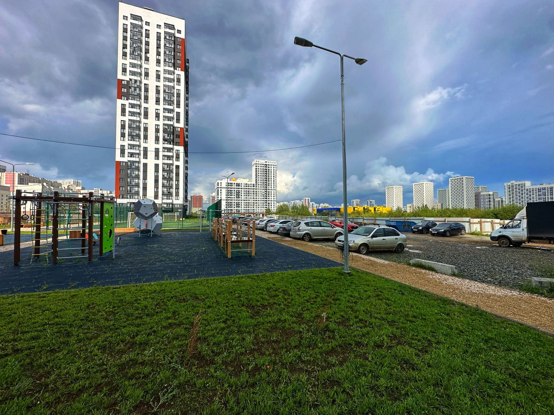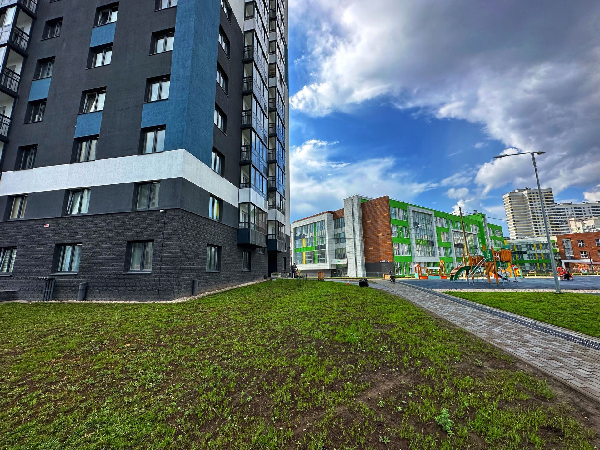 Во дворе детские и спортивные площадки.