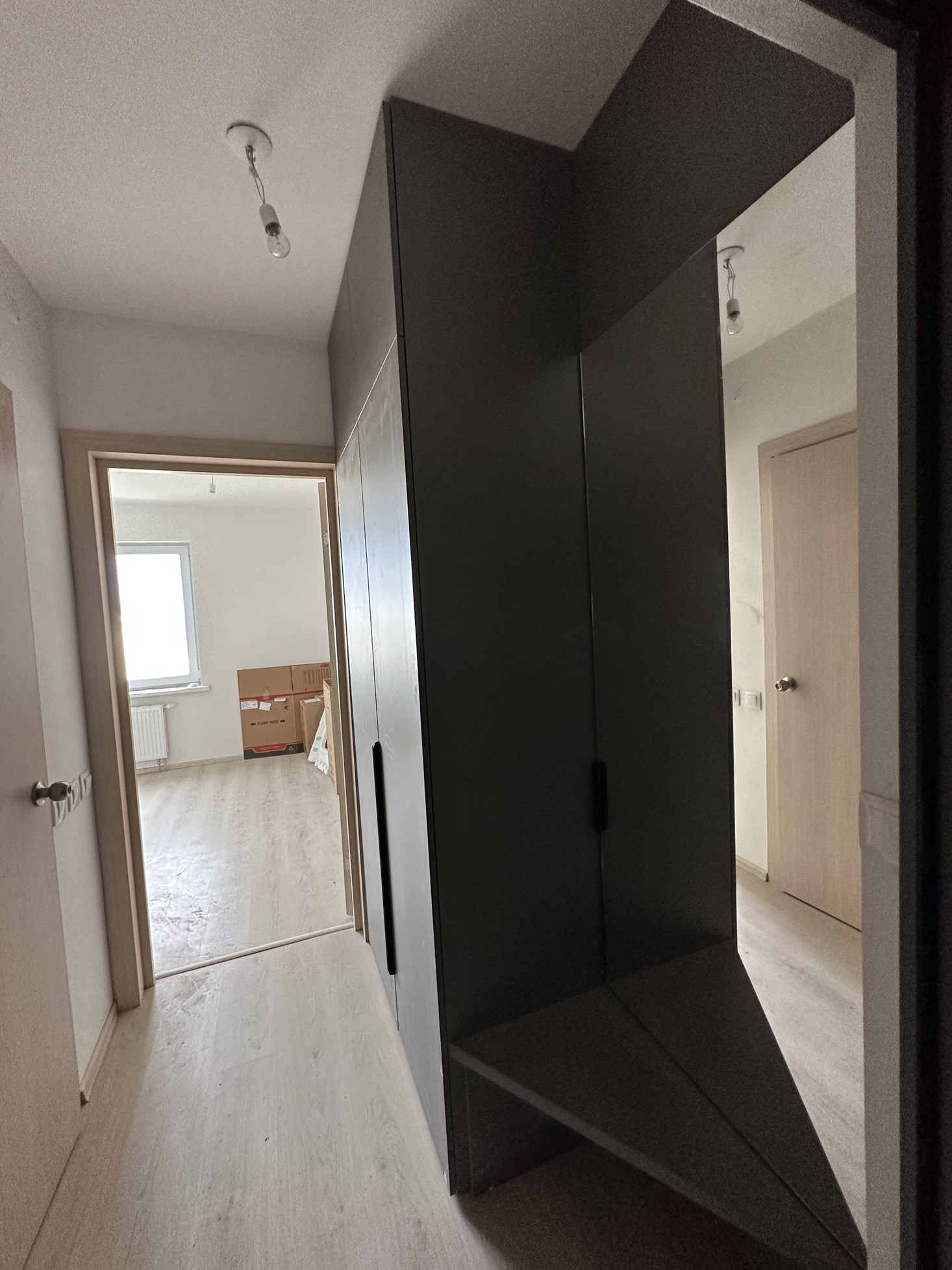 От застройщика сделана современная отделка. На полу ламинат, на стенах светлого тона обои - под данный дизайн была заказана встроенная мебель с учетом индивидуальных особенностей помещения, что создает ощущение большего пространства.