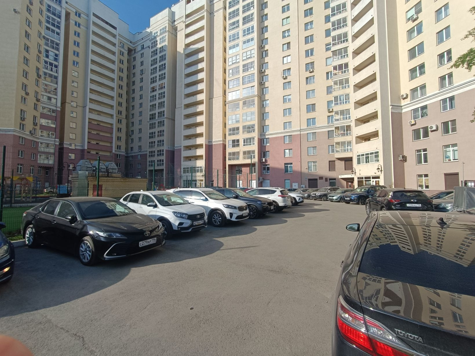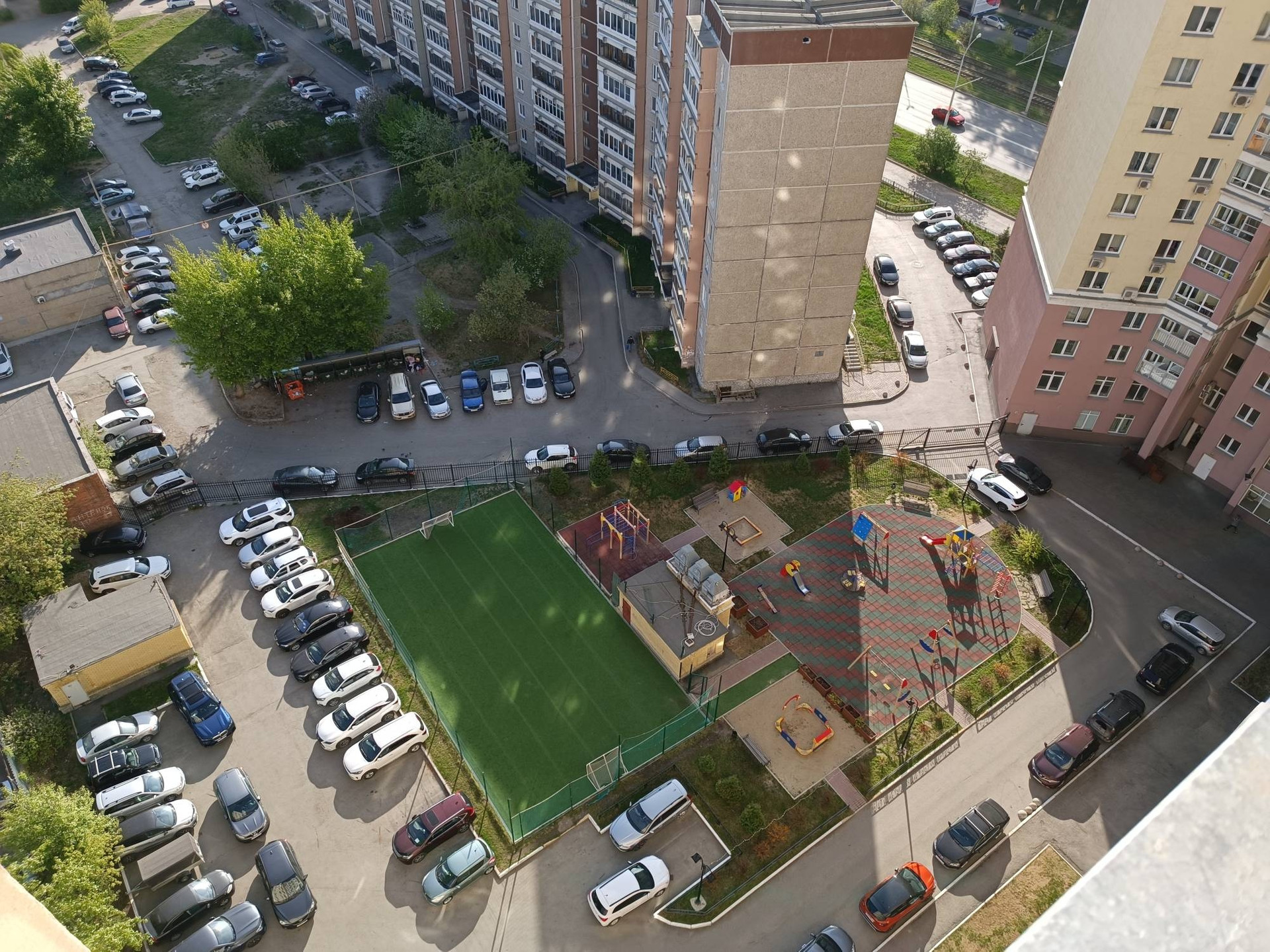 - Огороженный просторный зеленый двор.