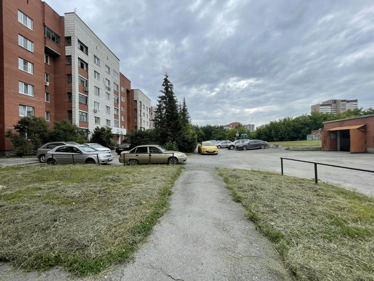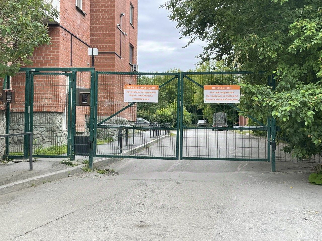 Большая зеленая, огороженная территория у дома, с детской площадкой и с парковочными