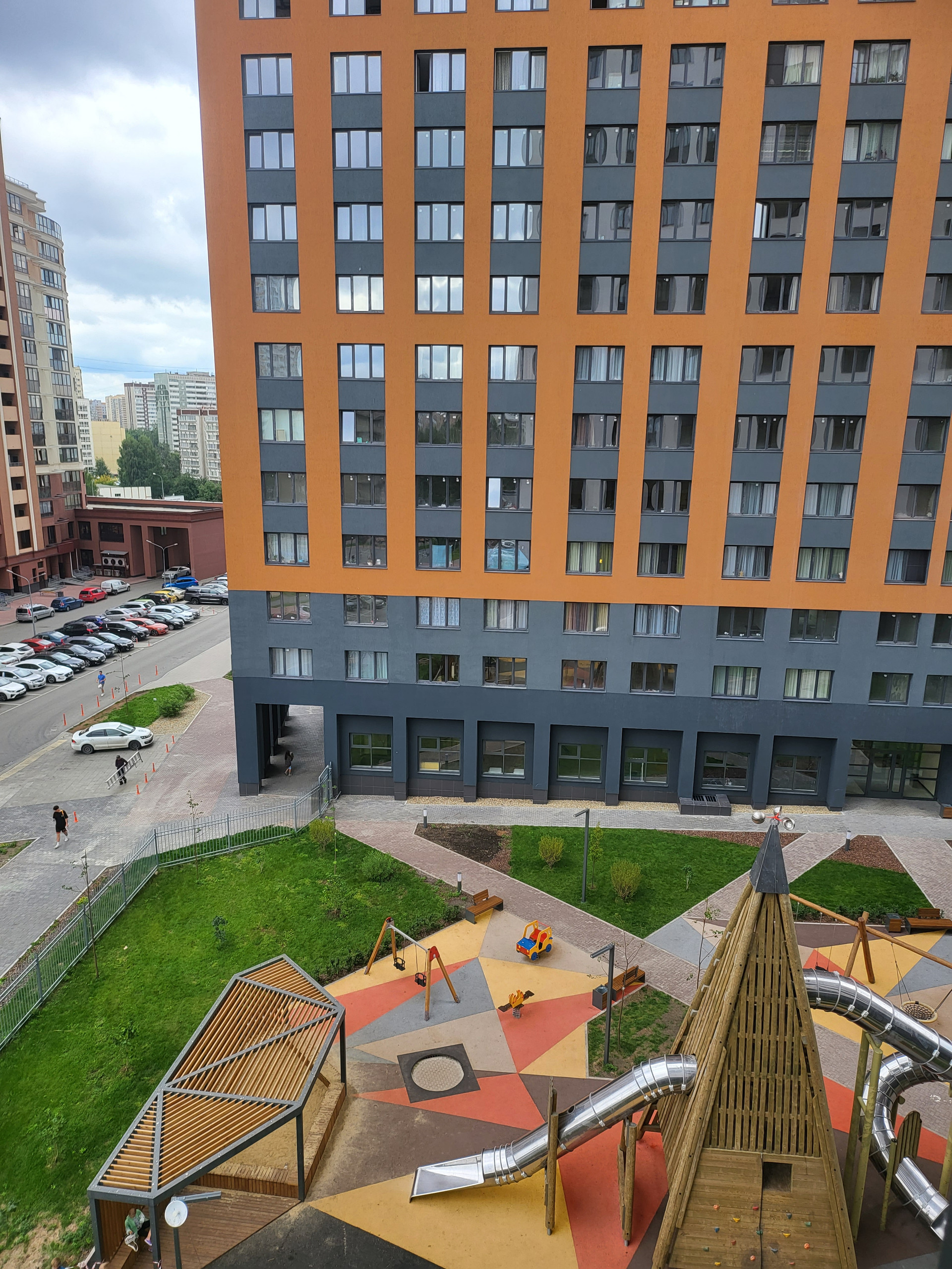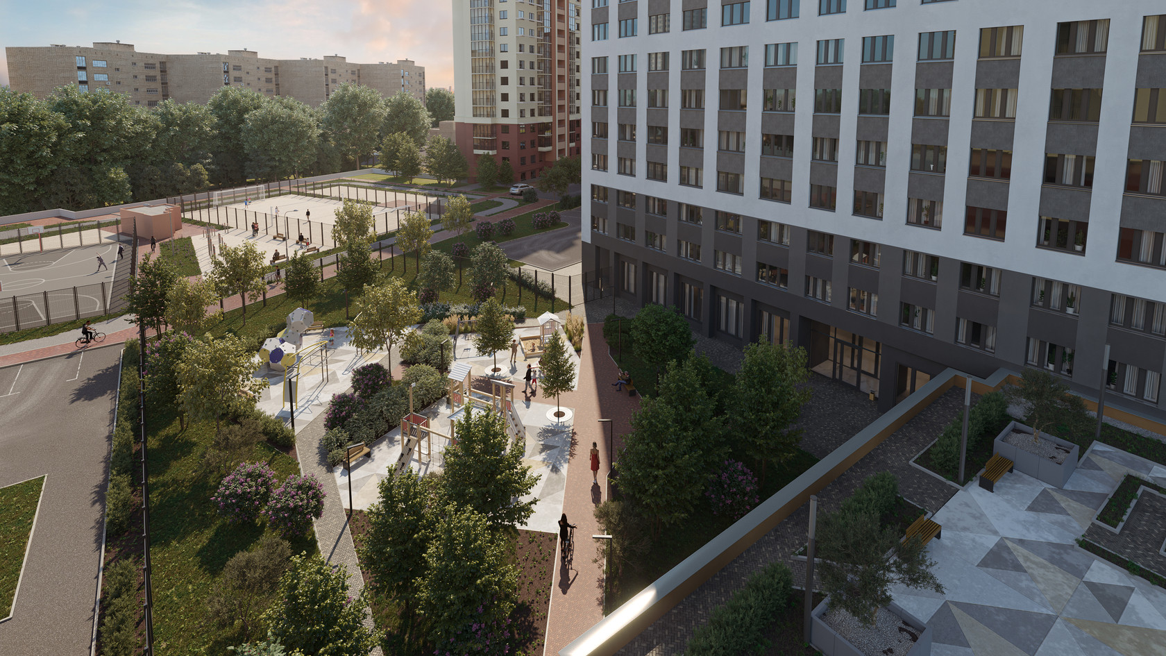Закрытый двор, с детскими и спортивными площадками, места для прогулок и тихого отдыха. Для детей установлены качели, карусели, игровые комплексы, батут, теневой навес и гамак.