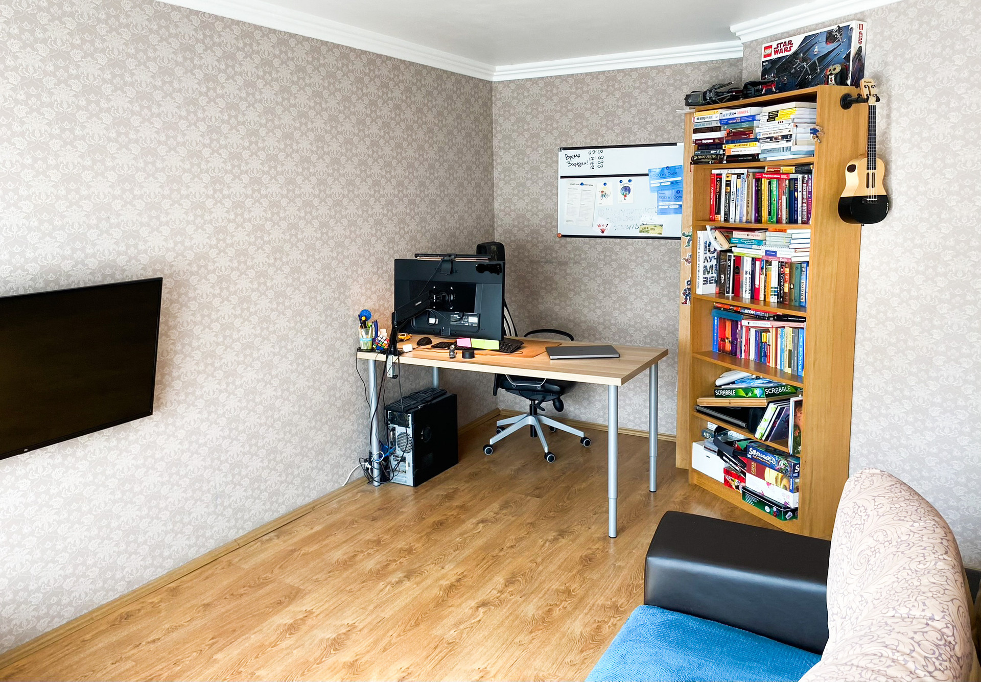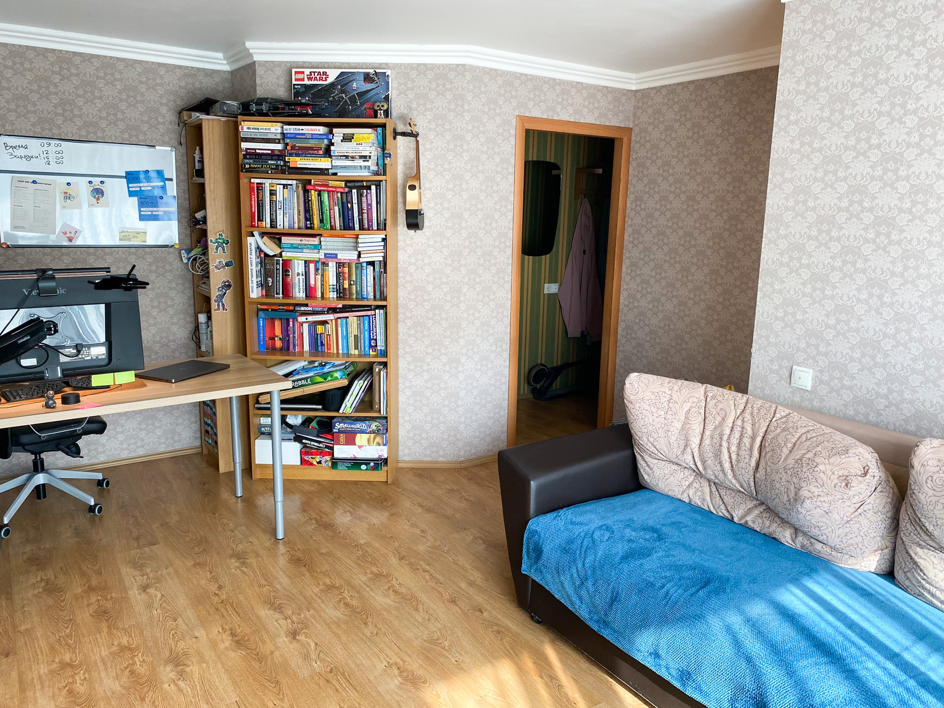 В гостиной остается мебель: диван, пуф, стеллажи Ikea. В спальне большой встроенный шкаф - гардеробная. Кухня полностью укомплектована.