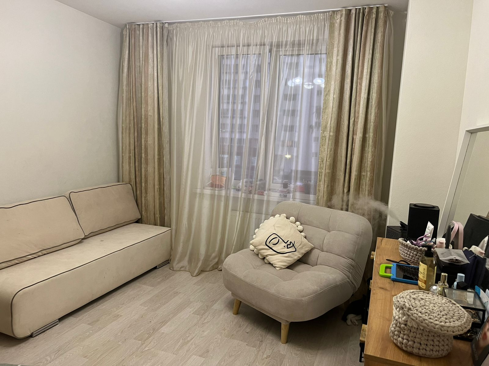 В квартире очень удобная планировка: кухня 10,4 кв.м., комната 14 кв.м., прихожая 6,5 кв.м. Окна Rehau выходят во двор. По всей квартире на полу ламинат, натяжной потолок. В любое время года в квартире тепло.