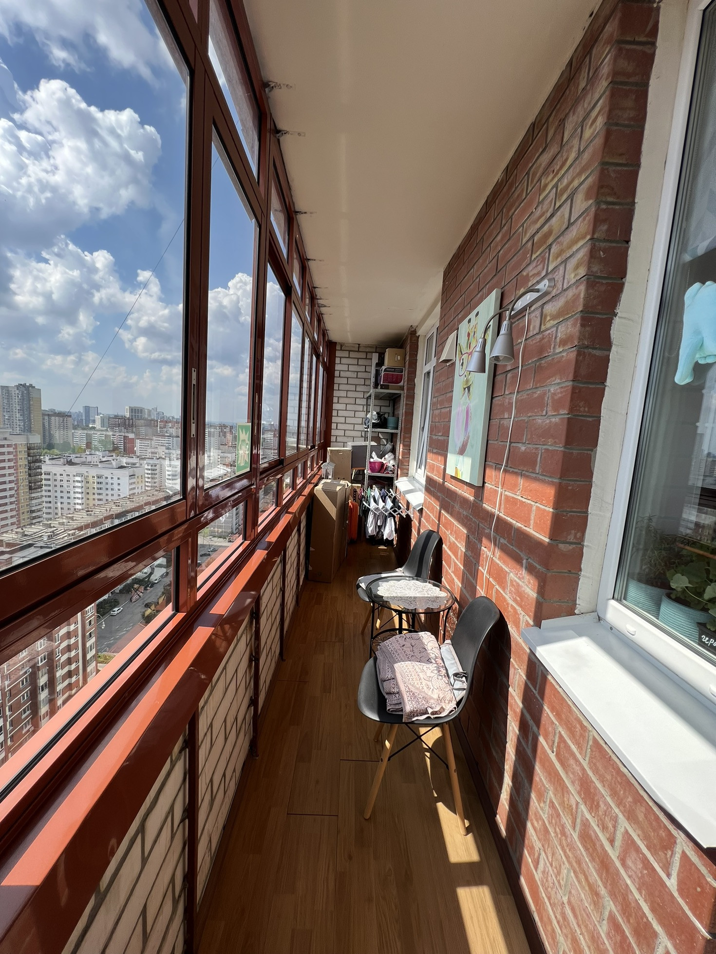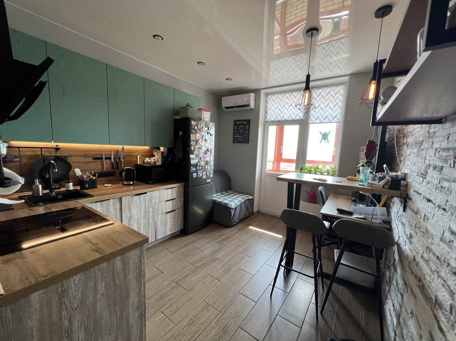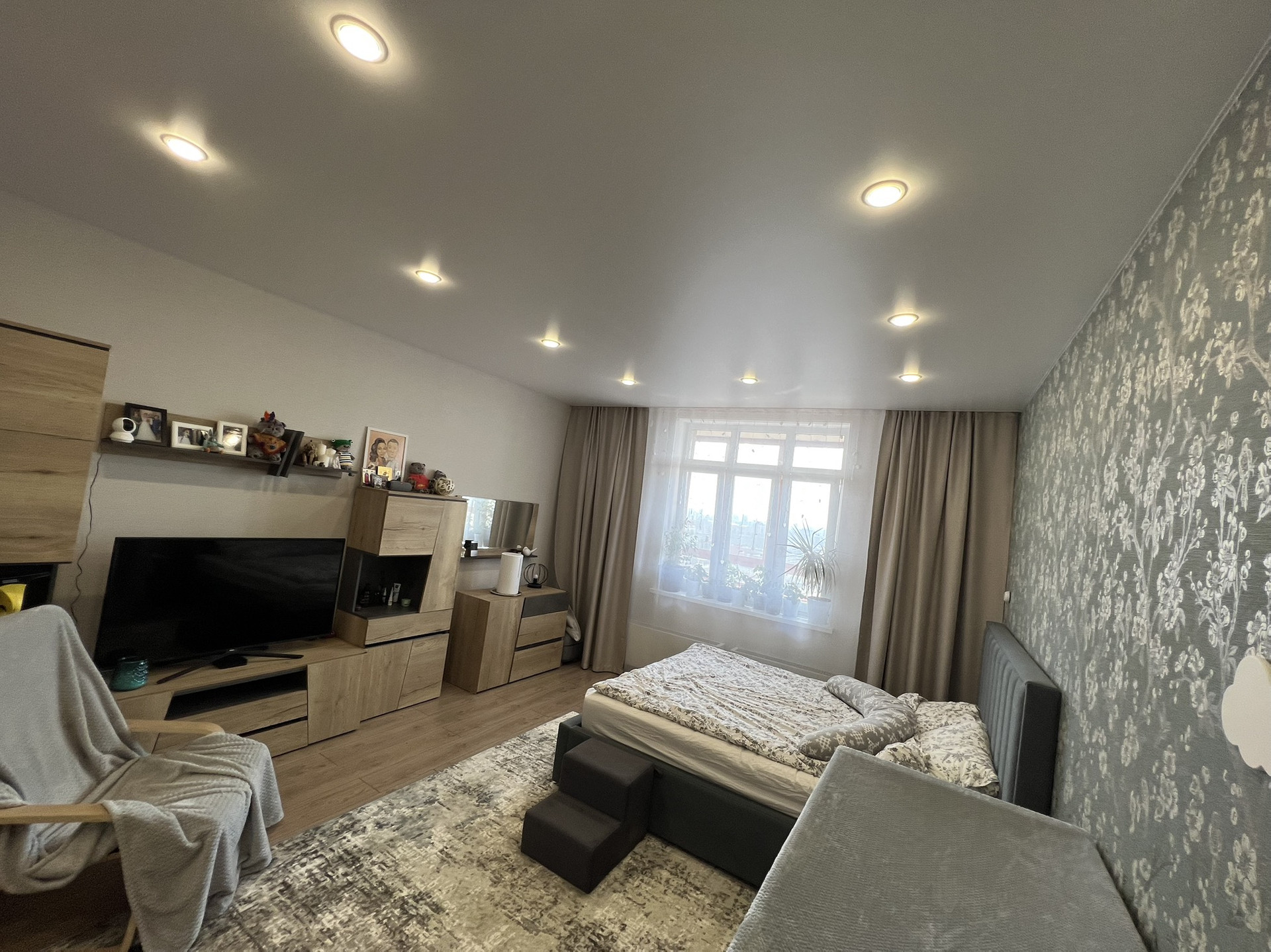 Продам превосходную однокомнатную квартиру с огромным балконом и шикарным видимо на город. Все окна выходят на южную сторону, в квартире есть шкаф купе - гардеробная 3 квм. Полы -  керамогранит (кроме комнаты), разводка отопления горизонтальная - тепло в -30 даже с выключенными батареями. По всей квартире натяжные потолки, в ванной ремонт сделан в марте месяце 2023 года (вся сантехника новая). На кухне отличный гарнитур с немецкой фурнитурой и встроенной техникой, так же установлен кондиционер.