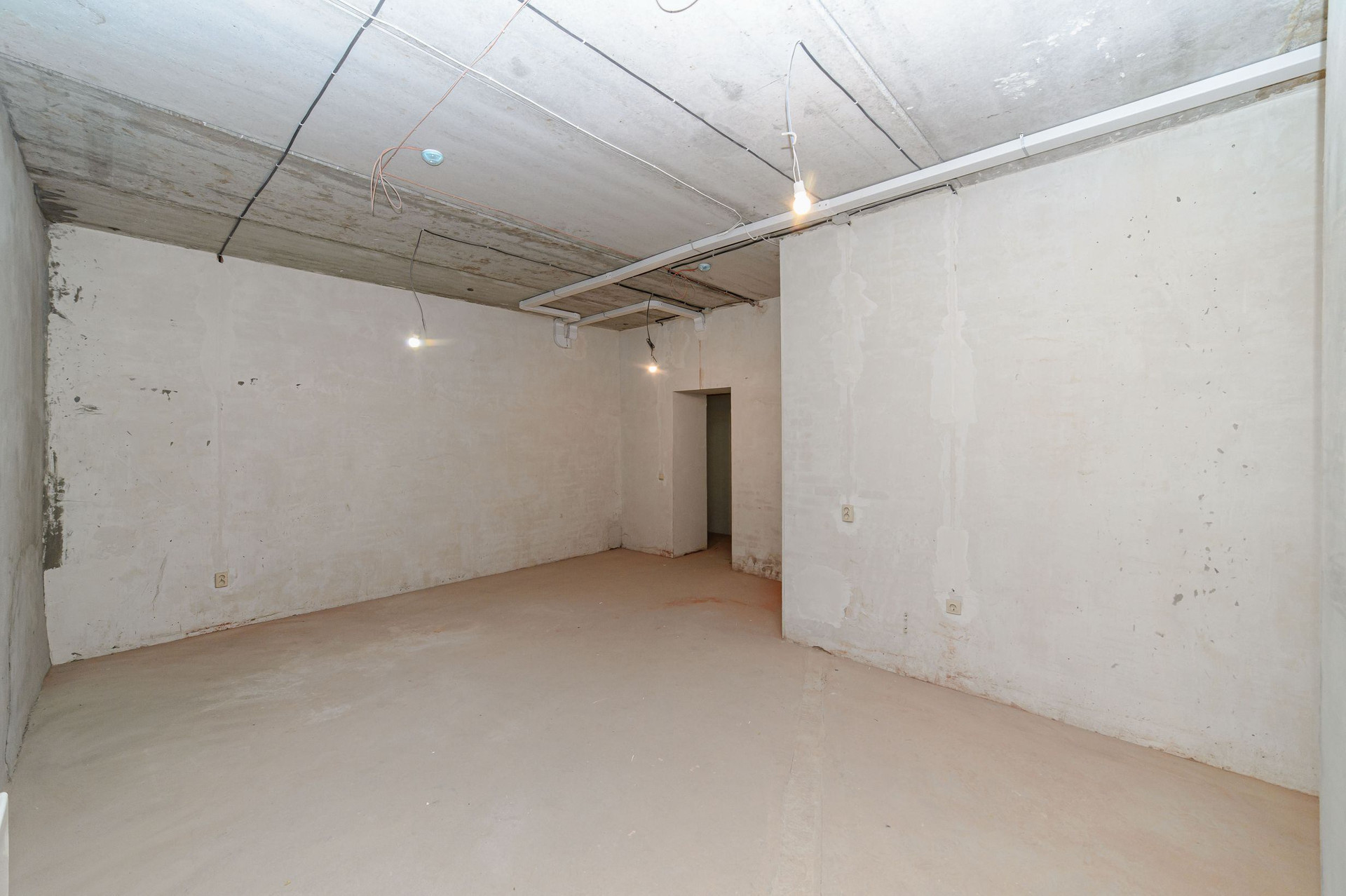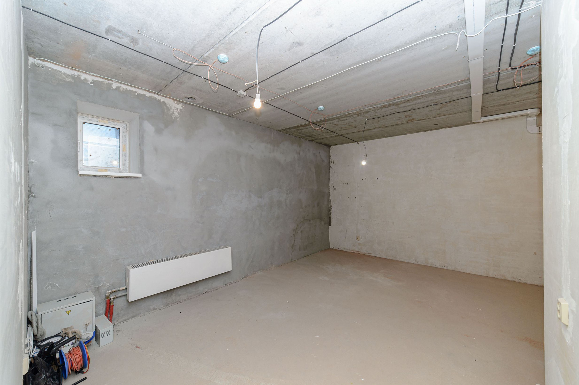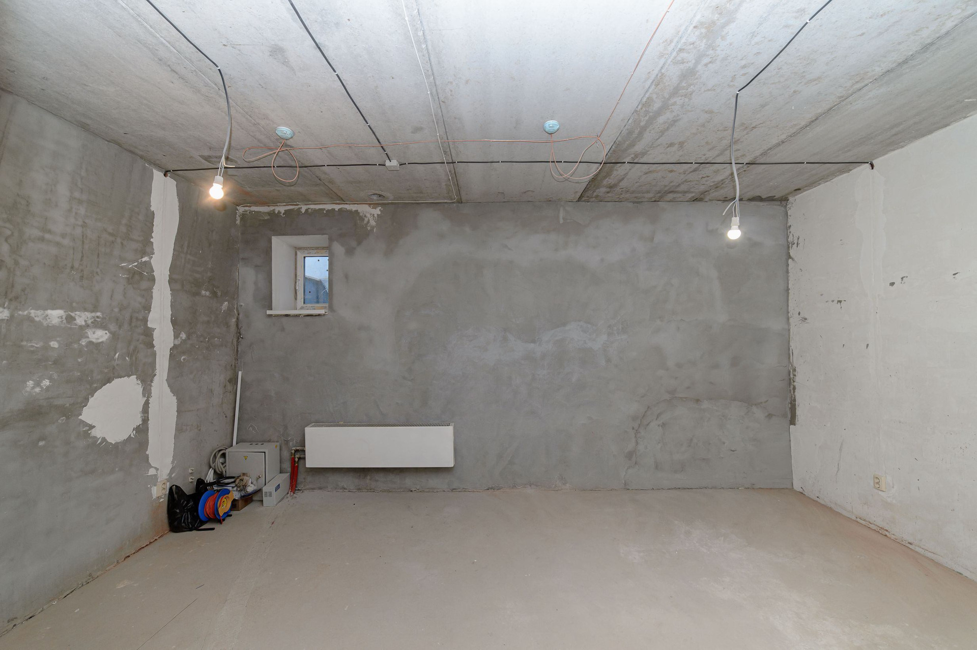 В студии сделана базовая подготовка под чистовую отделку. Все сети разведены горизонтально, под полом. Установлены розетки и выключатели.