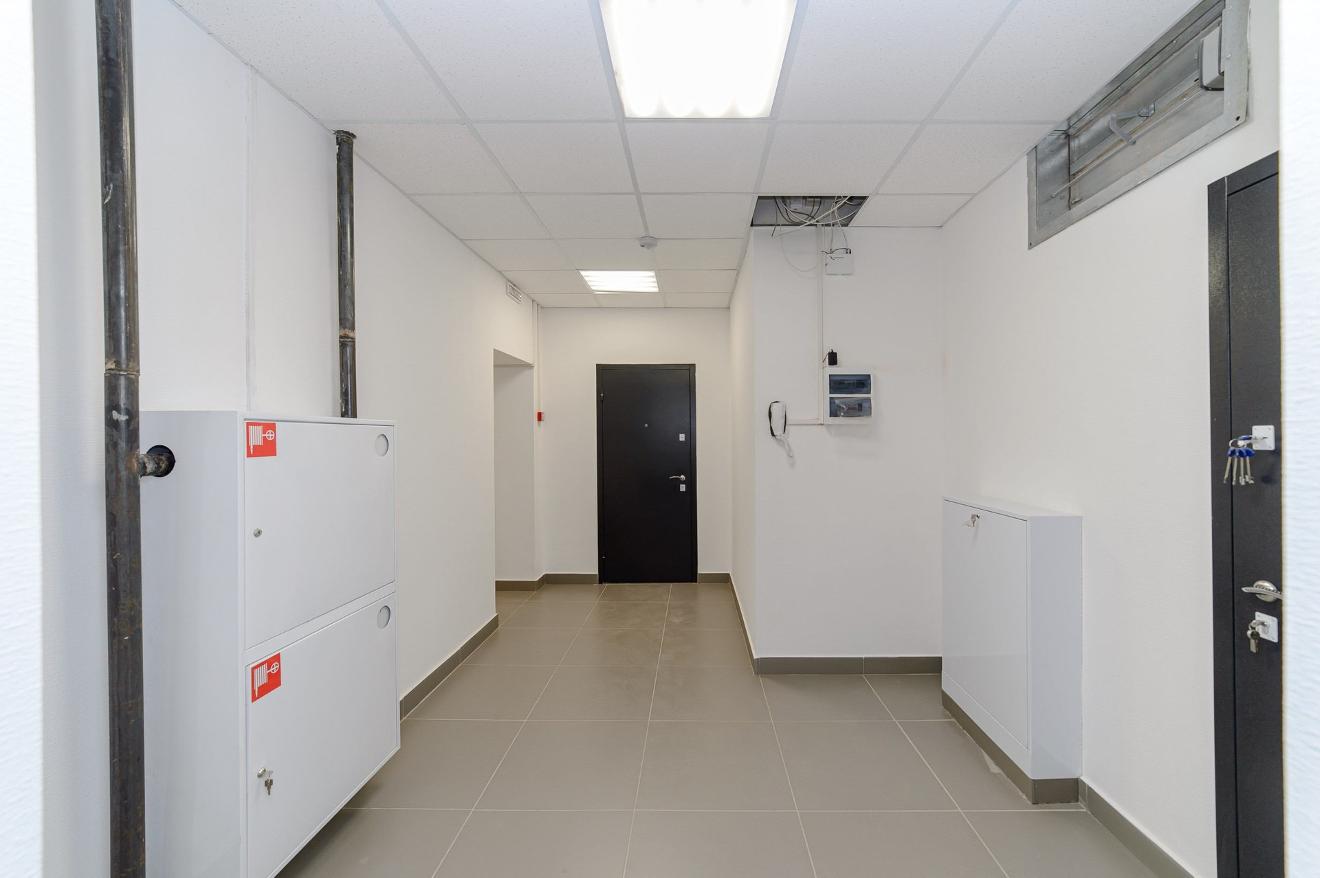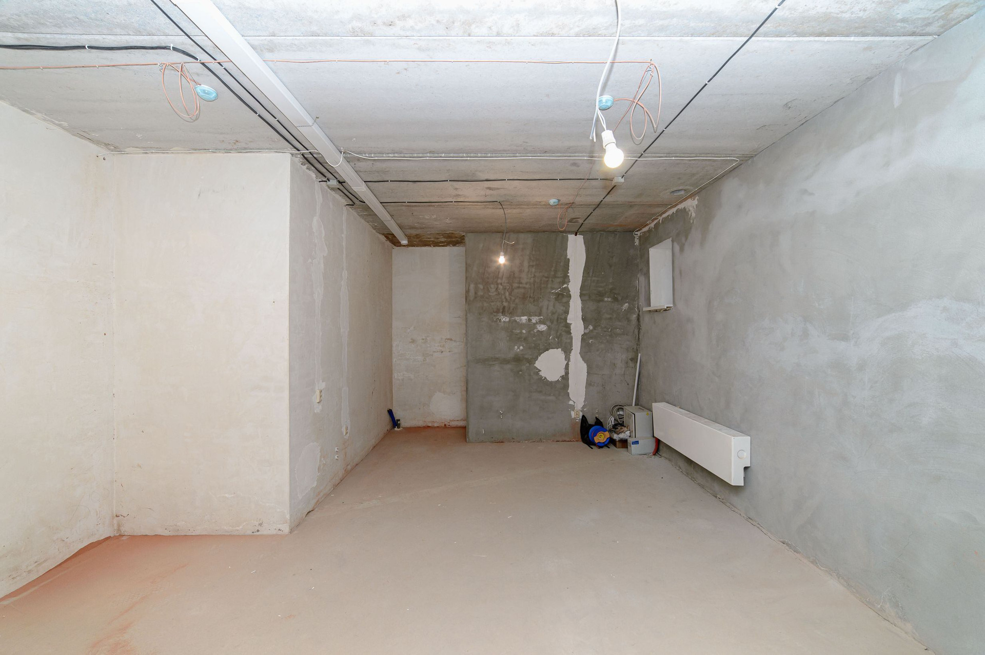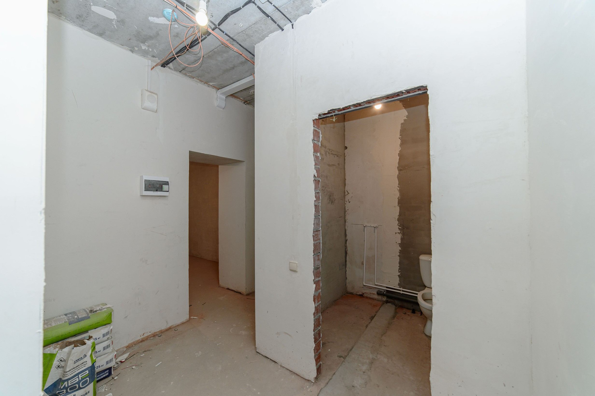 В студии сделана базовая подготовка под чистовую отделку. Все сети разведены горизонтально, под полом. Установлены розетки и выключатели.